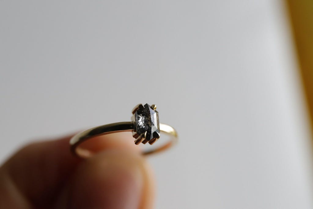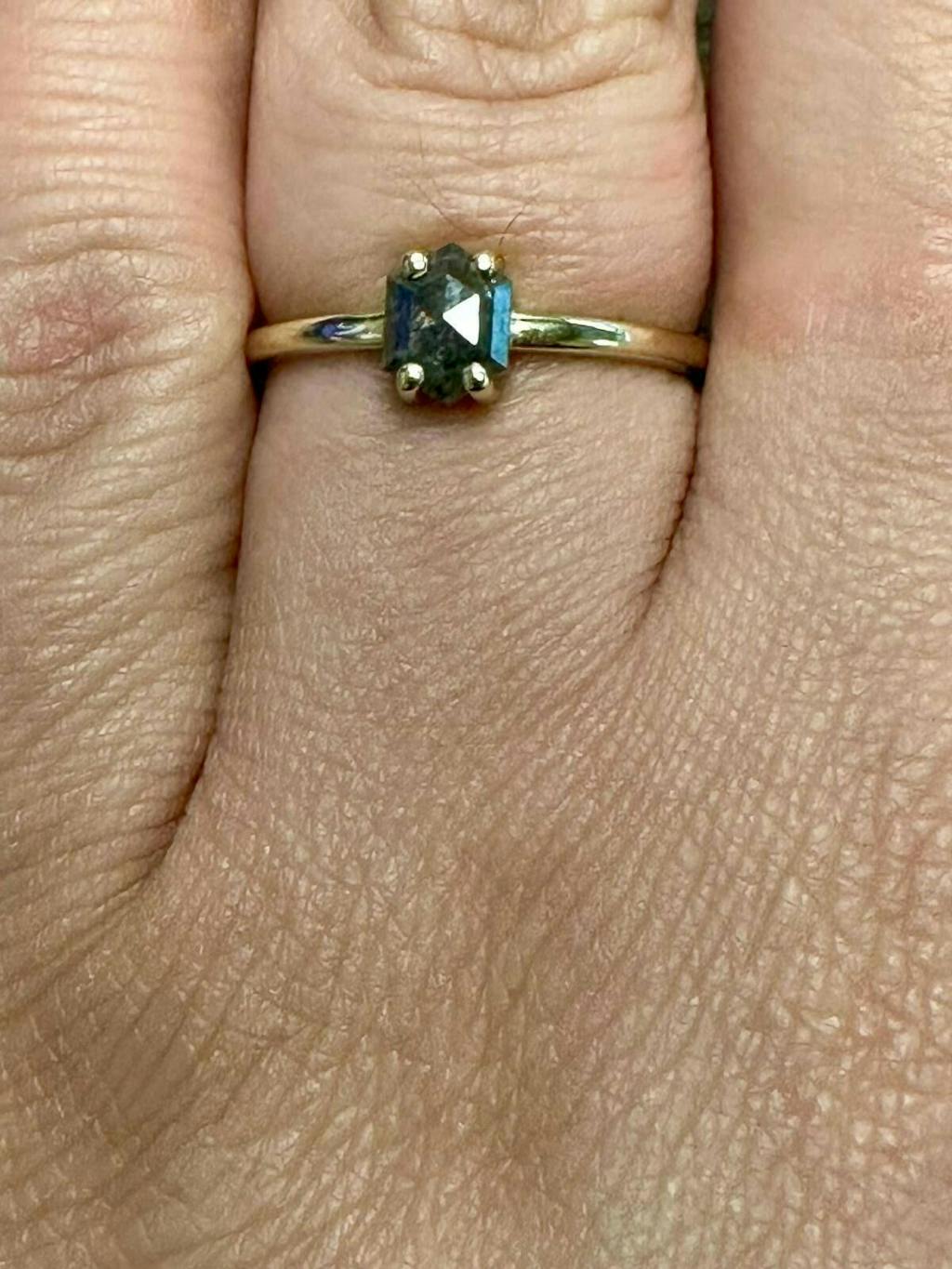 Raw Diamond, Salt and Pepper, Hexagon, Unique Engagement Ring, Rose Cut Geometric Diamond Ring, 14k Gold, Custom Handmade