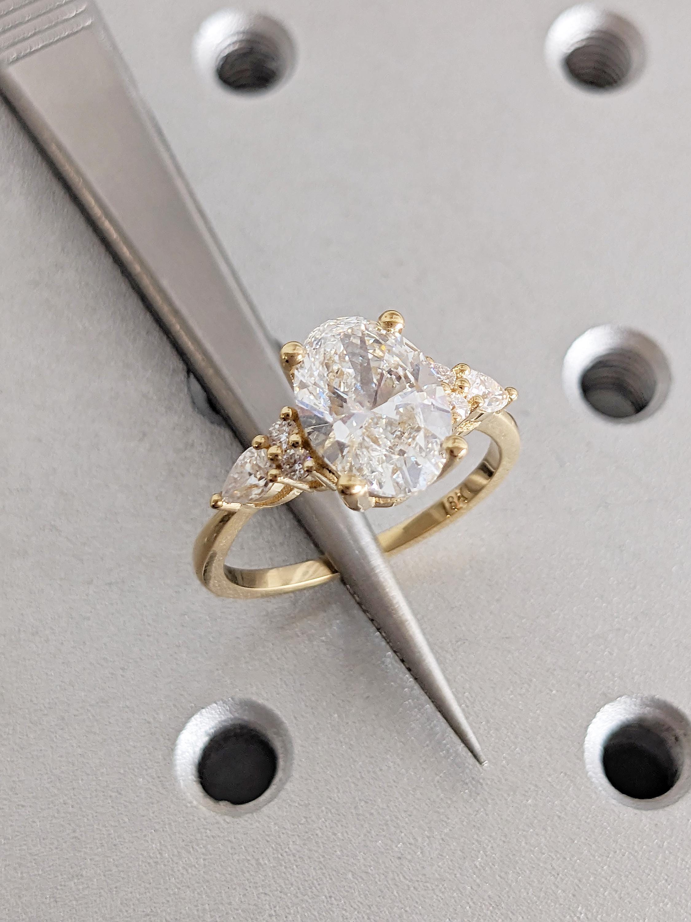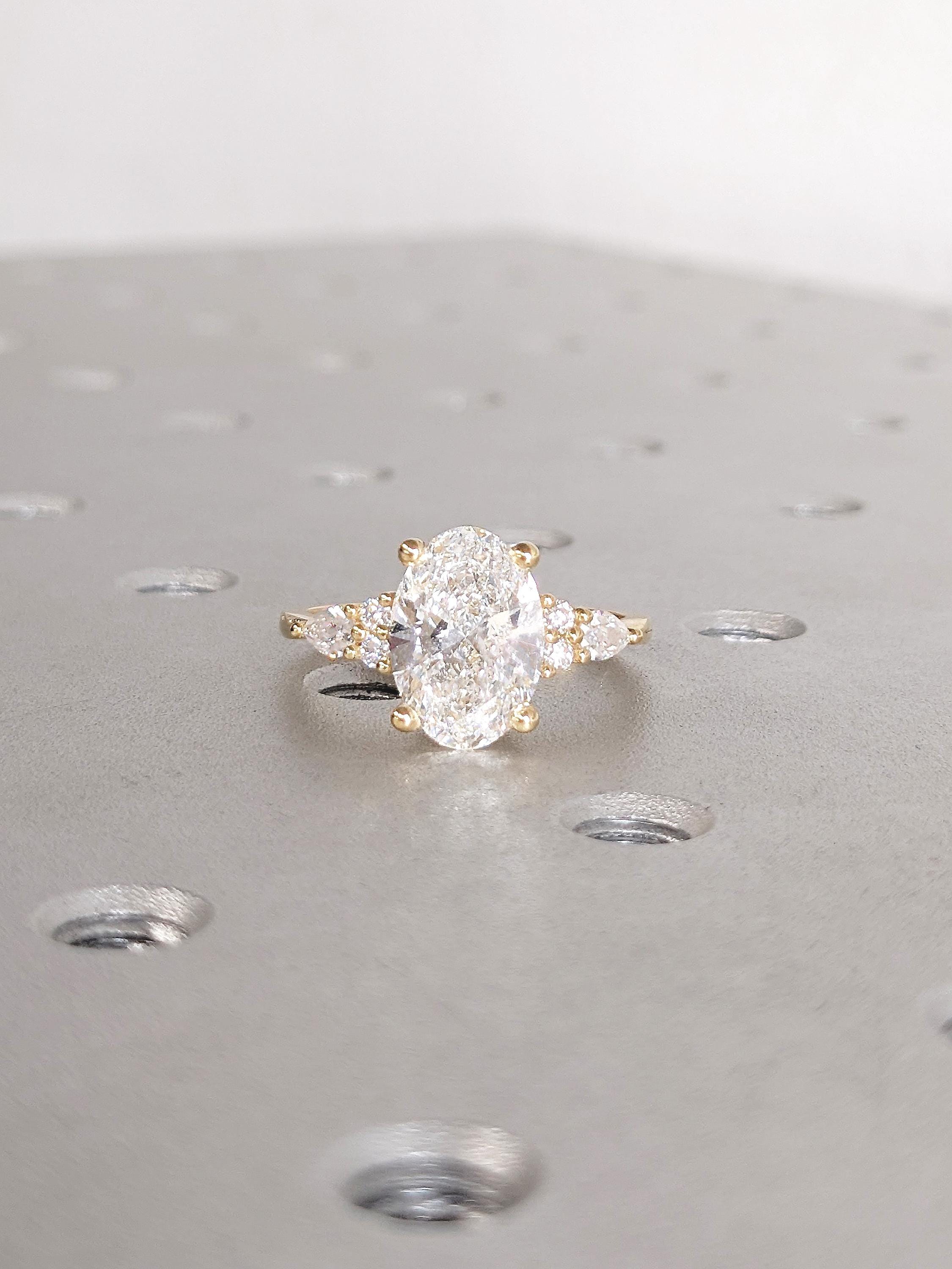 This ornate, vintage-inspired luxury ring features a prong center setting with oval shaped Moissanite, highlighted by prong set Natural Diamond, Lab Grown Diamond or Moissanite clusters on a delicate band. Can match with a unique curved stacking ring as a bridal set.