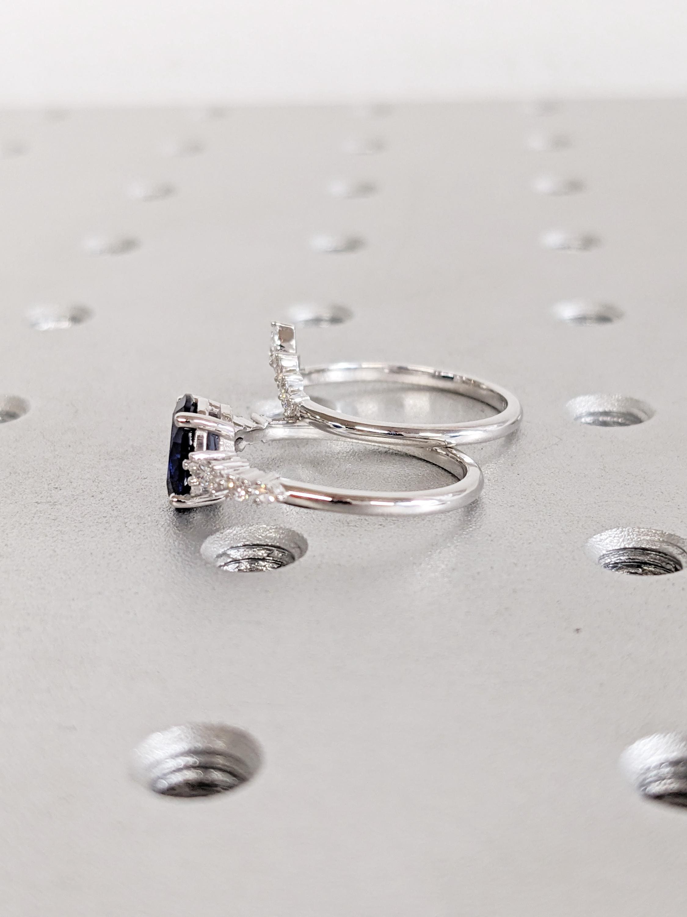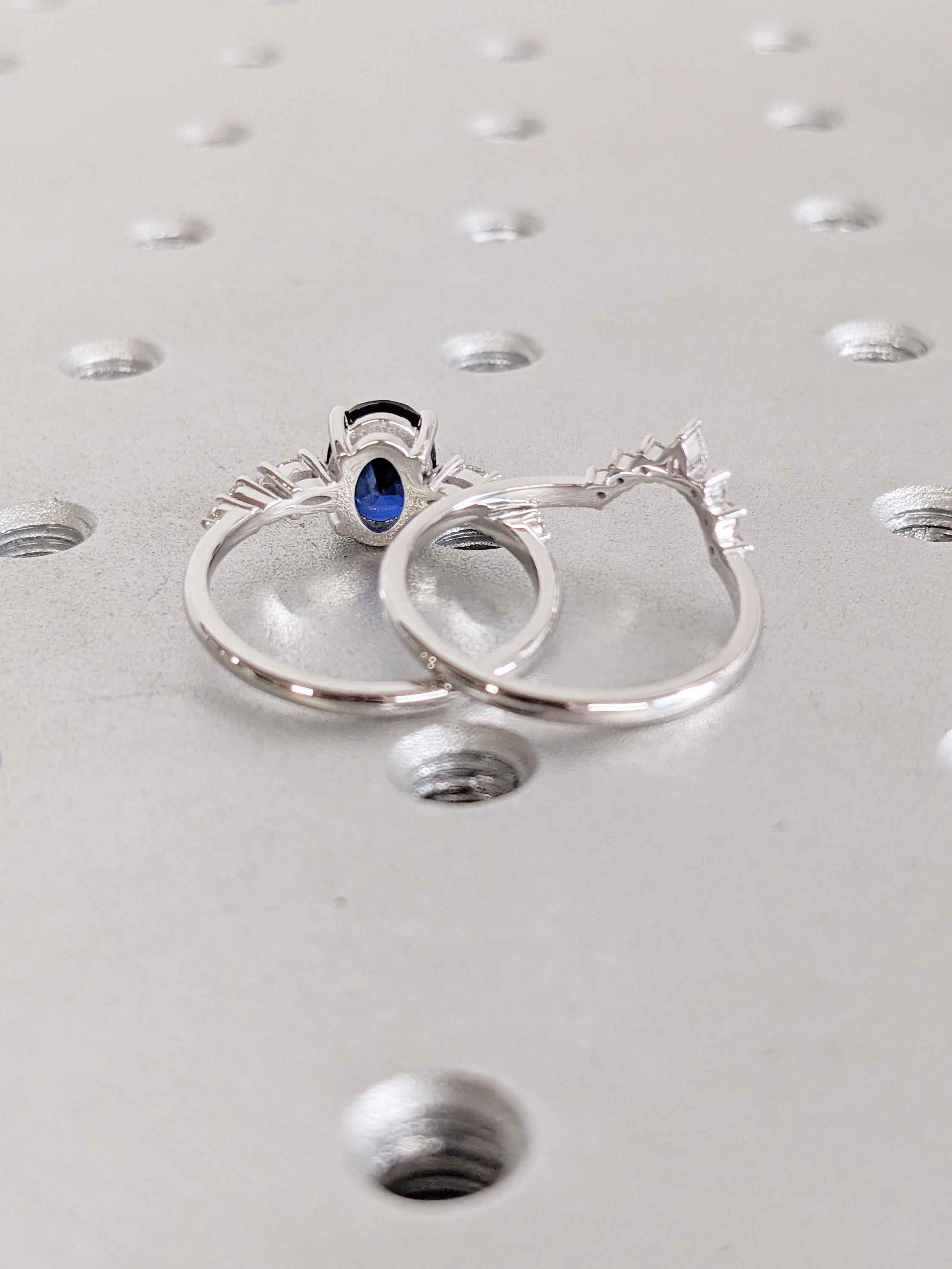 This Lab Sapphire Ring Set centers a rich blue oval Lab Sapphire in a prong setting, paired with marquise and round Moissanite side stones that add bright fire to the main ring. The matching band carries pear and round Moissanite side stones that curve smoothly around it, forming a beautifully balanced bridal set ideal for an engagement ring or meaningful anniversary gift.