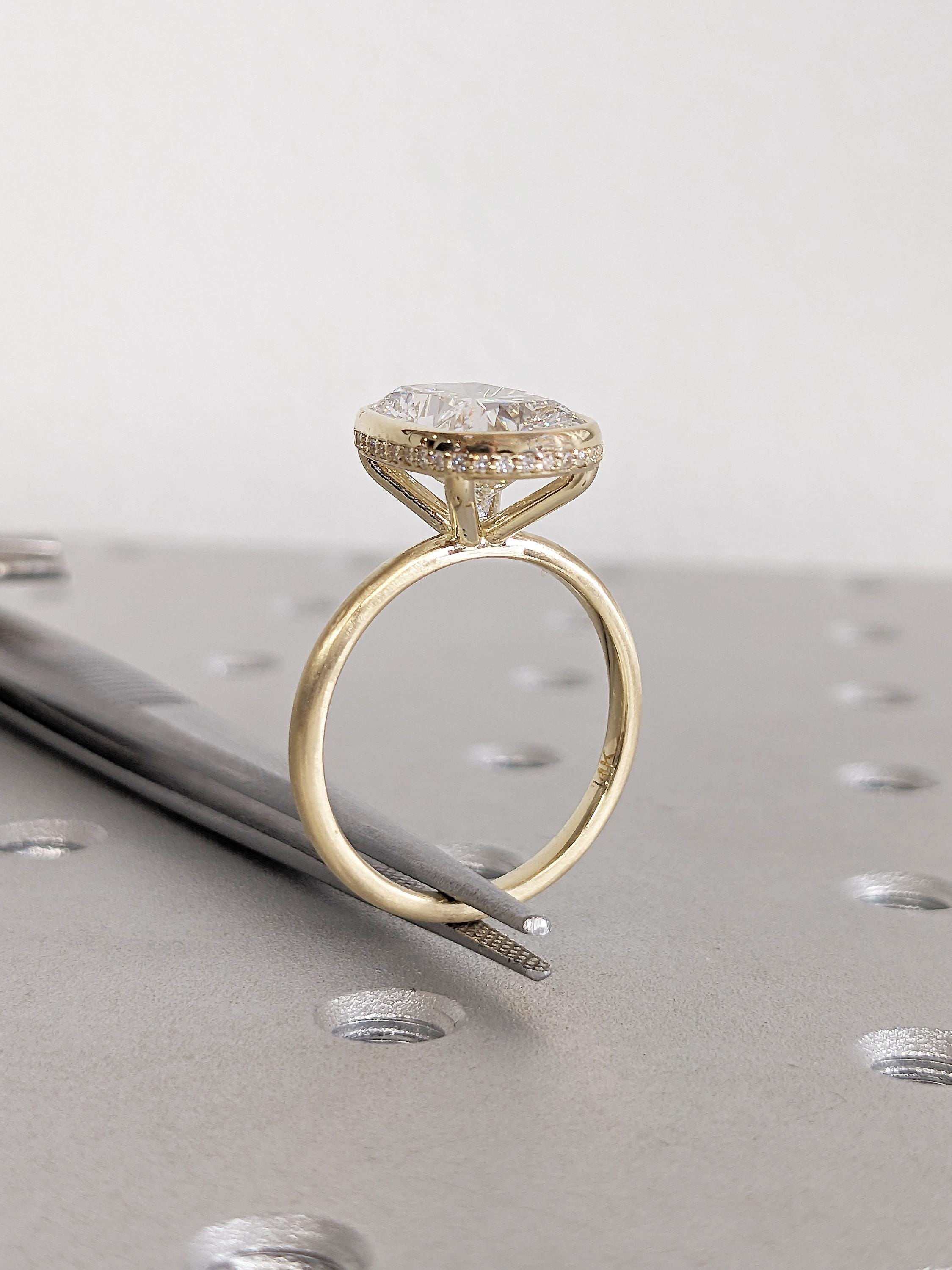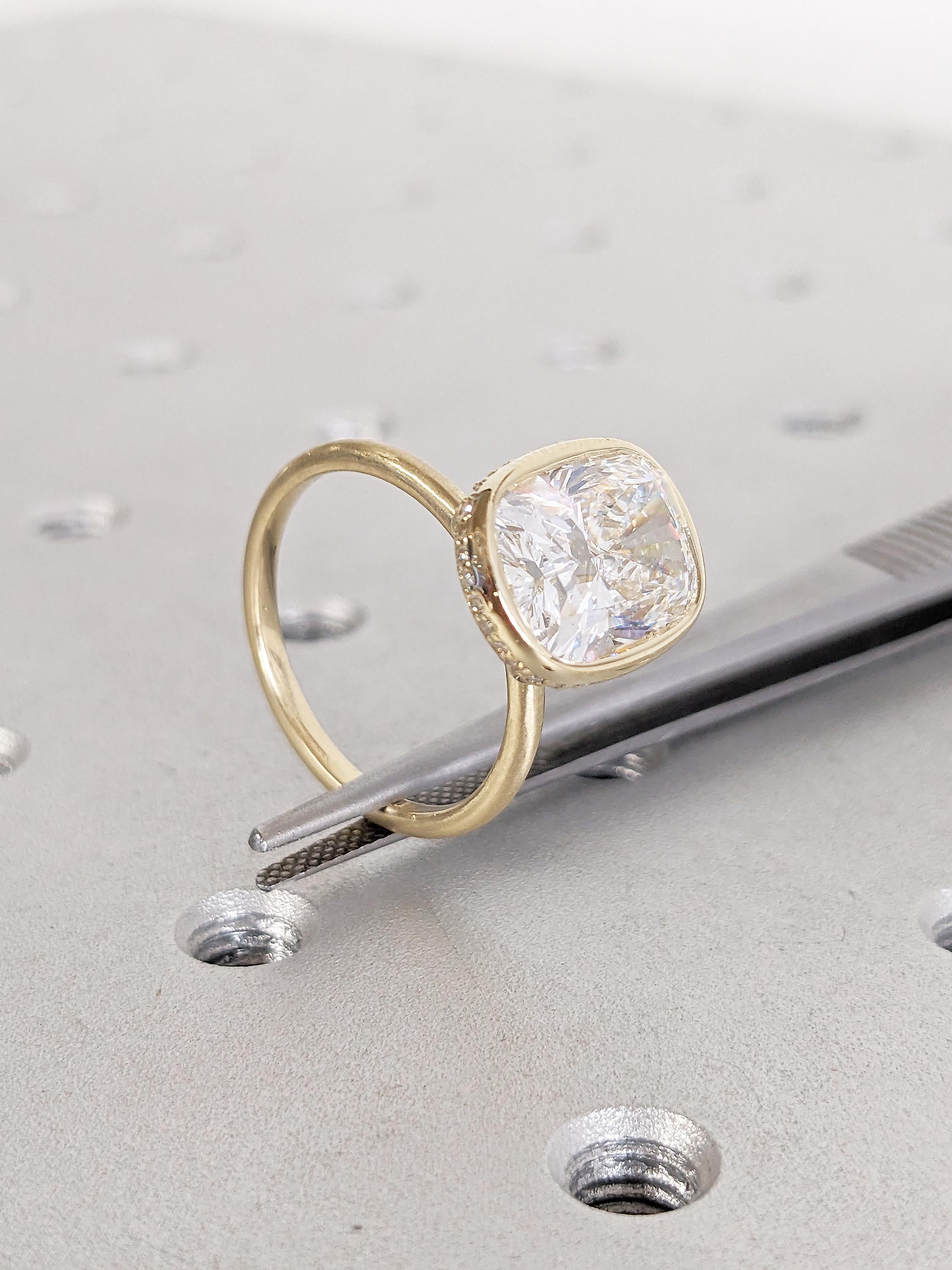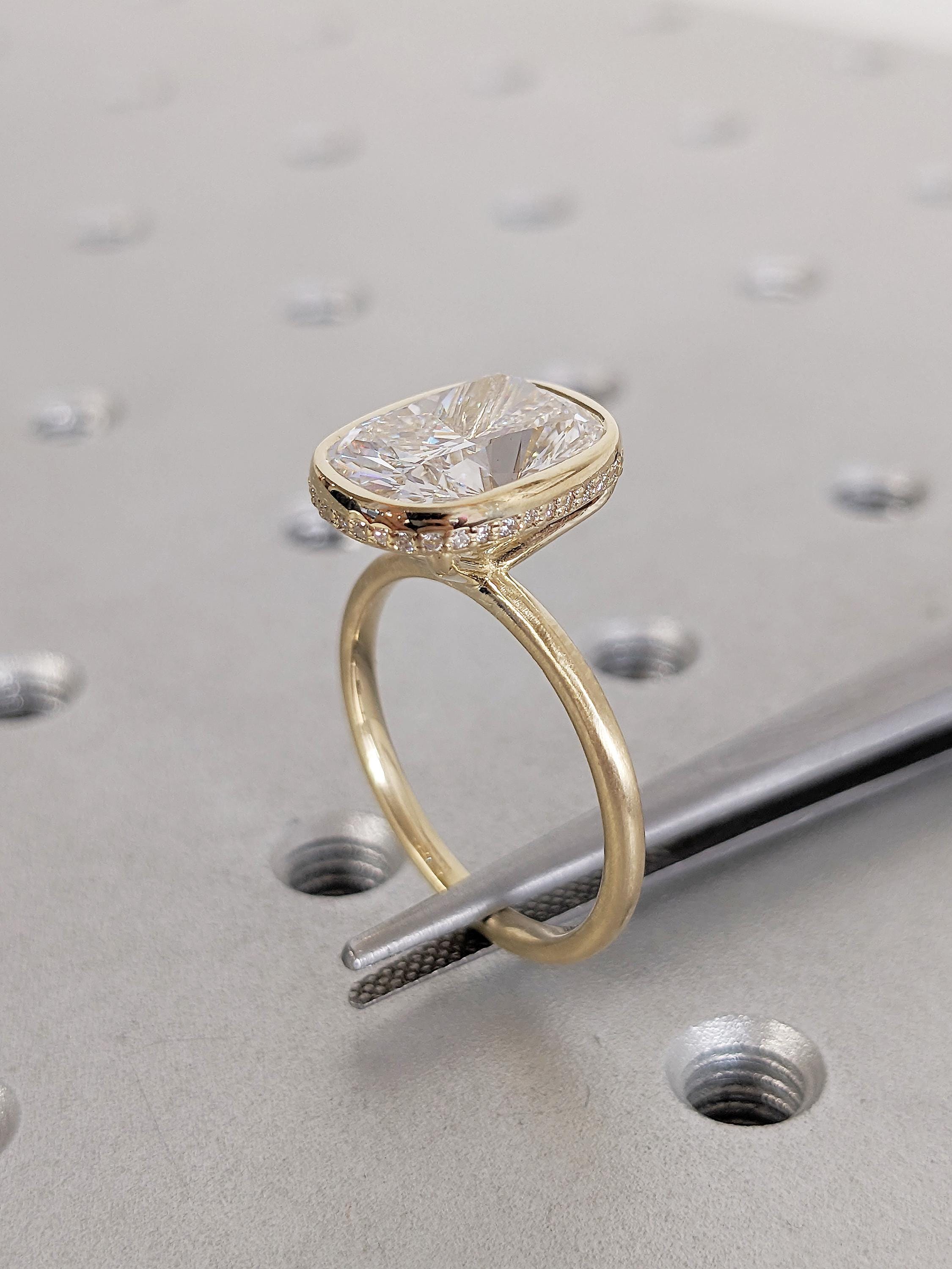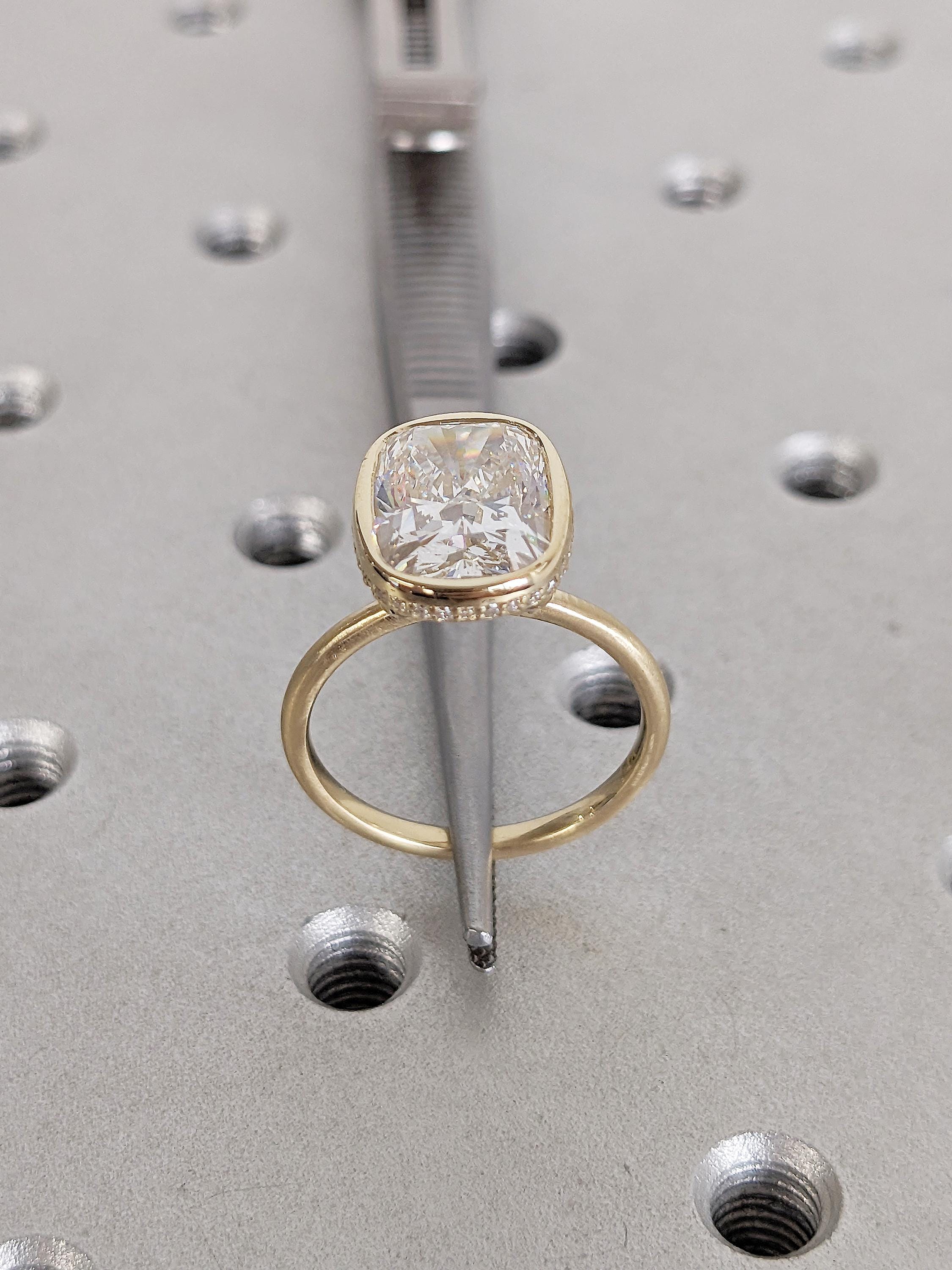 Elegant and timeless, this exquisite engagement ring features a captivating cushion-cut Moissanite in a sleek bezel setting, accented by a hidden halo of your choice of Natural Diamonds, Lab-Grown Diamonds, or Moissanites. Set on a delicate, rounded band, it pairs perfectly with a full eternity diamond band for a stunning bridal ensemble or makes a sophisticated statement when worn alone, effortlessly enhancing your chic, modern style.