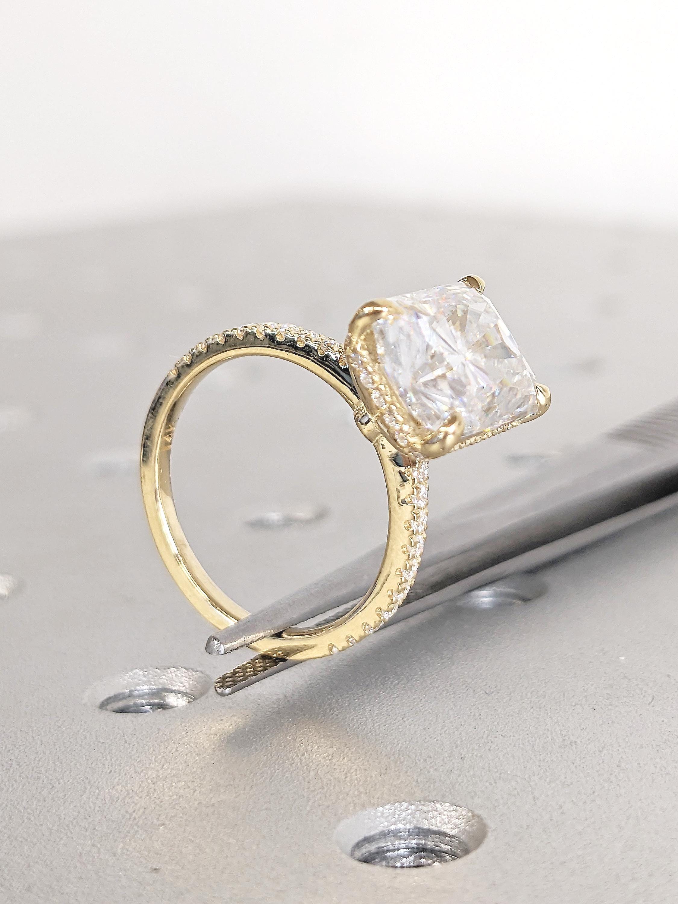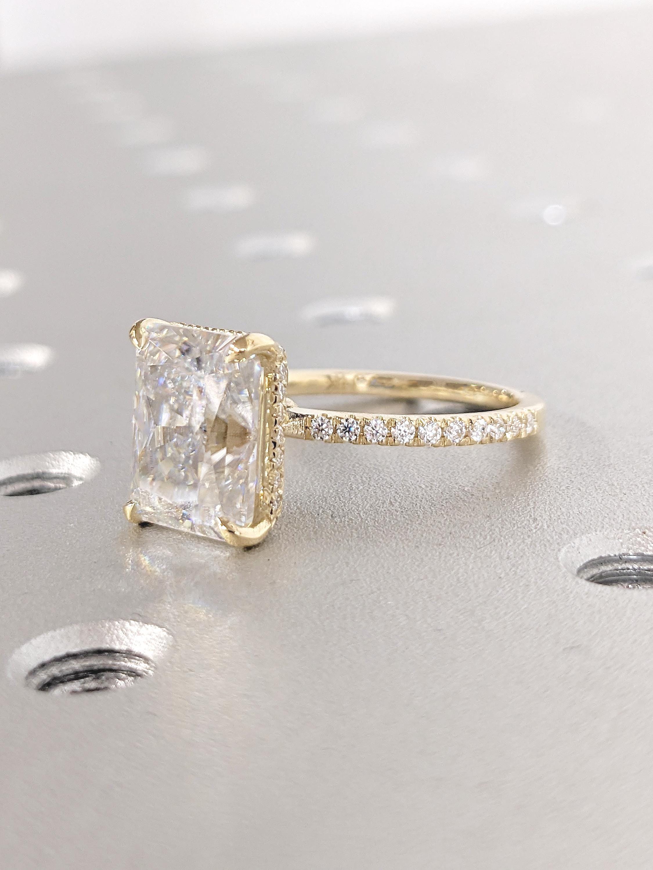 This radiant cut Moissanite engagement ring exudes timeless elegance, with the center stone set in a refined talon prong setting for a sleek, modern touch. A hidden halo of sparkling gems adds brilliance from every angle, while the half eternity band enhances the design with continuous shimmer. Both the hidden halo and half eternity accents are available in your choice of Natural Diamonds or Moissanite, making this ring a truly customizable symbol of love.