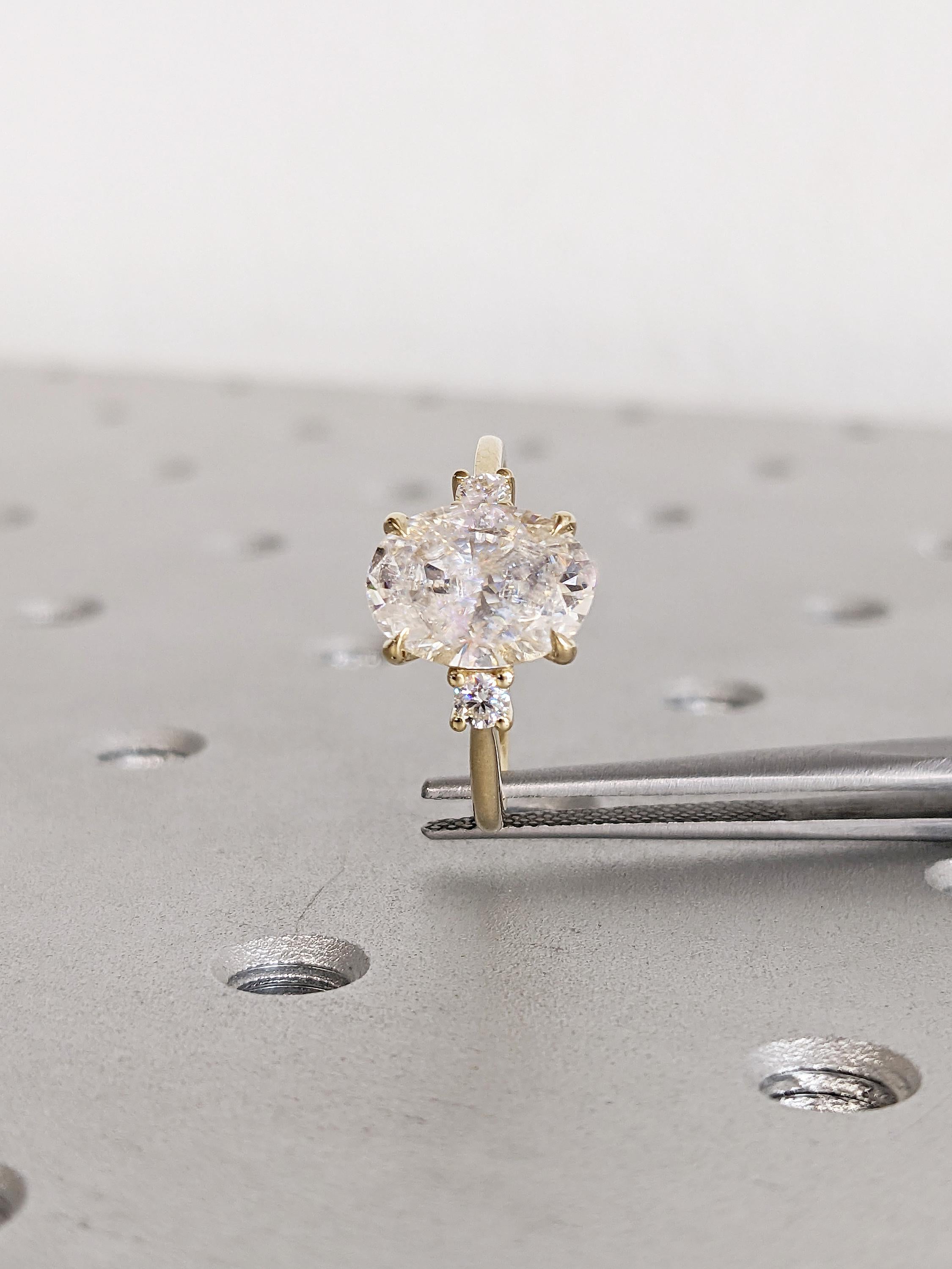 This stunning engagement ring features an oval cut Moissanite center stone, elegantly secured in a talon prong setting for a sleek and modern look. Flanking the center stone are two round accent gems, available in your choice of Natural Diamonds, Lab Grown Diamonds, or Moissanites, adding extra brilliance and depth. The thoughtfully crafted design balances timeless sophistication with contemporary elegance, making it a perfect symbol of your enduring love.