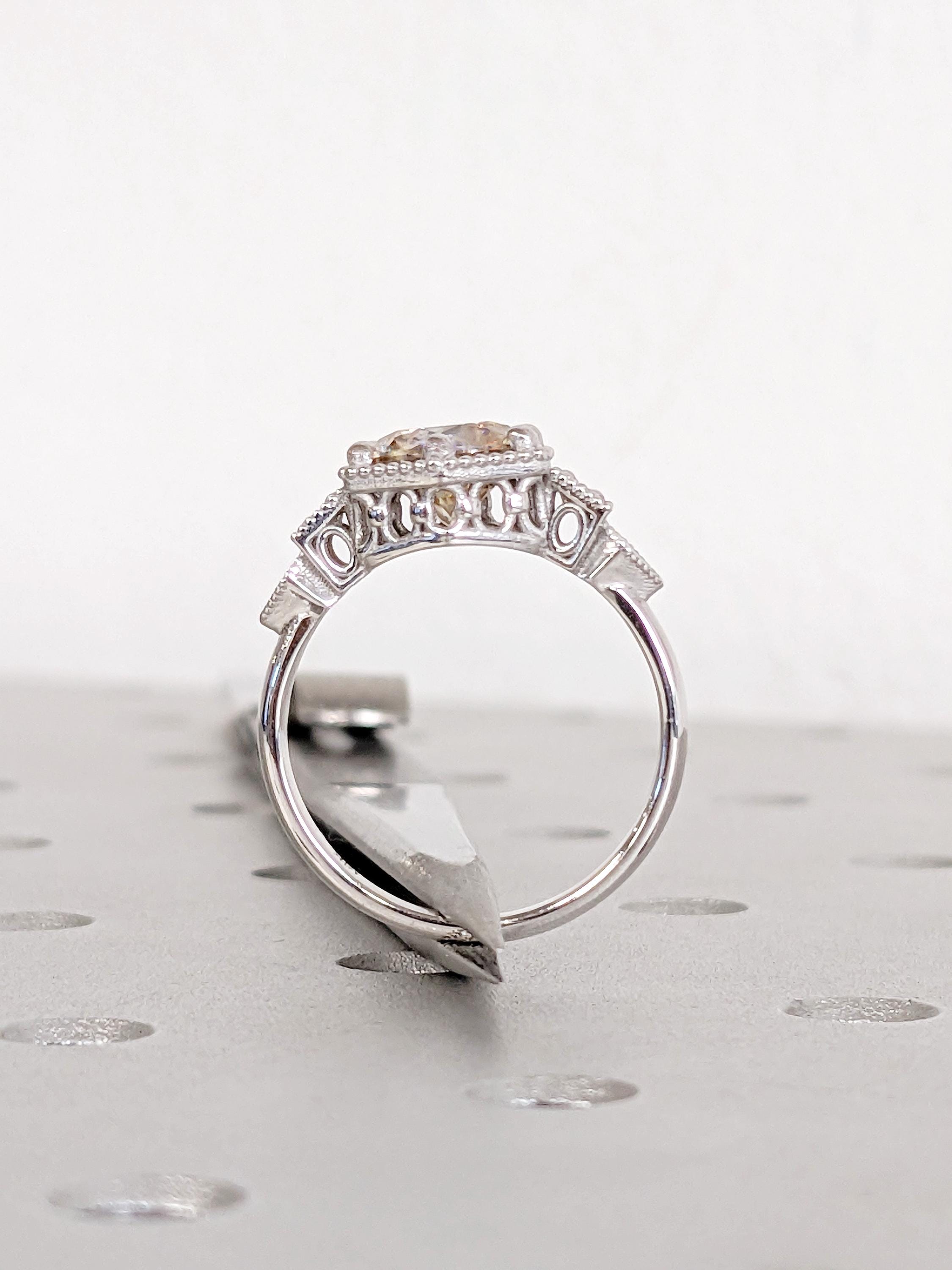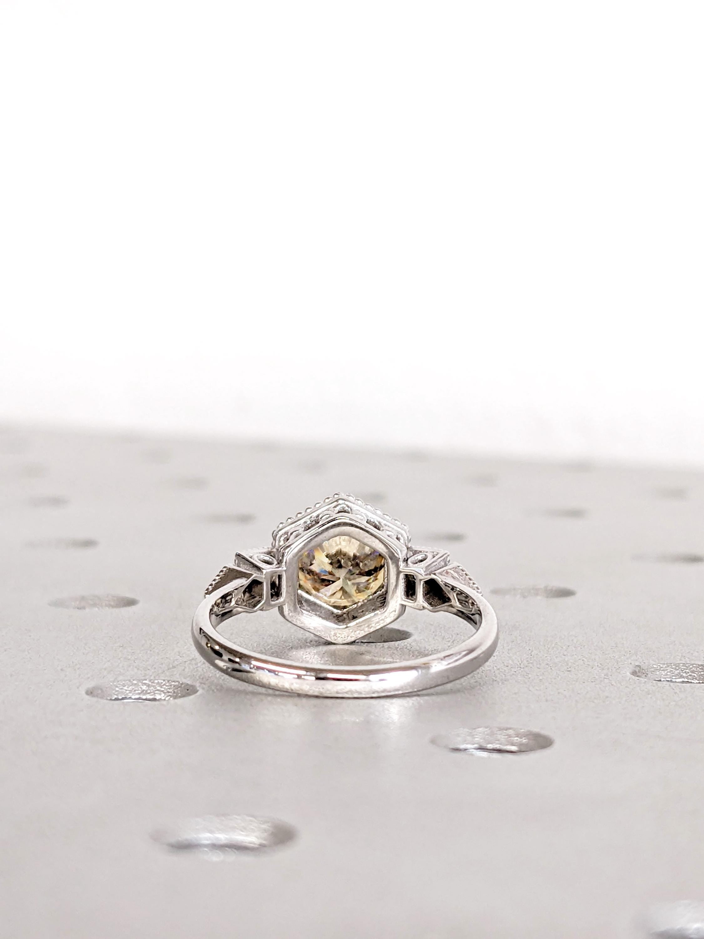 This Moissanite engagement ring features a yellow round Moissanite center stone in a prong setting, paired with round side stones available in Natural Diamond, Lab Grown Diamond, or Moissanite. The milgrain detailing and vintage inspired accents add soft elegance, making it a beautiful choice for an engagement ring, bridal gift, anniversary moment, or everyday wear.
