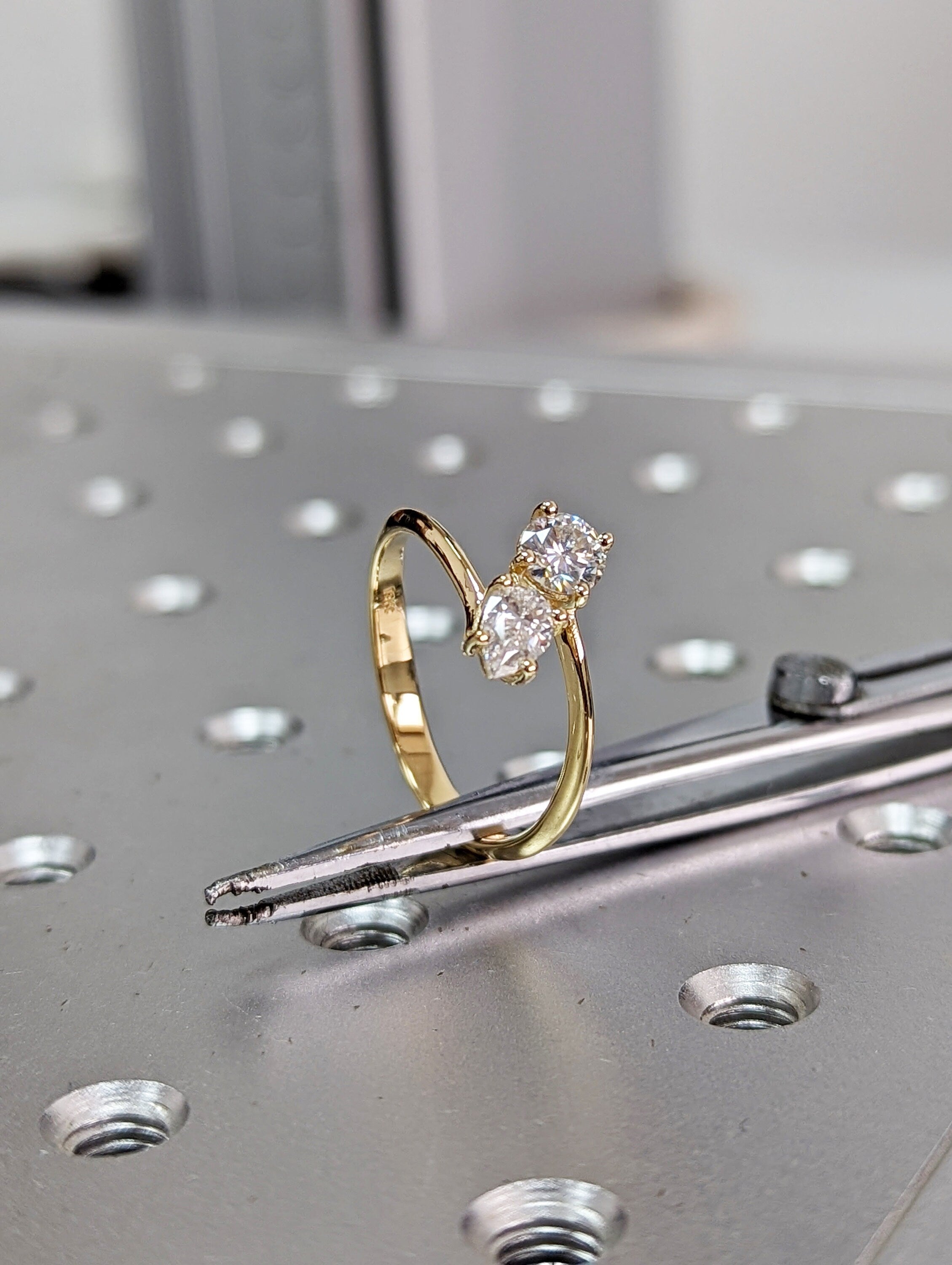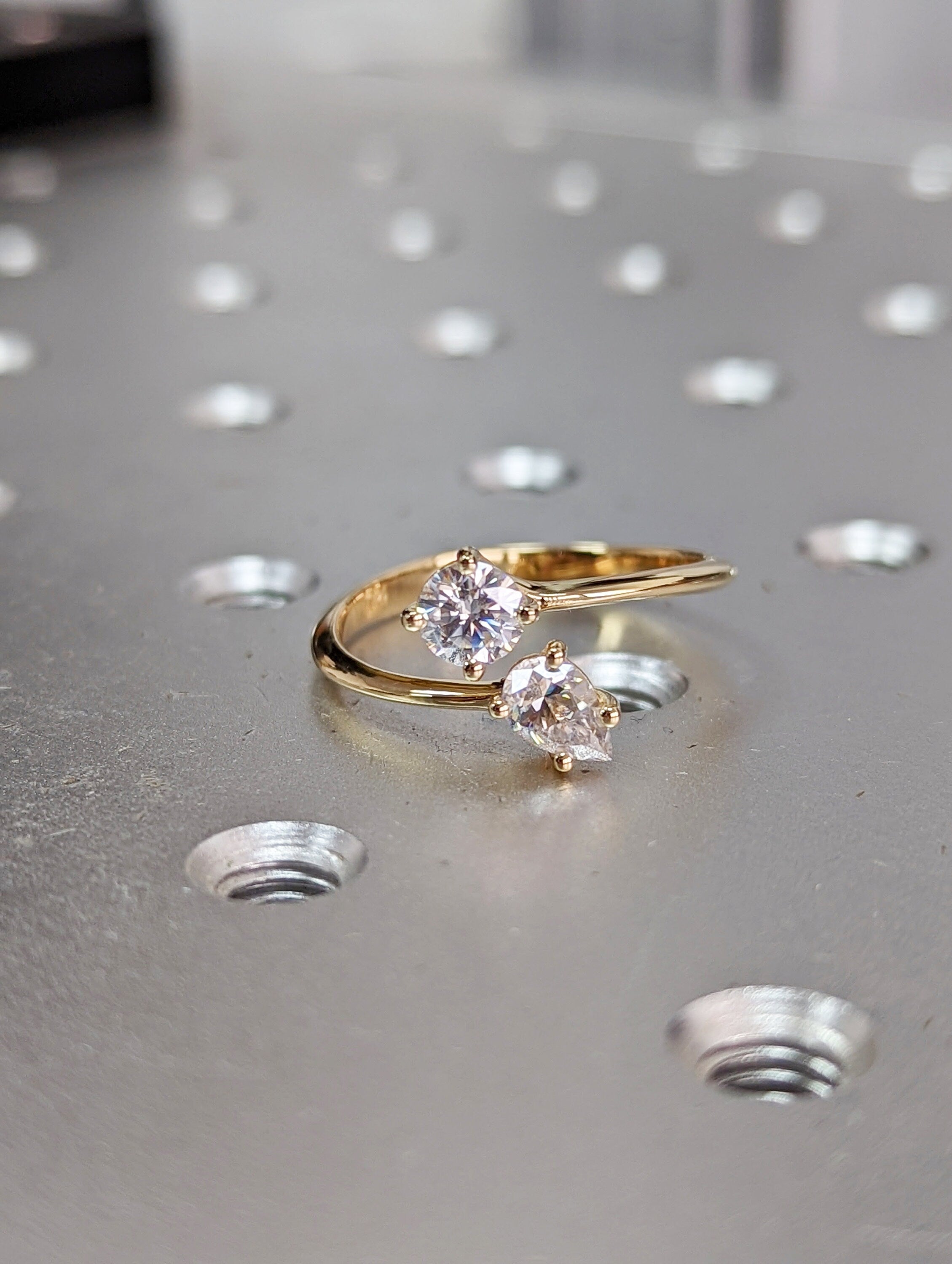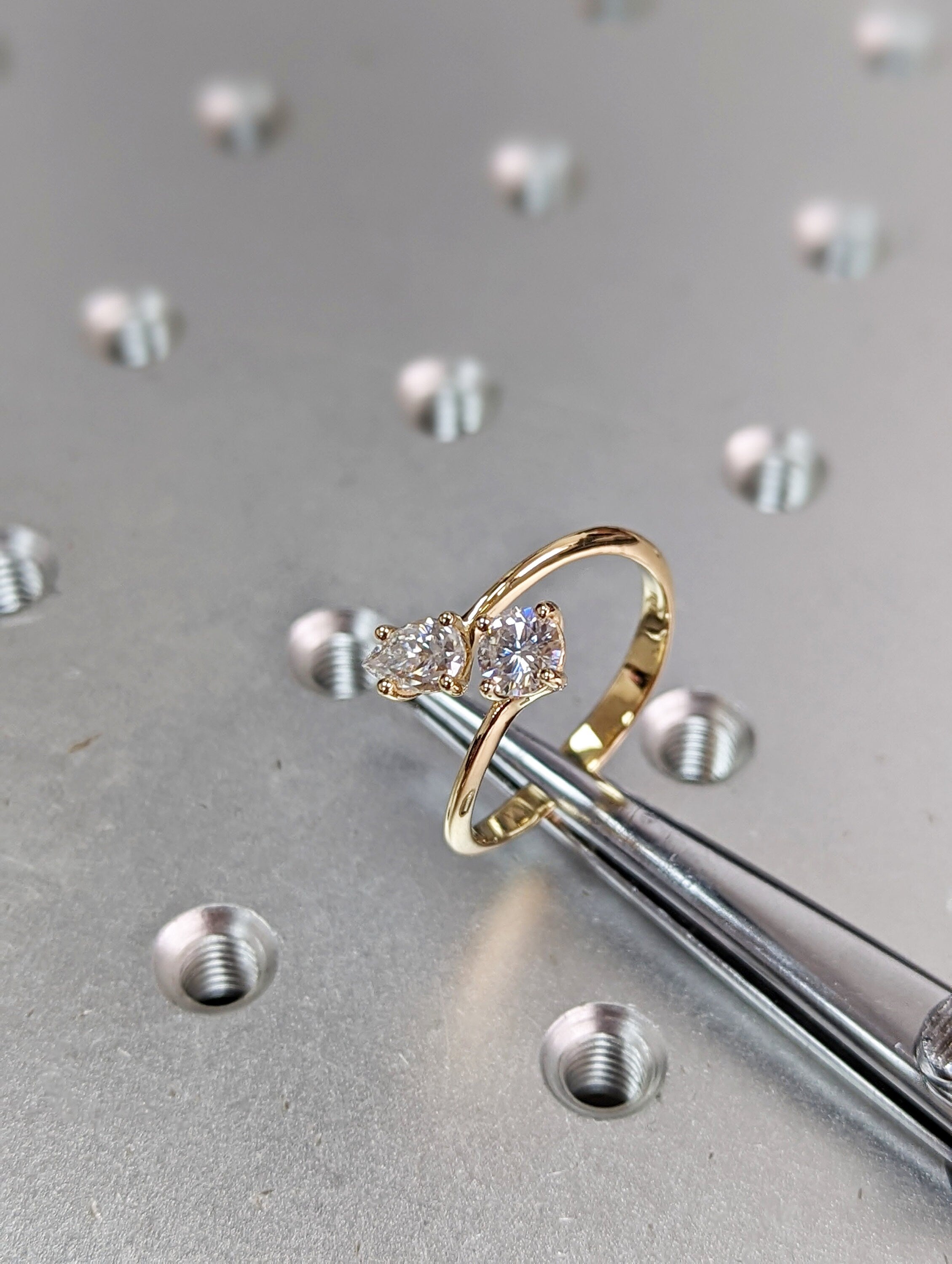 A beautiful dual round brilliant and pear shaped moissanites, set with a super delicate and unique setting , the open band design make this ring a true stunner!