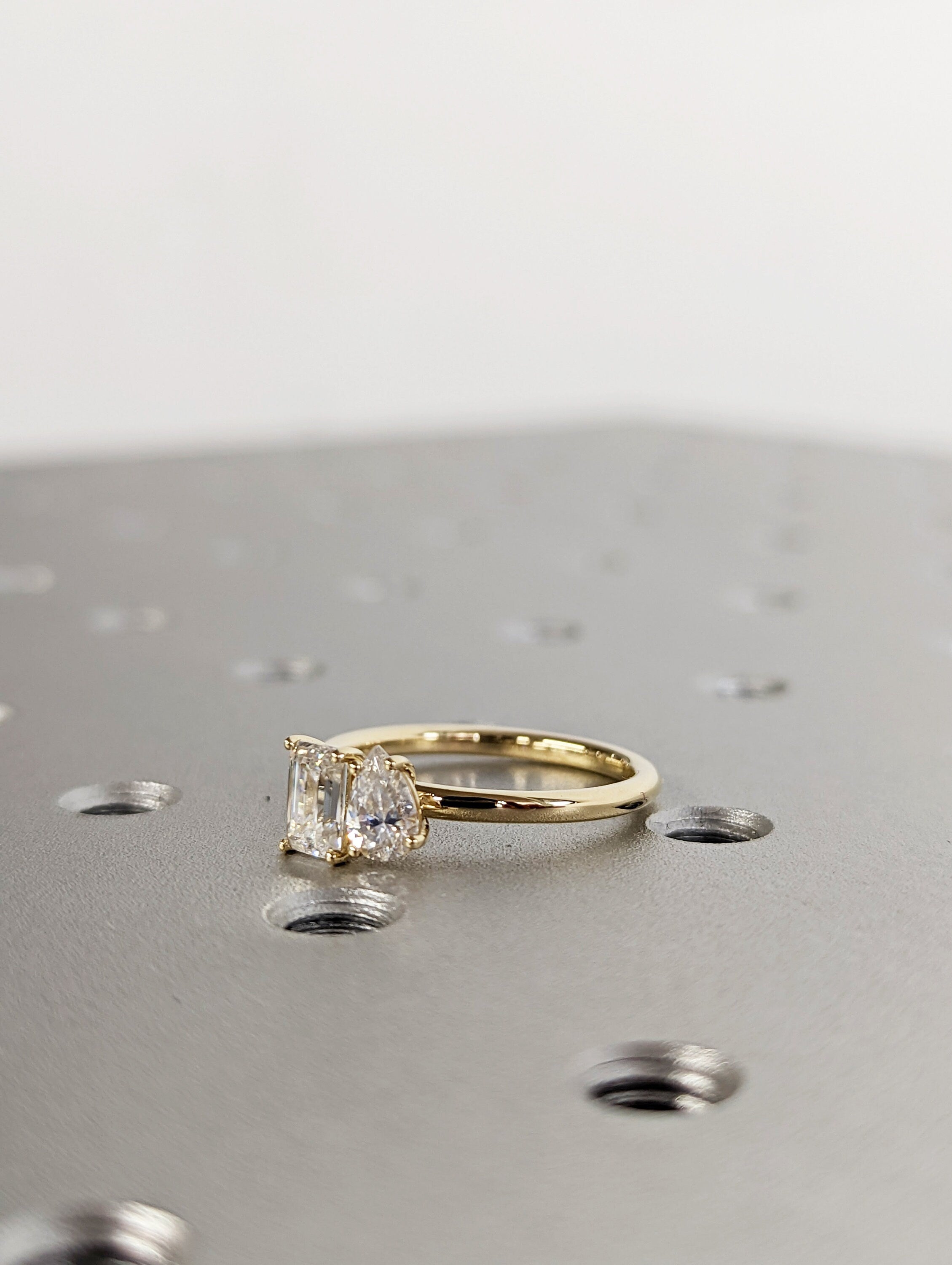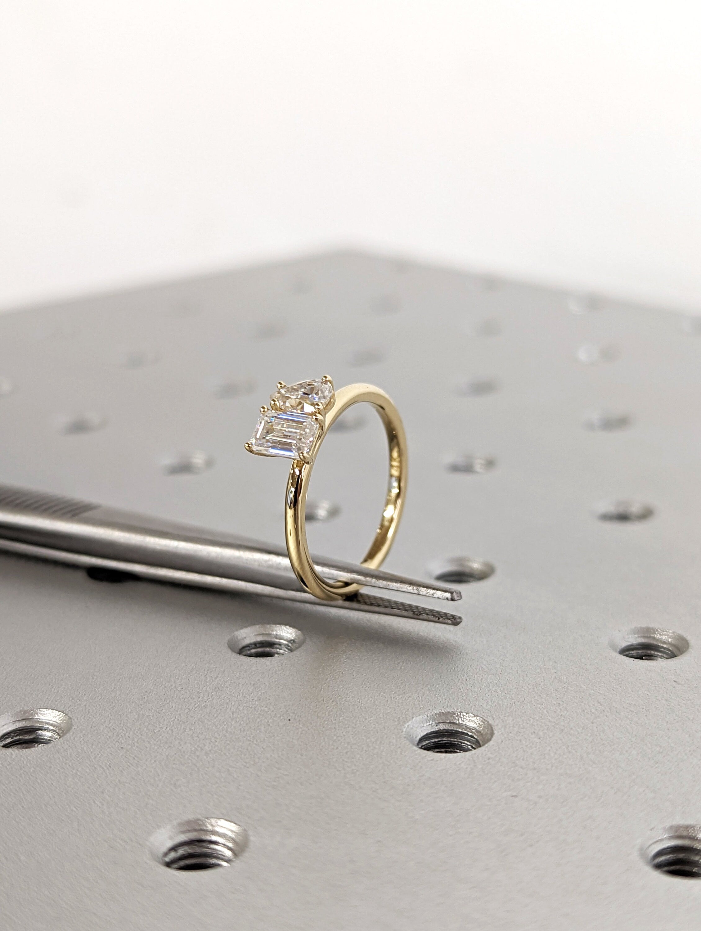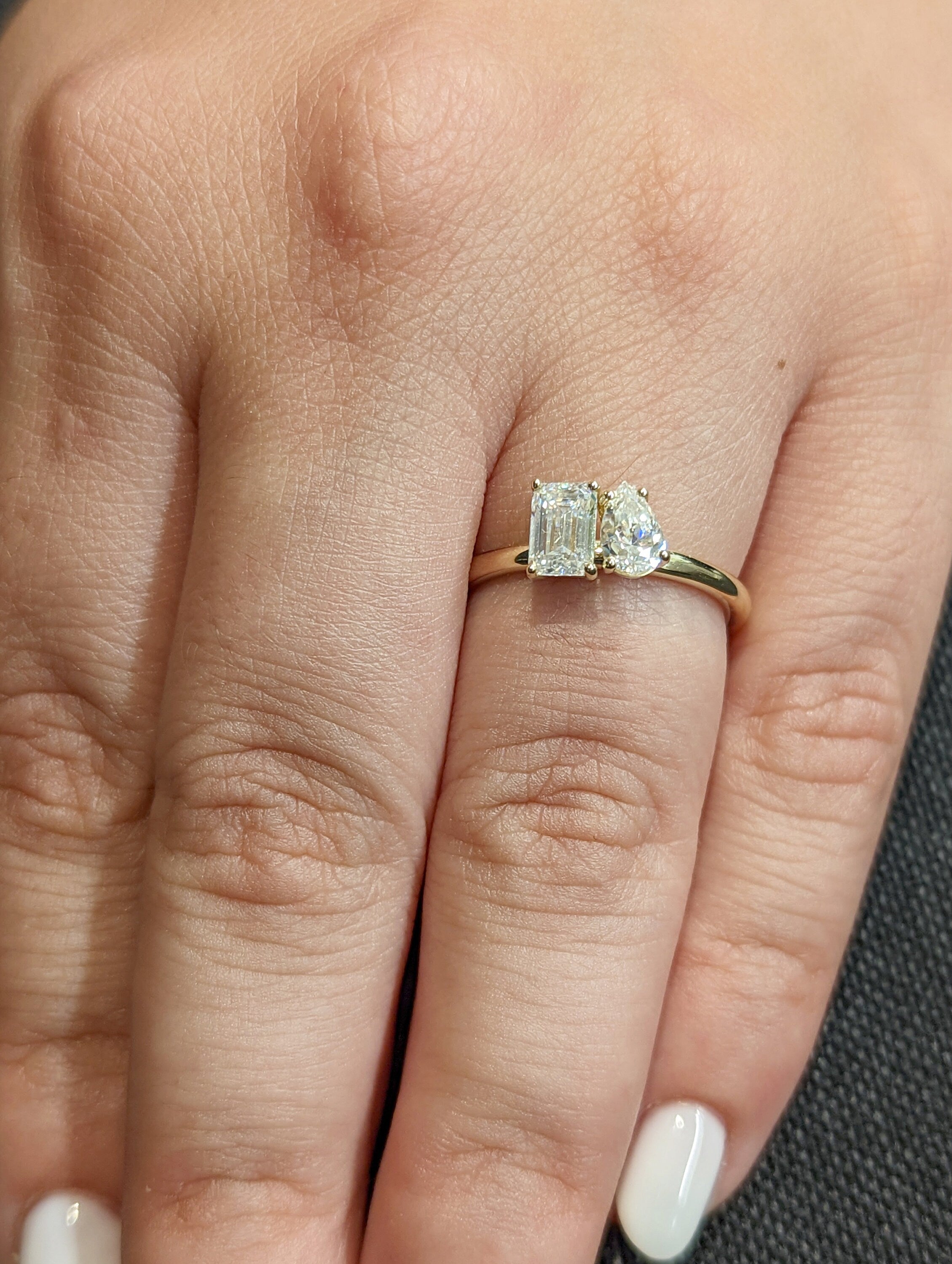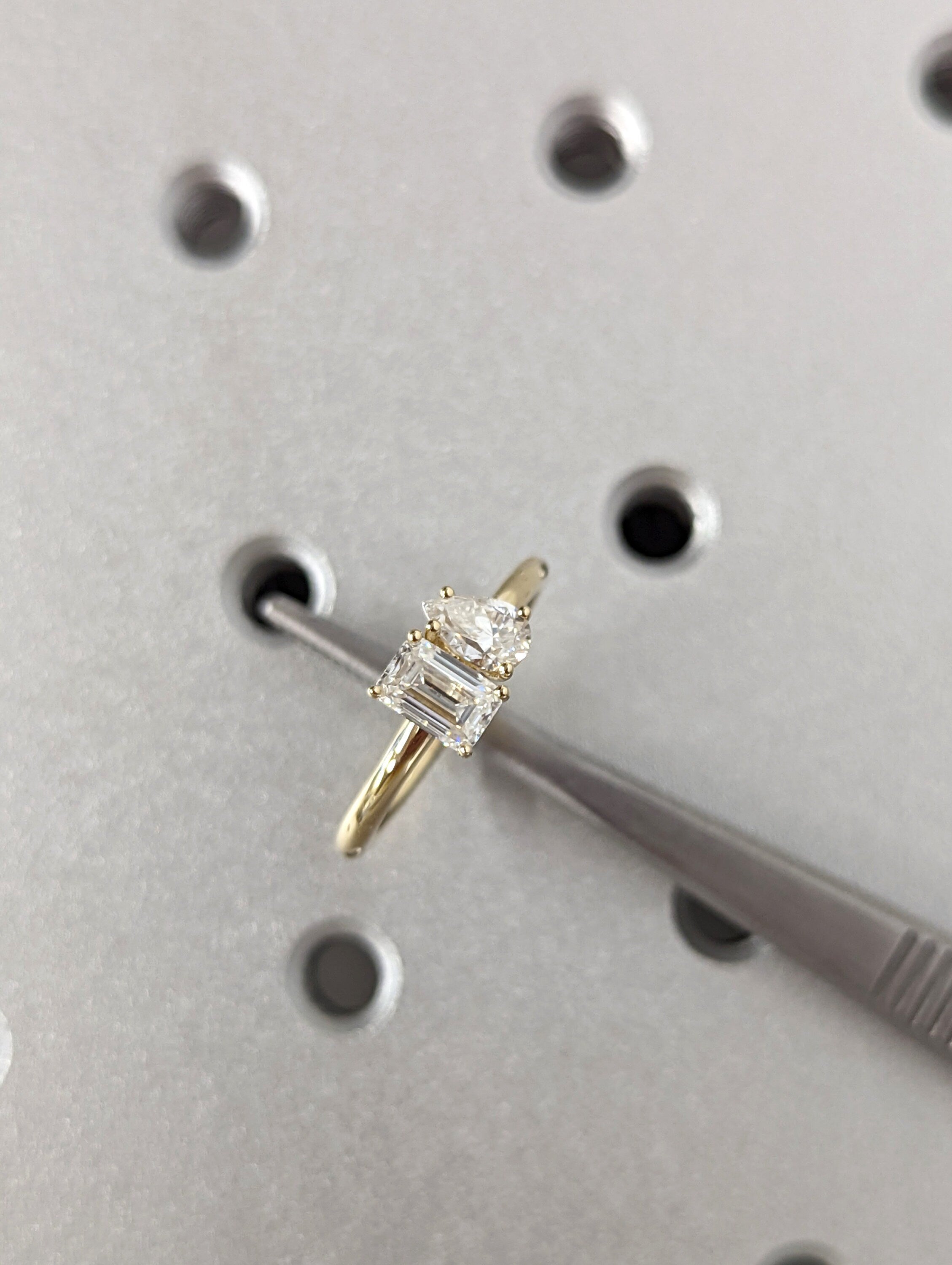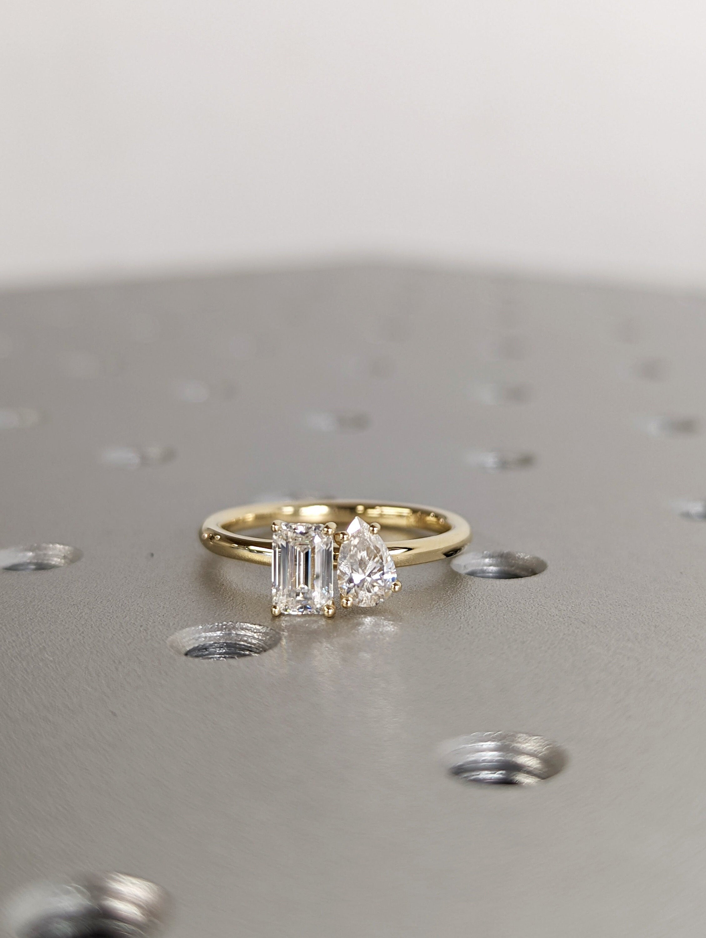 A beautiful dual emerald and pear shaped moissanites, set with a super delicate and thin setting the unique and delicate