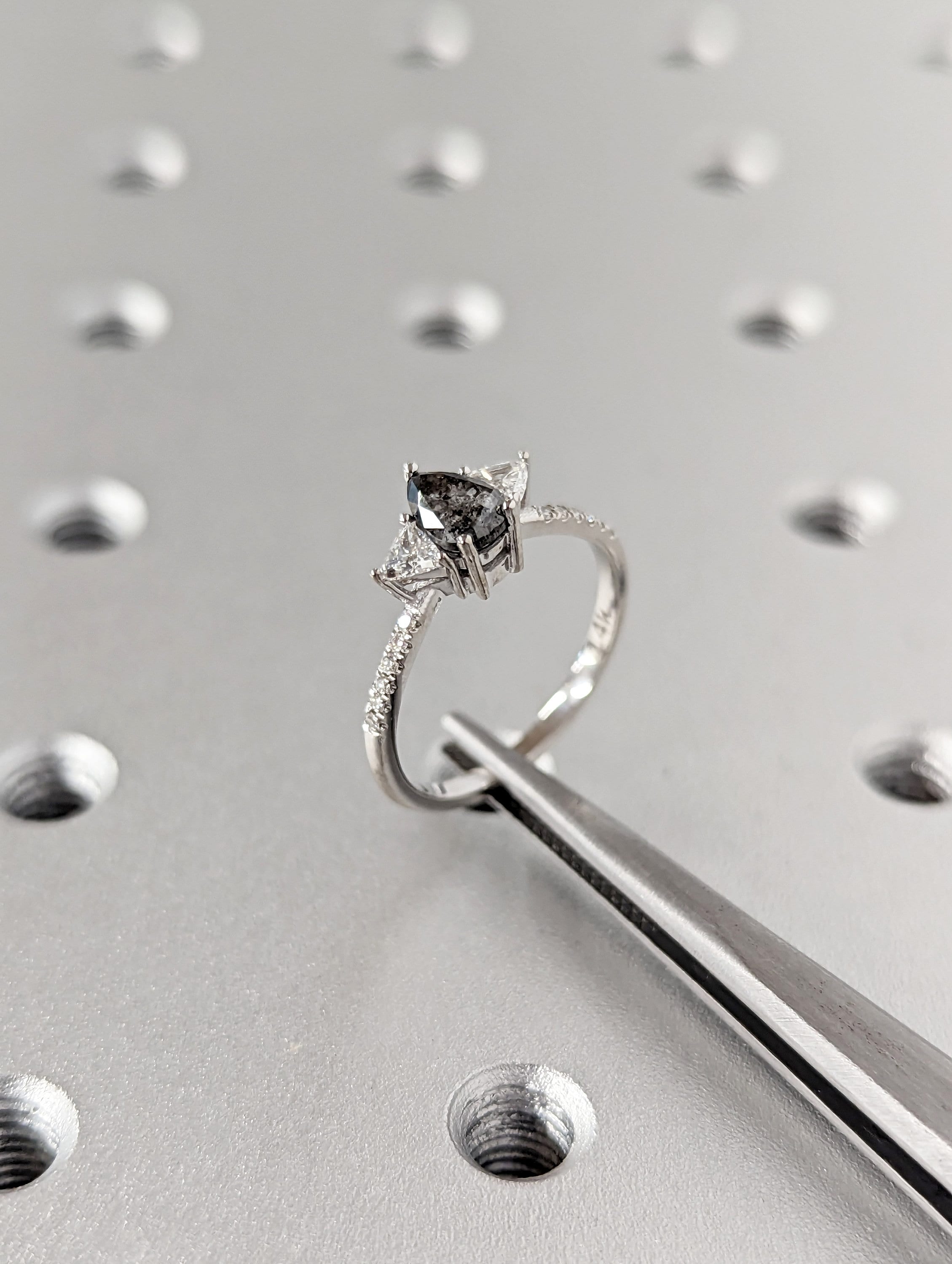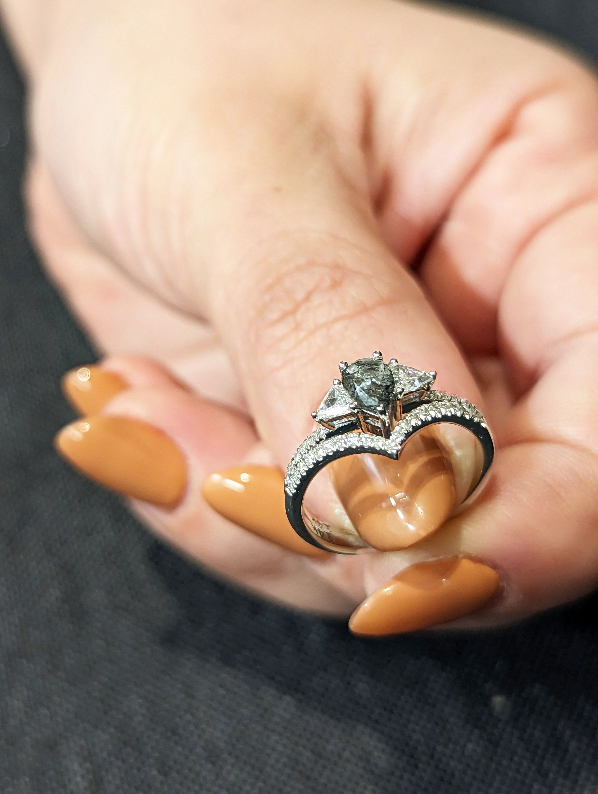 ONE-OF-A-KIND Pear salt and pepper diamond, a trillion enhanced diamond ring that is just pure uniqueness, nothing that has ever been seen before. Can match with a diamond curved band.