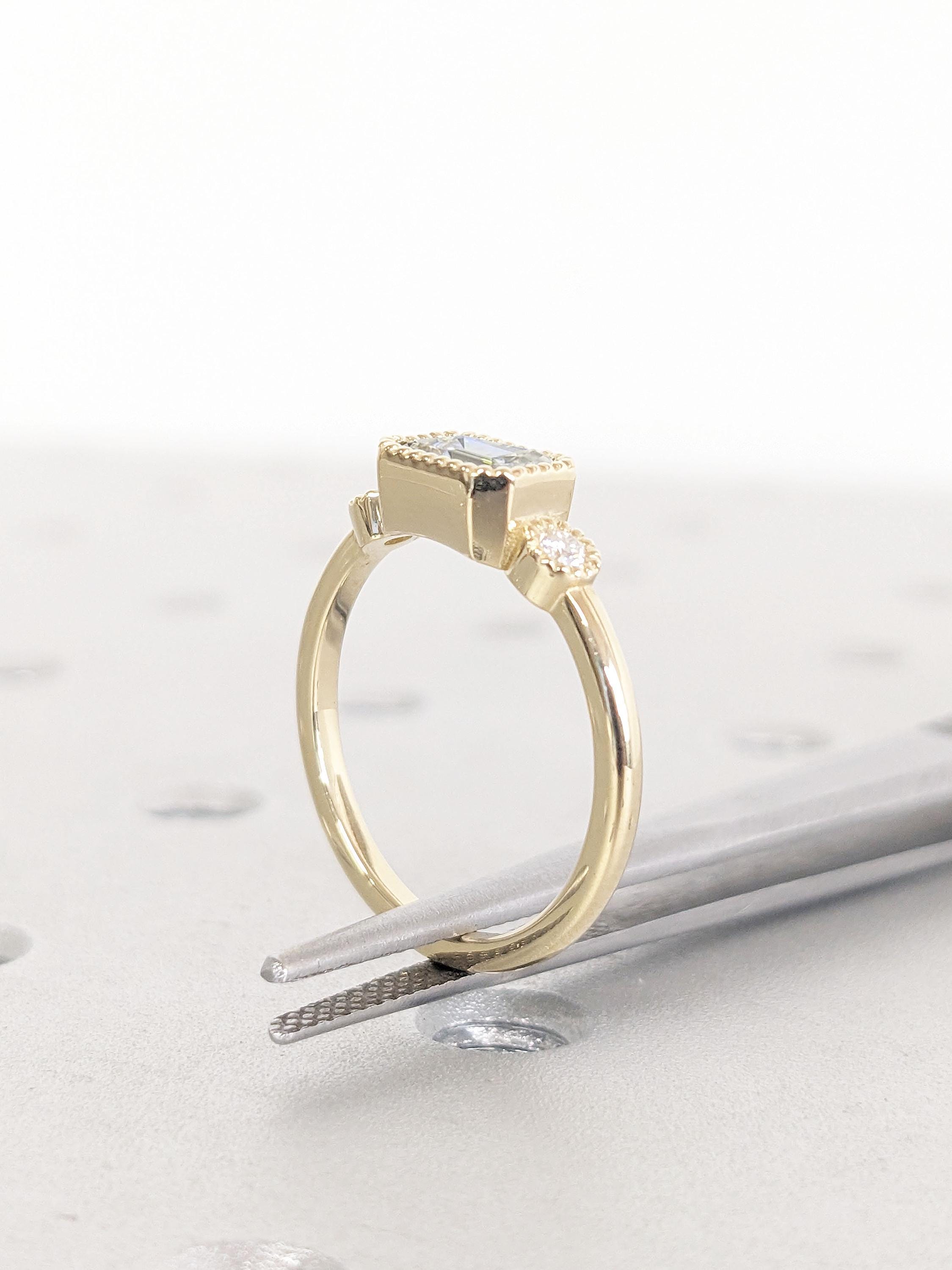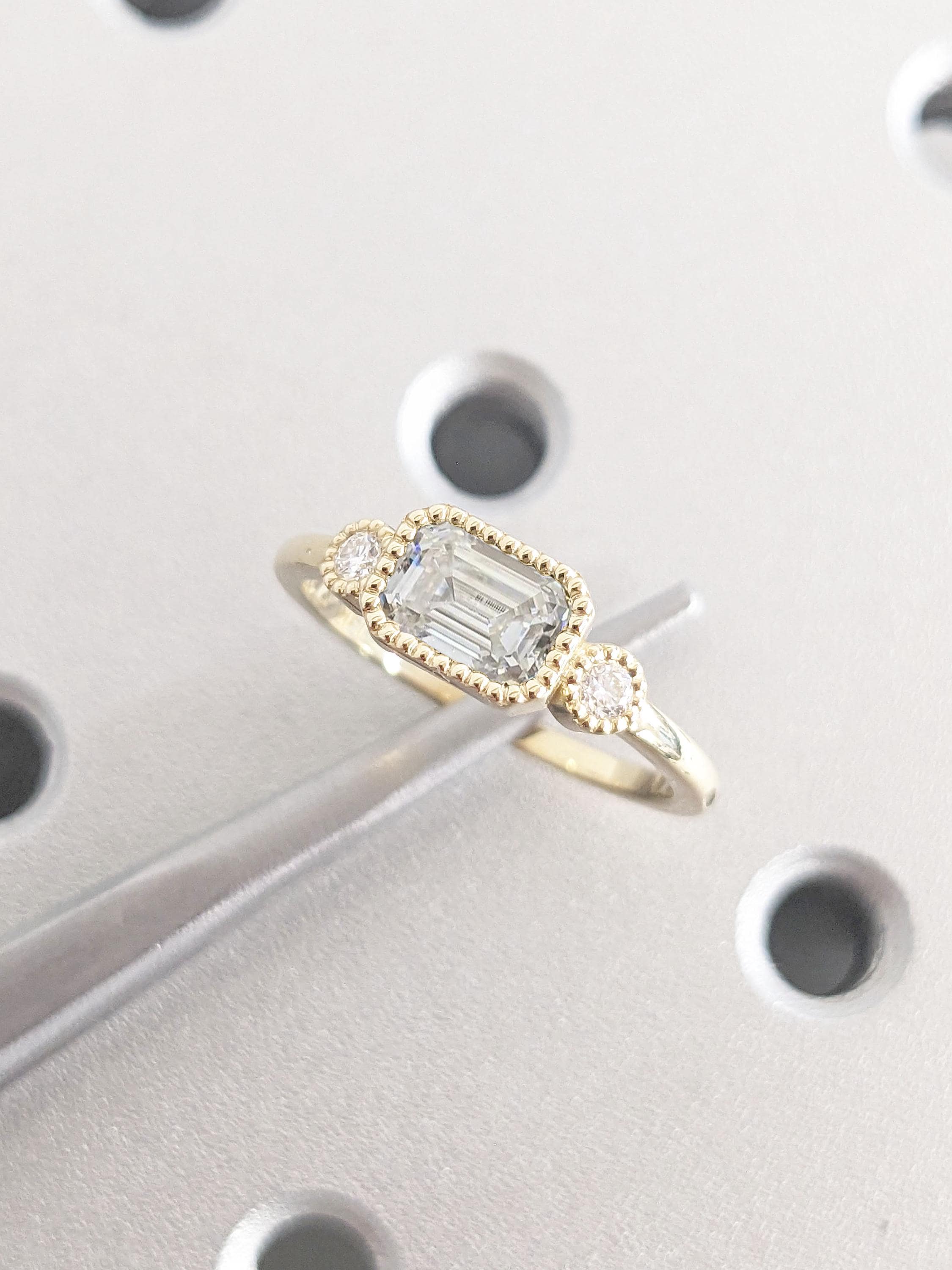 A timeless, minimalist ring features an emerald cut Moissanite center stone, accented by paved round cut natural diamonds, lab diamonds or moissanites on each side. Hand engraved milgrain detailing beautifully encapsulates the gemstones exuding a regal touch of vintage flair. Perfect either as a birthday gift, an engagement ring or anniversary gift for weddings.