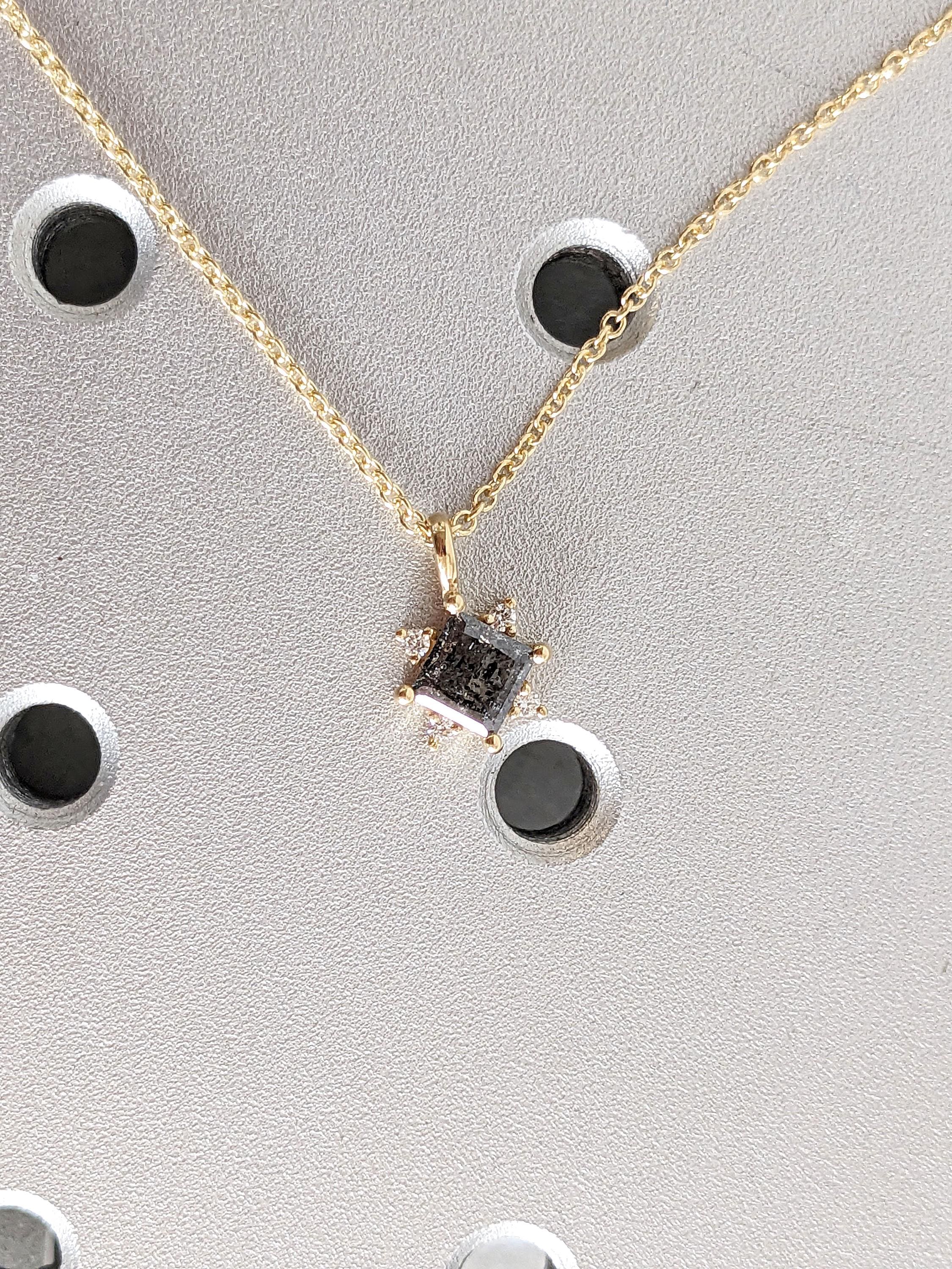 A beautiful handmade princess cut pendant, features a mesmerizing natural Salt and Pepper Diamond focal stone, accented by four dainty round cut side stones. The unique inclusion of the center stone resembling a dreamy galaxy, give this pendant necklace that celestial vibe. The perfect gift for star lovers.