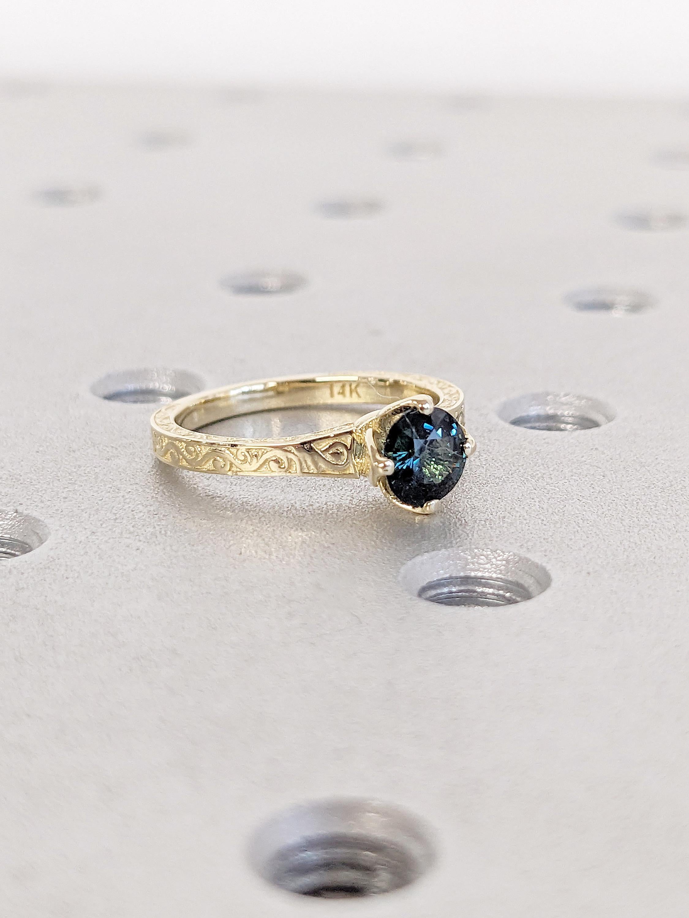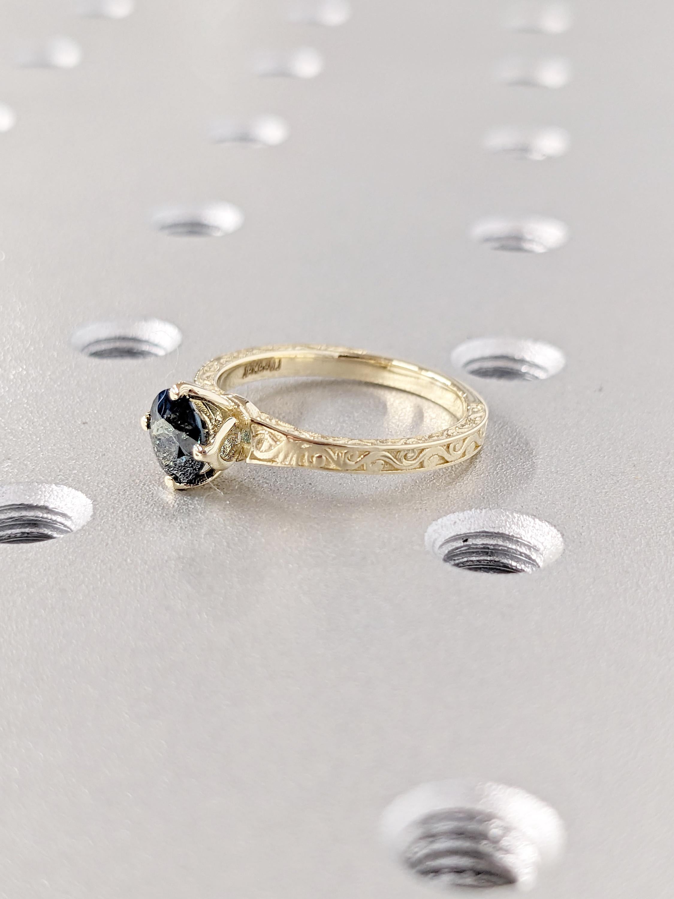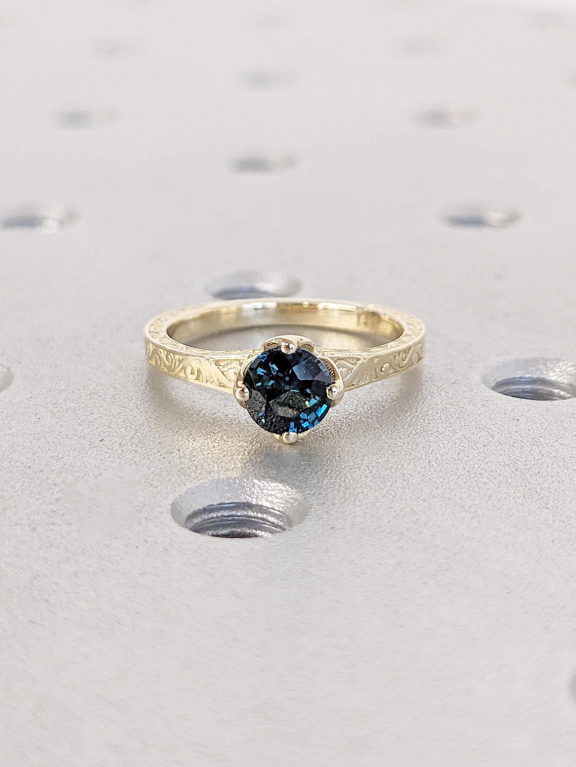 Enchanting and timeless, our vintage-inspired engagement ring features a captivating peacock sapphire with a luminous blue-green hue. Nestled in a secure tulip basket setting on a square-shaped band, the ring is embellished with exquisite undulating wave filigree, creating a perfect representation of your enduring love story.