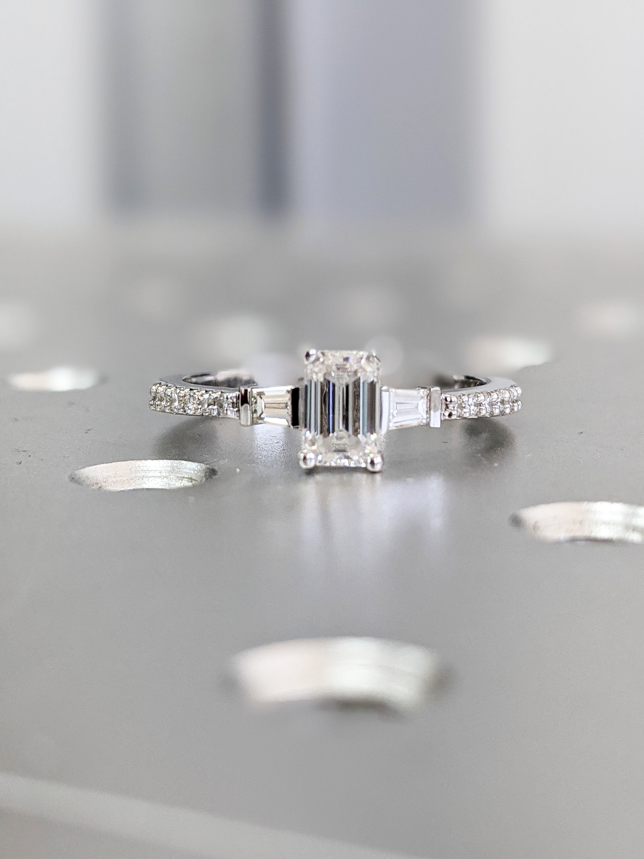 The baguette bar set diamond accents either side of the claw prong center stone add a light-catching quality to this alluring engagement ring, which is completed by a tapered band.