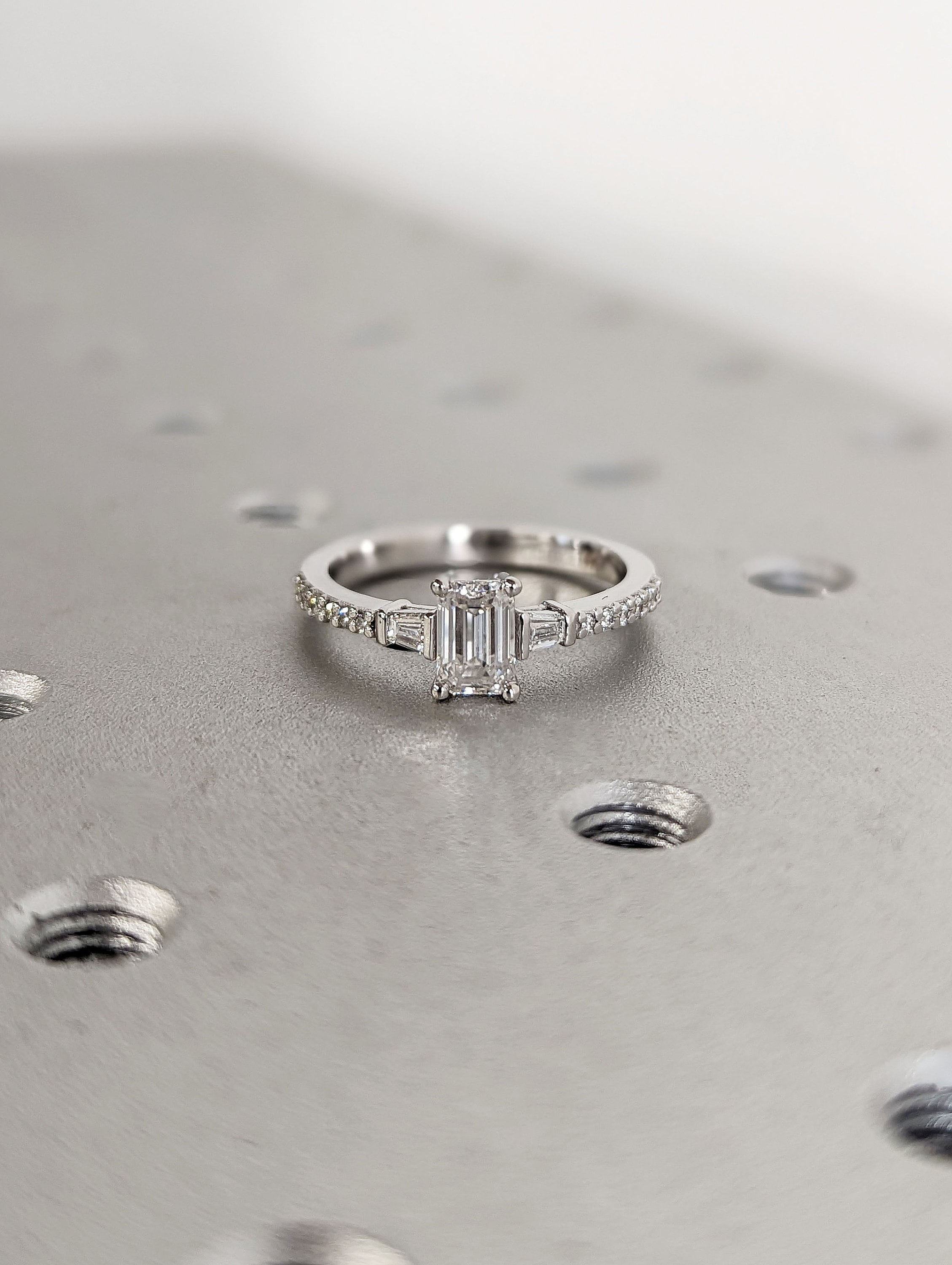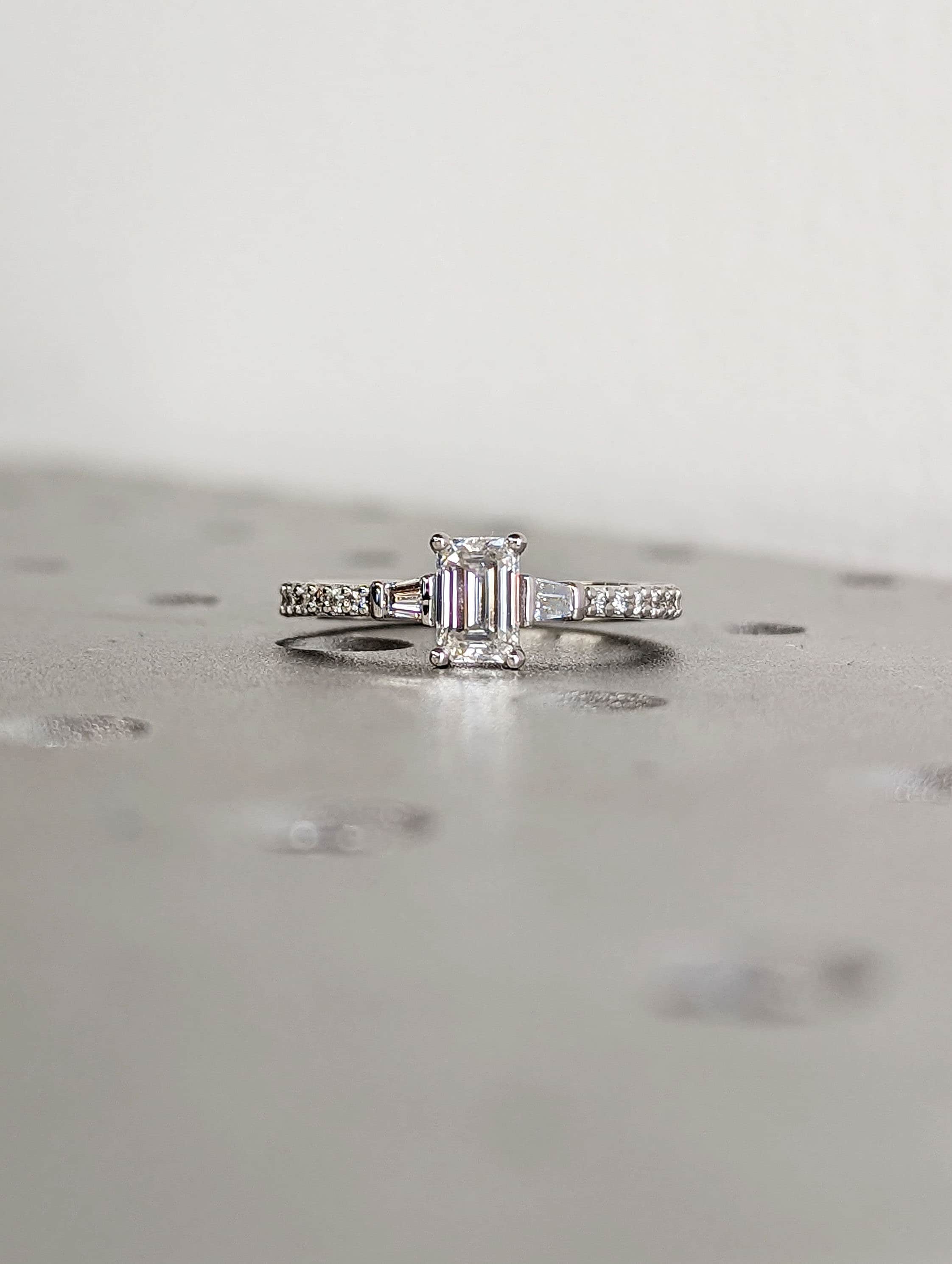 The baguette bar set diamond accents either side of the claw prong center stone add a light-catching quality to this alluring engagement ring, which is completed by a tapered band.