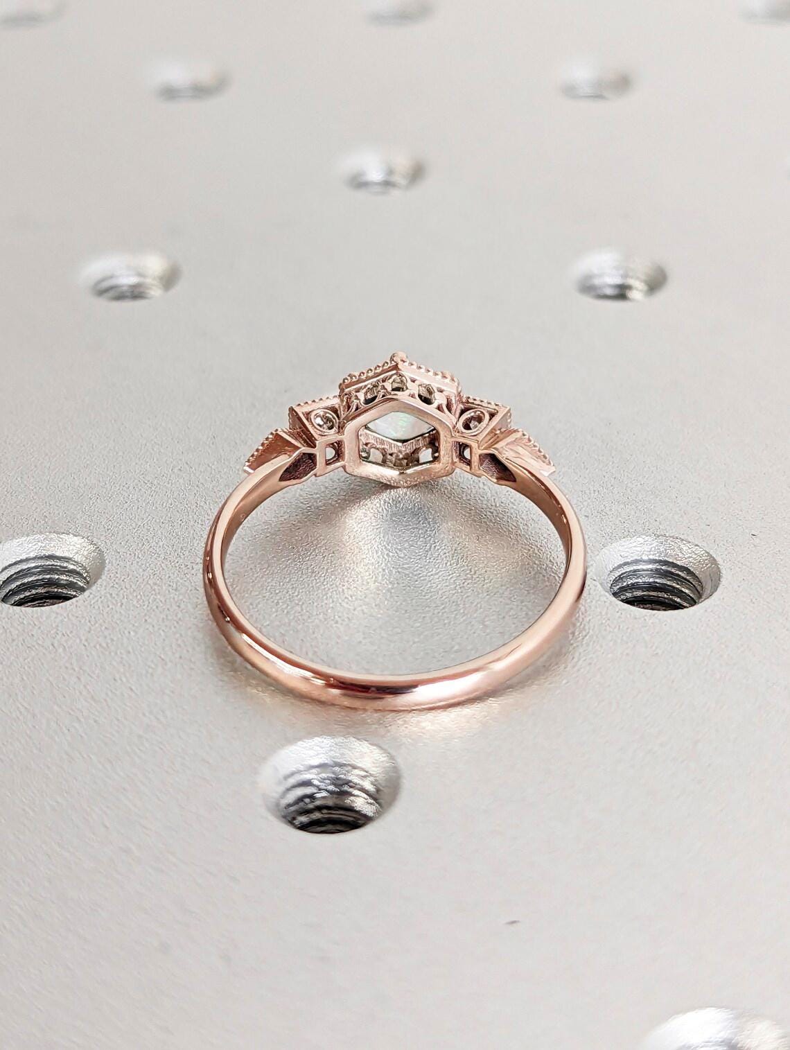 Discover timeless elegance with our round cut Opal in hexagonal setting engagement ring, featuring the allure of natural diamond, lab diamond or moissanite accents and delicate milgrain embellishments. The opal centerpiece steals the spotlight, showcasing its enchanting white hue, creating a captivating and sophisticated piece for your special moment.