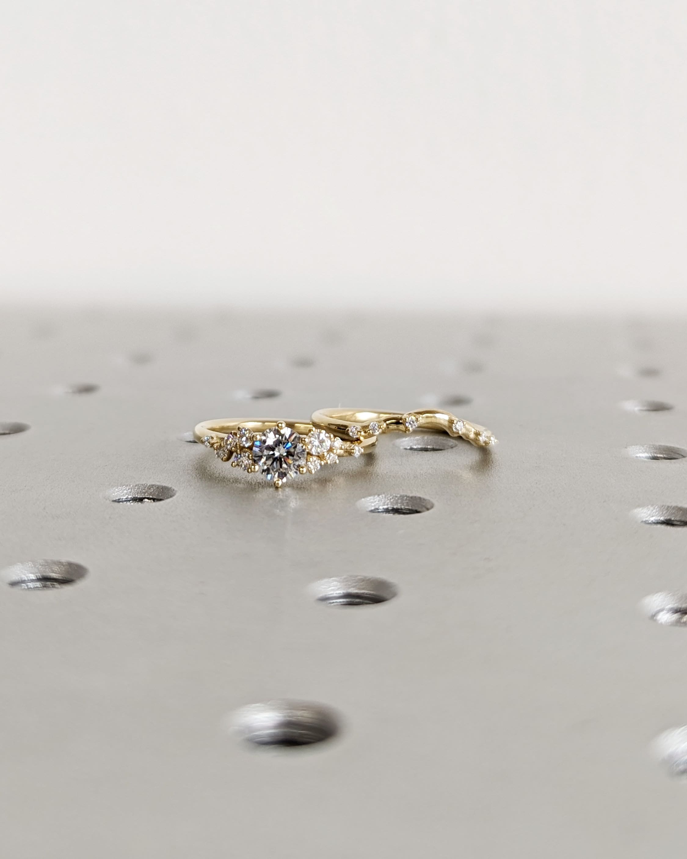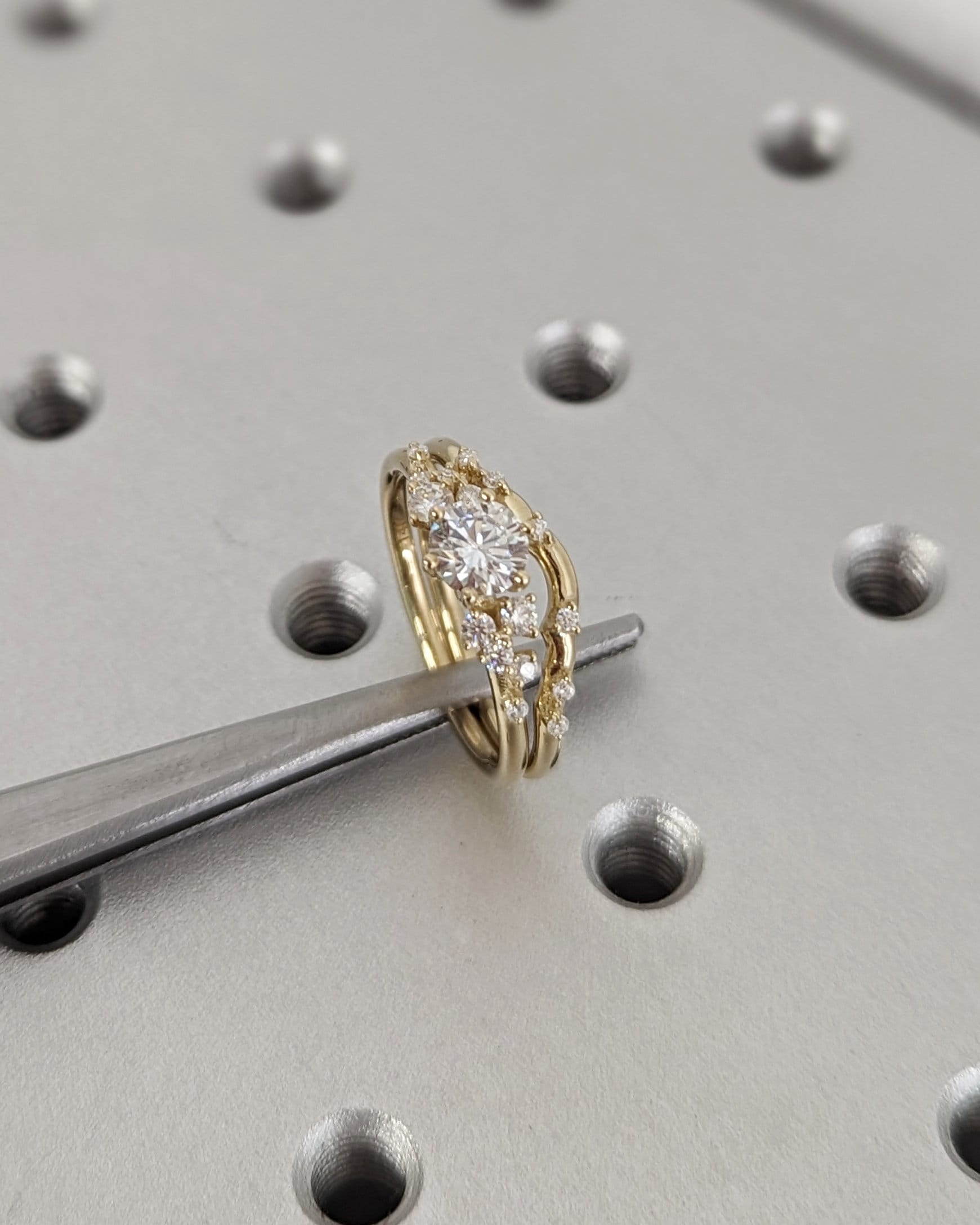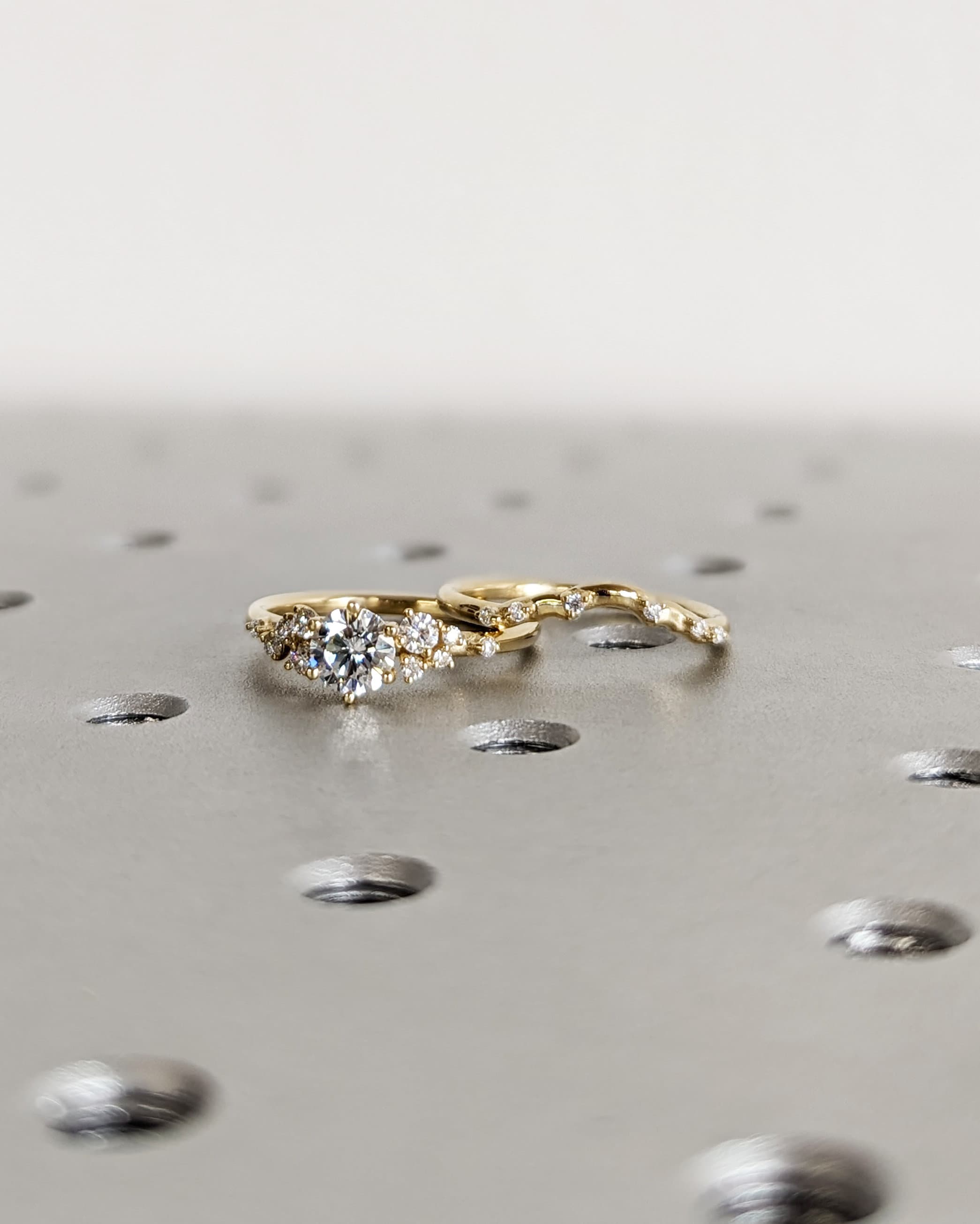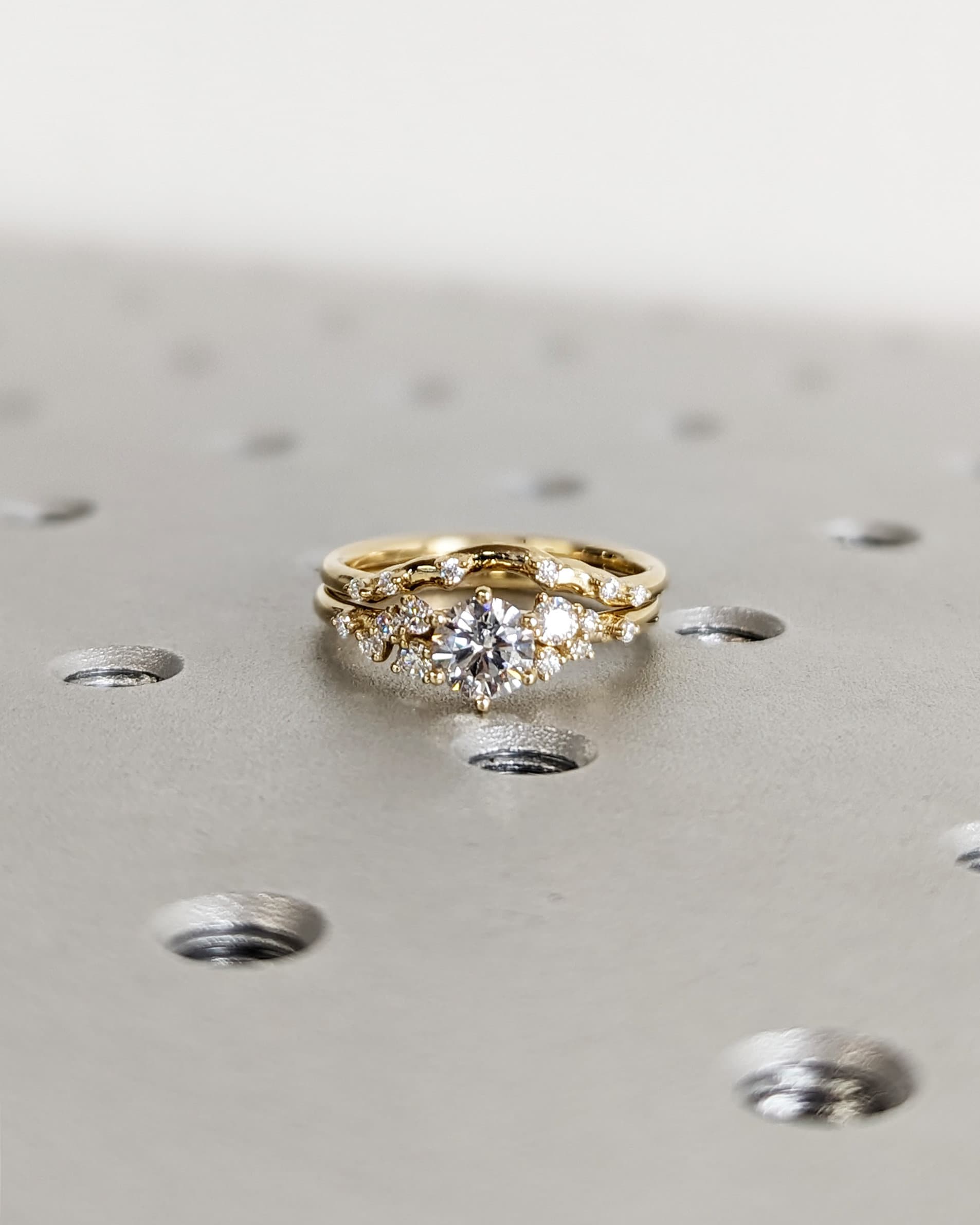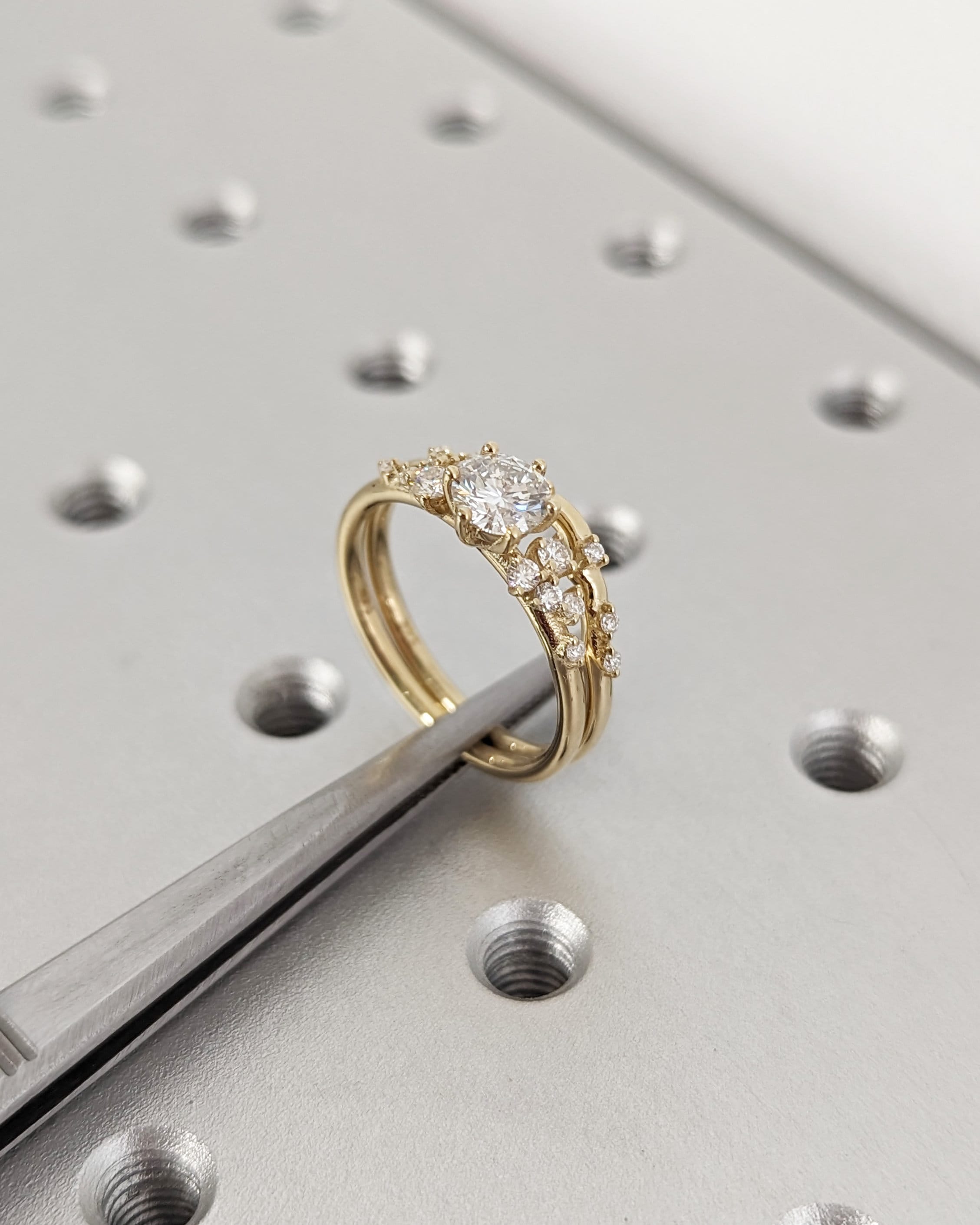 Mark the start of your forever with our round cut moissanite engagement ring, set in a fine, delicate setting. This ring's intricate design, accentuated by a cluster of sparkling snowdrift diamonds, gleams like freshly fallen snow, representing your eternal commitment.