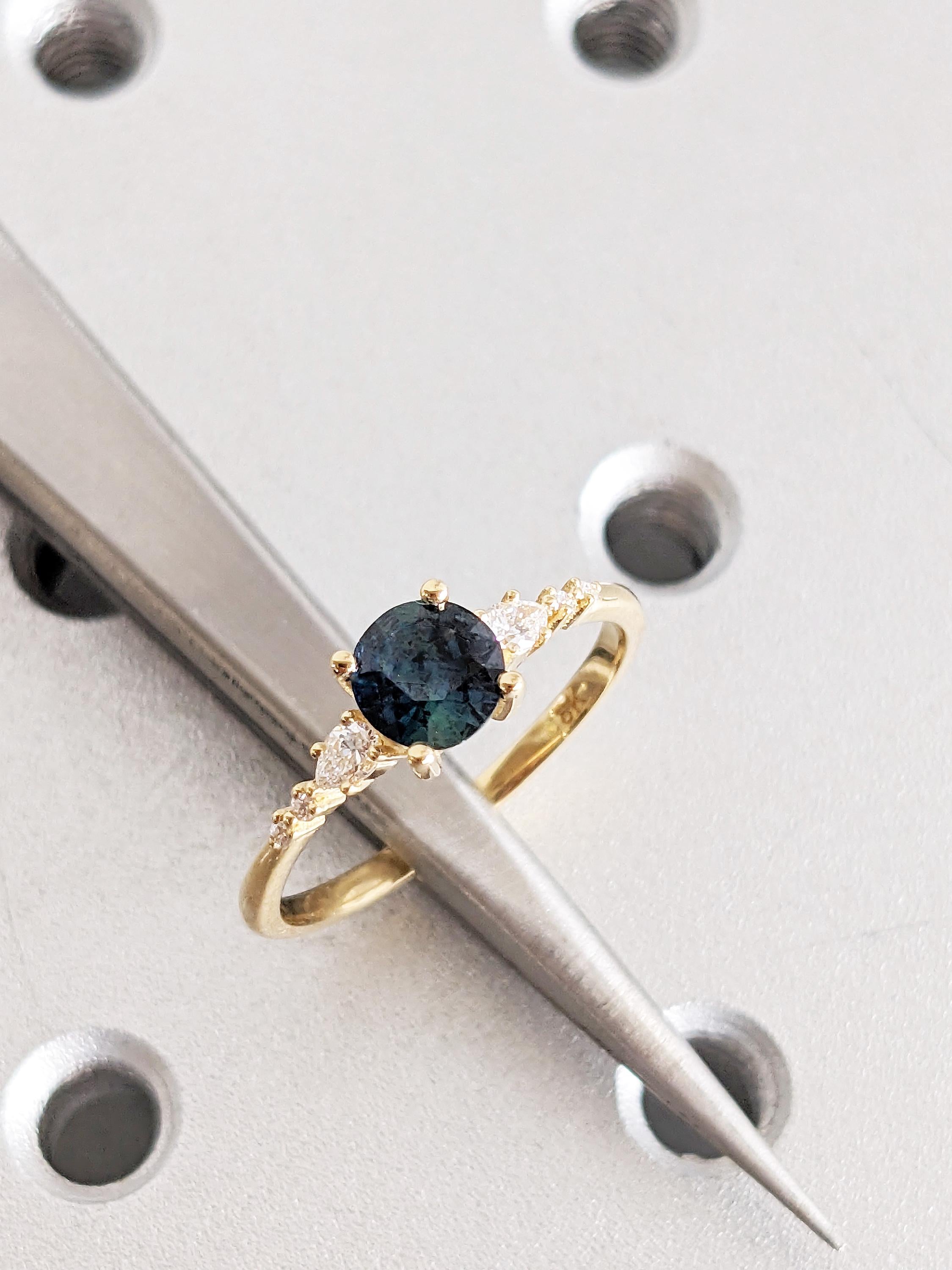 This teal peacock Sapphire engagement ring features a round Sapphire in a prong setting, beautifully accented by Natural Diamond, Lab Grown Diamond, or Moissanite side stones in pear and round cuts. The timeless design adds elegance and brilliance, making it an ideal choice for engagements, anniversaries, or as a meaningful gift for someone special.