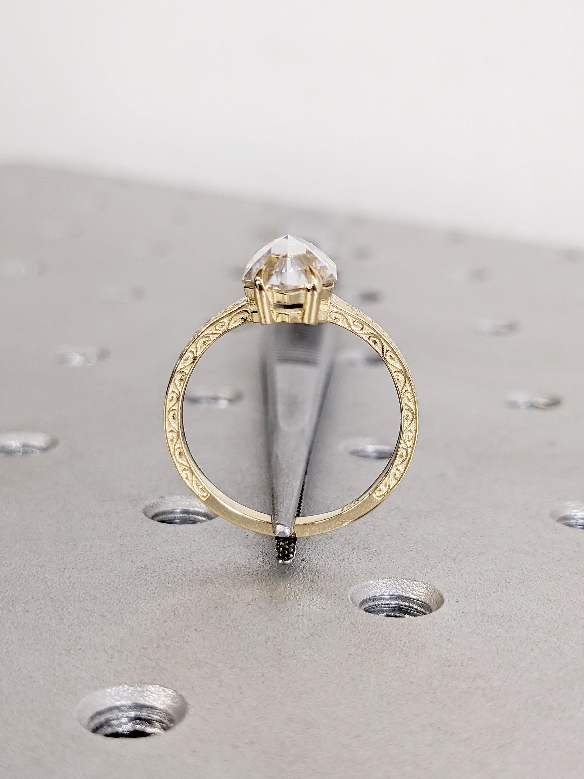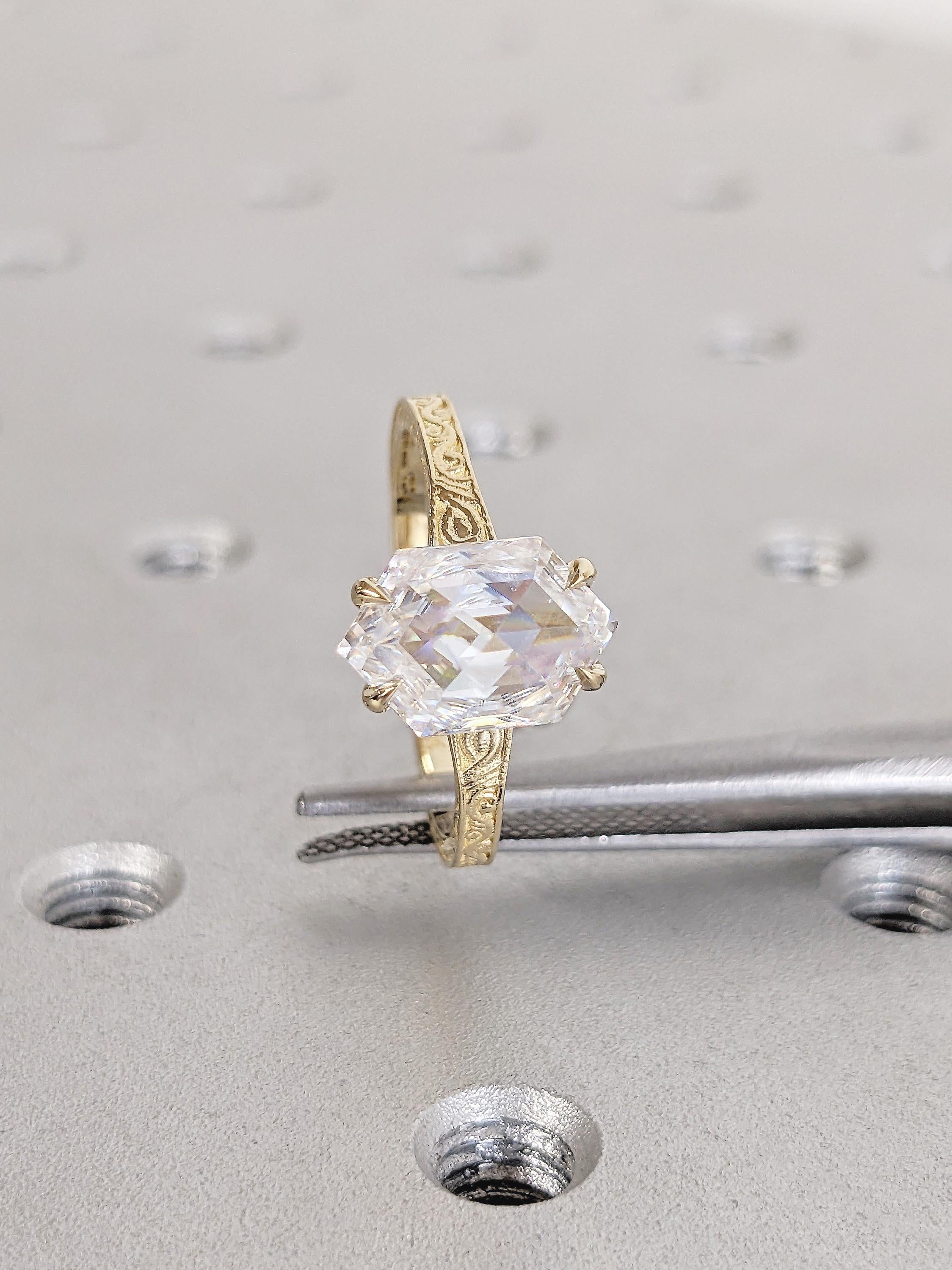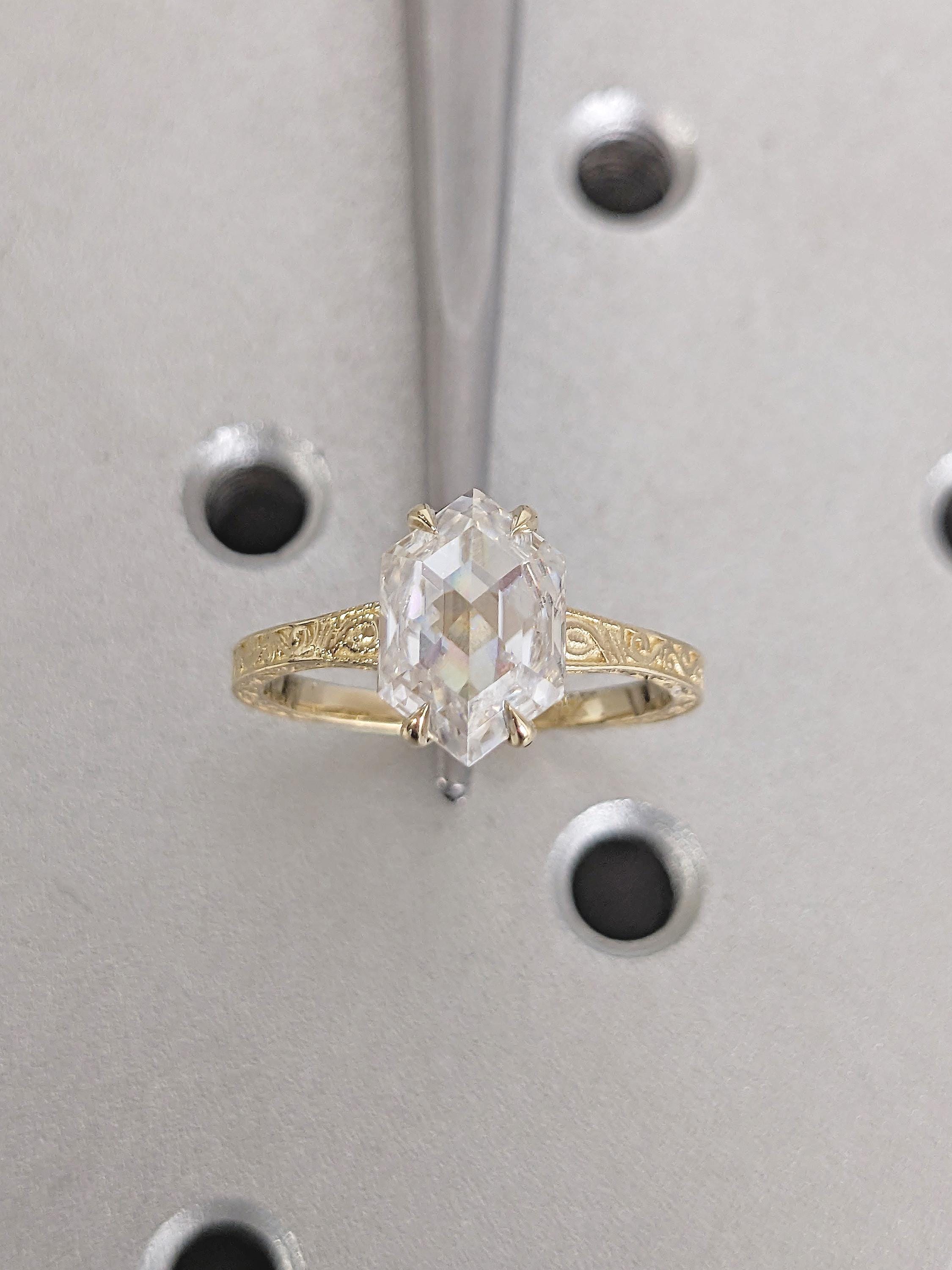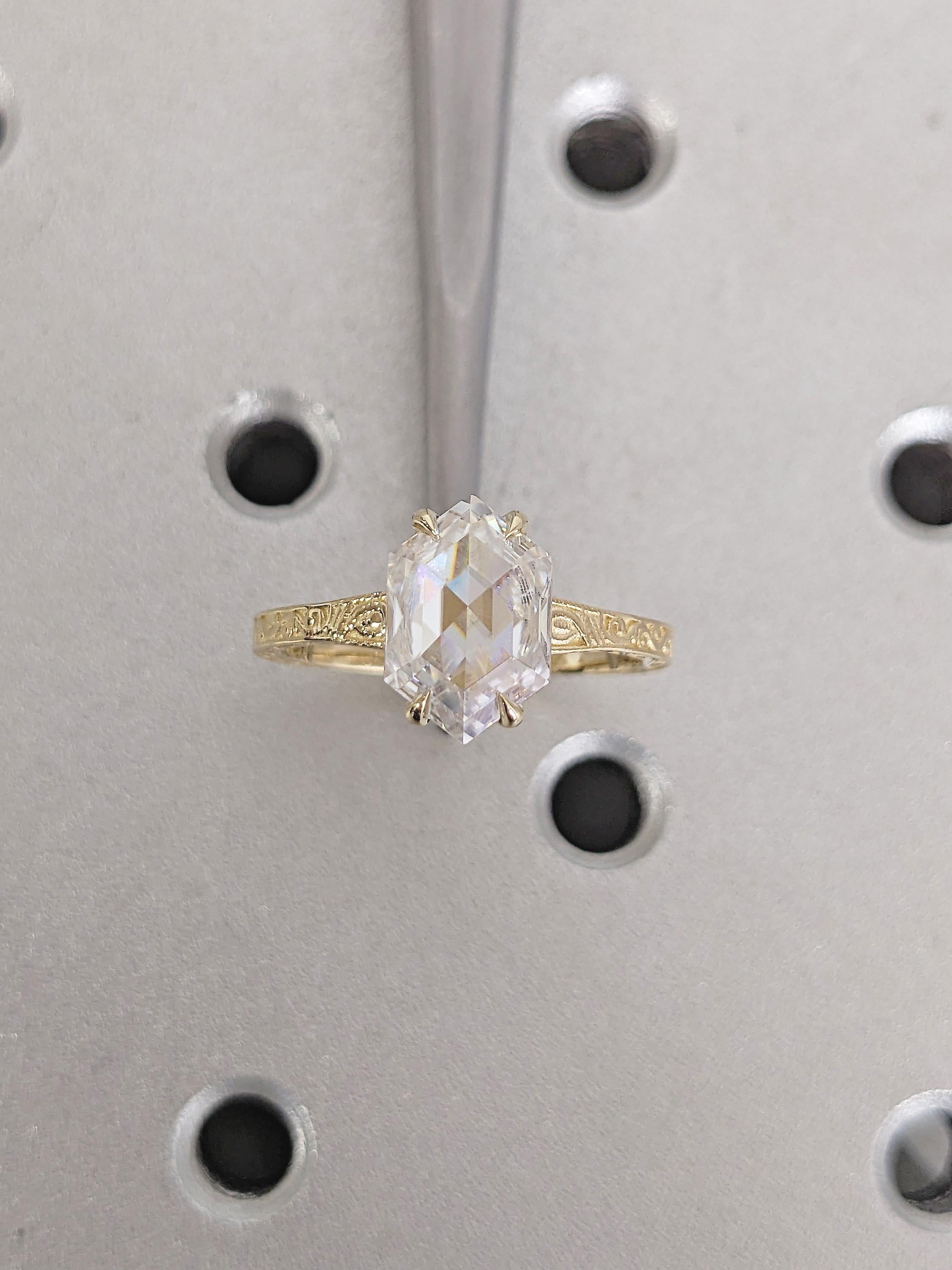 Make a statement of timeless elegance with our antique-inspired engagement ring, featuring a hexagon cut Lab Grown Diamond set in a secure talon prong setting. The intricate details of undulating filigree waves on the square-shaped band add a vintage touch, making this ring a stunning choice for your special moment.
