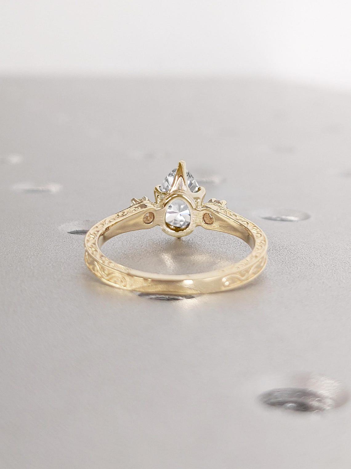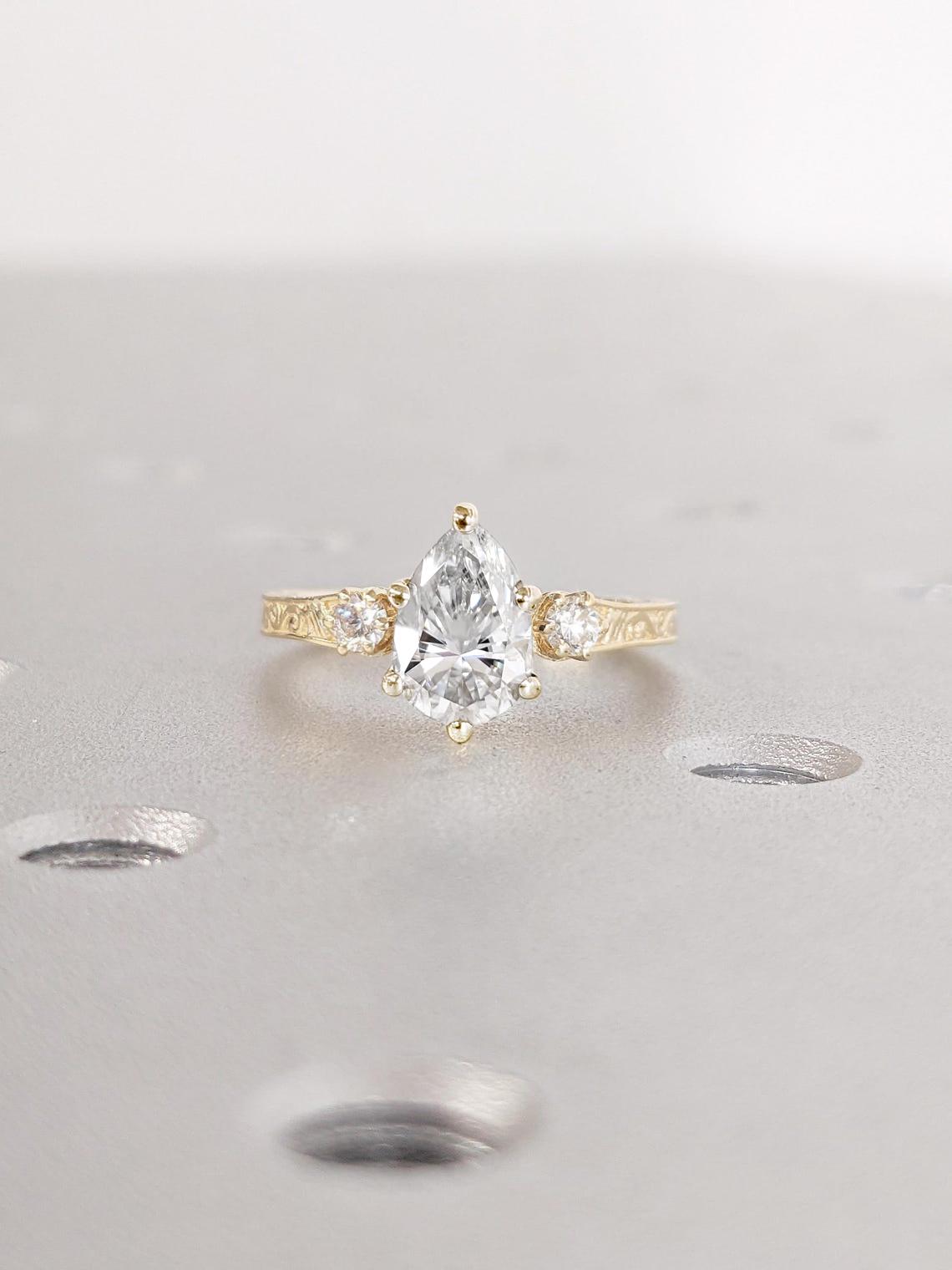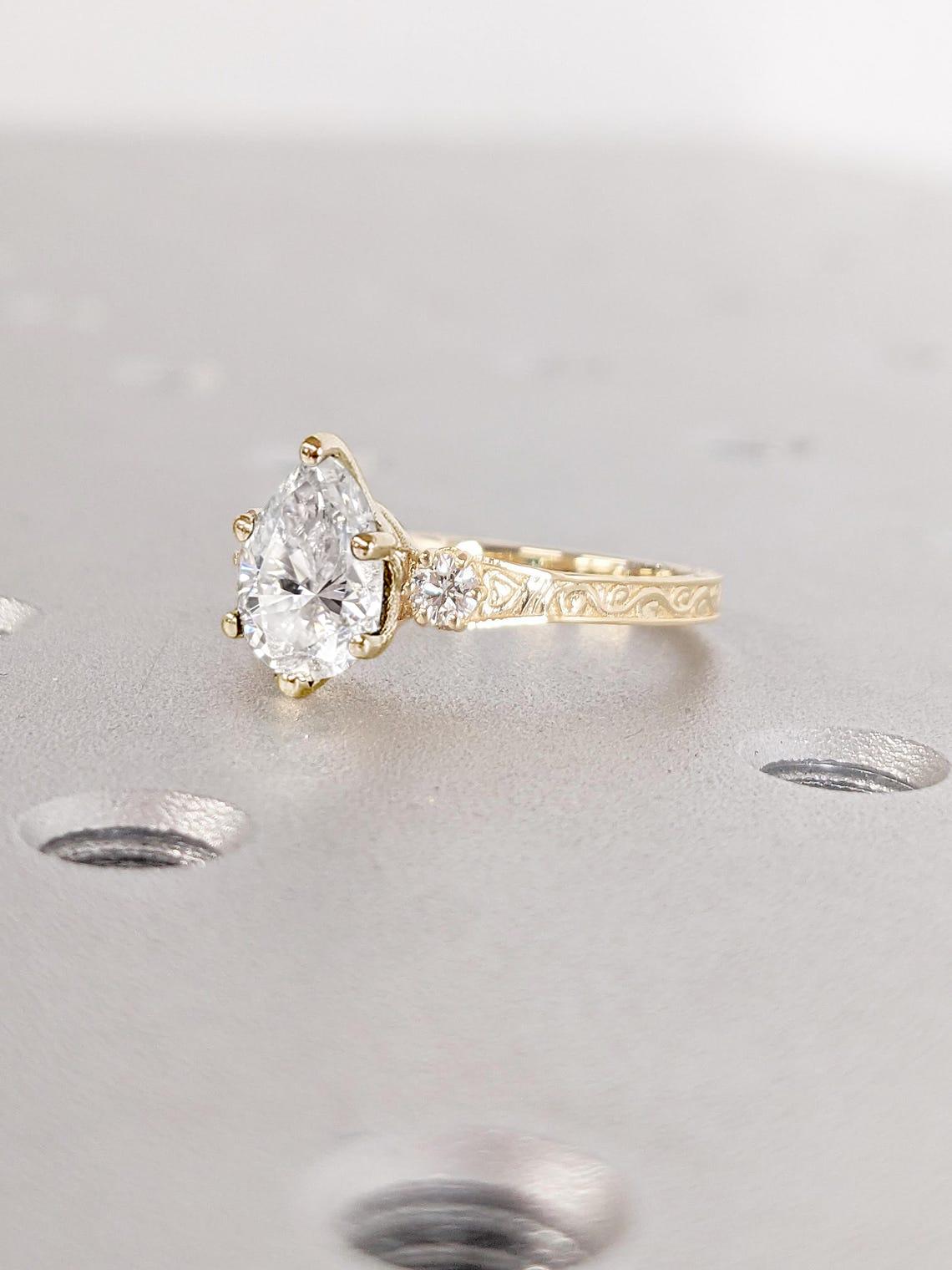 1, 2 Carat Pear cut CVD Diamond Vintage Engagement Ring | 18k Yellow Gold Rings for Women | Handmade Filigree Wedding Ring, Three Stone Ring