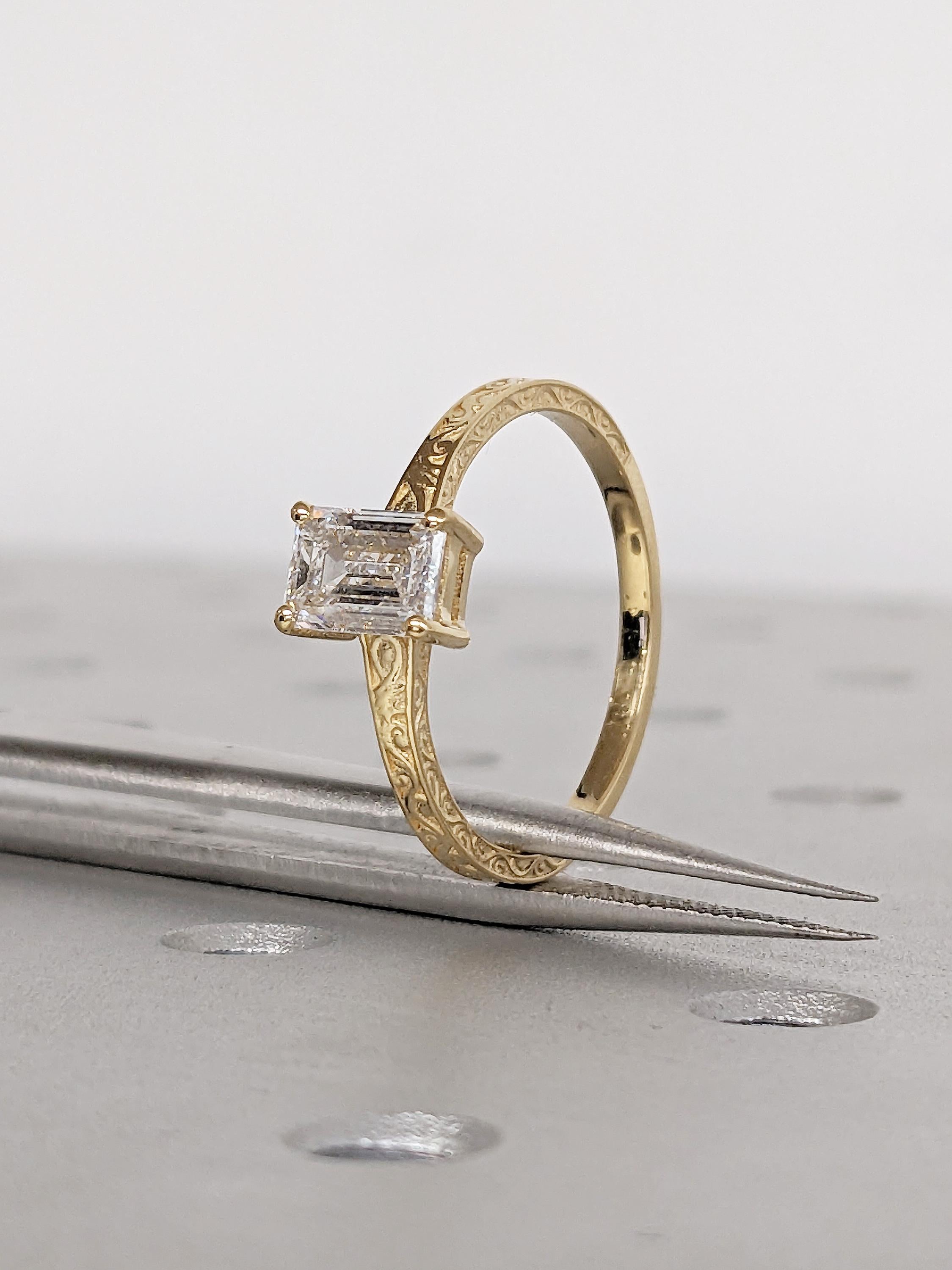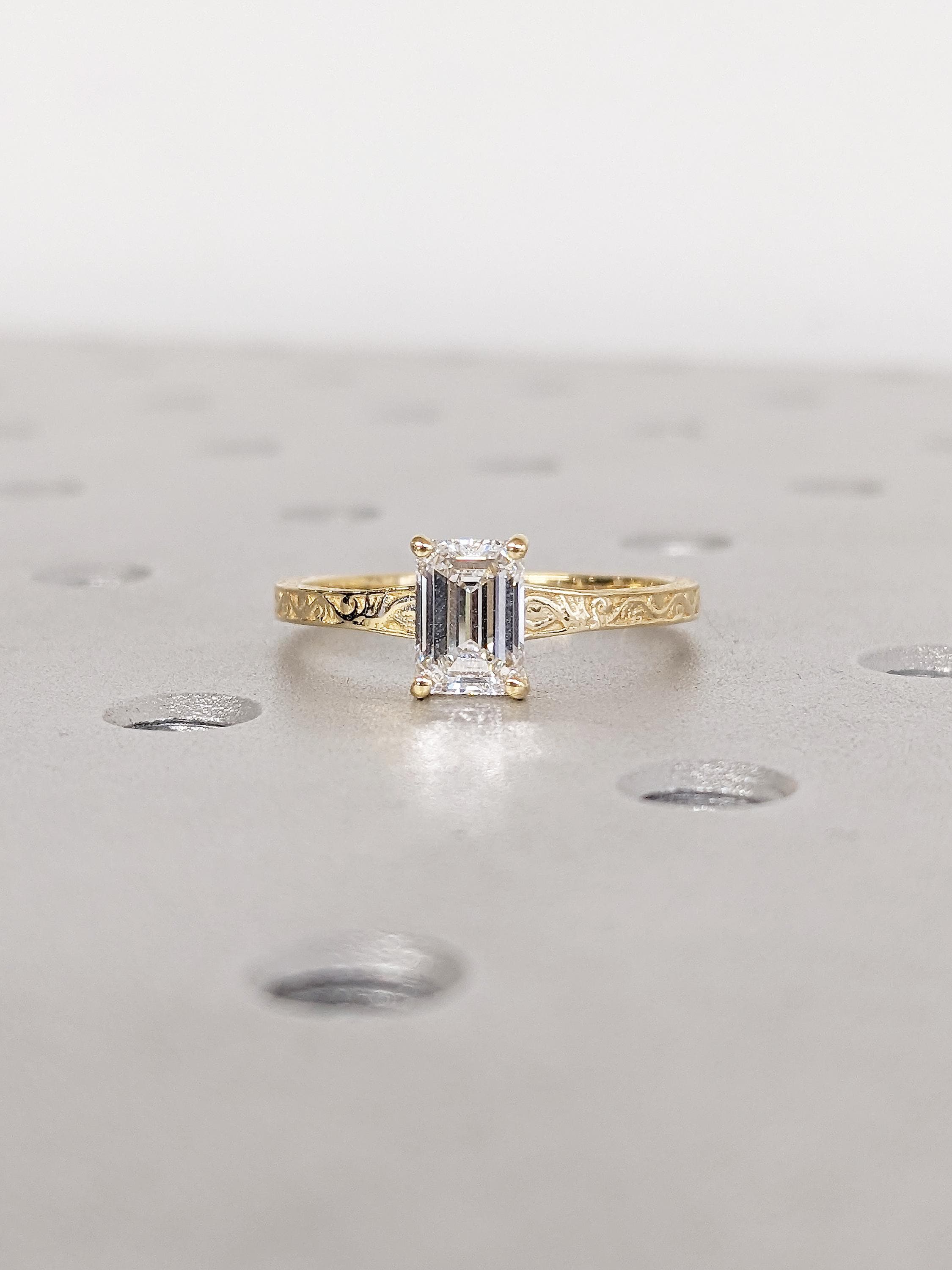 1, 2Ct Emerald Cut Moissanite Engagement Ring, Dainty 18k Yellow Gold Filigree Ring