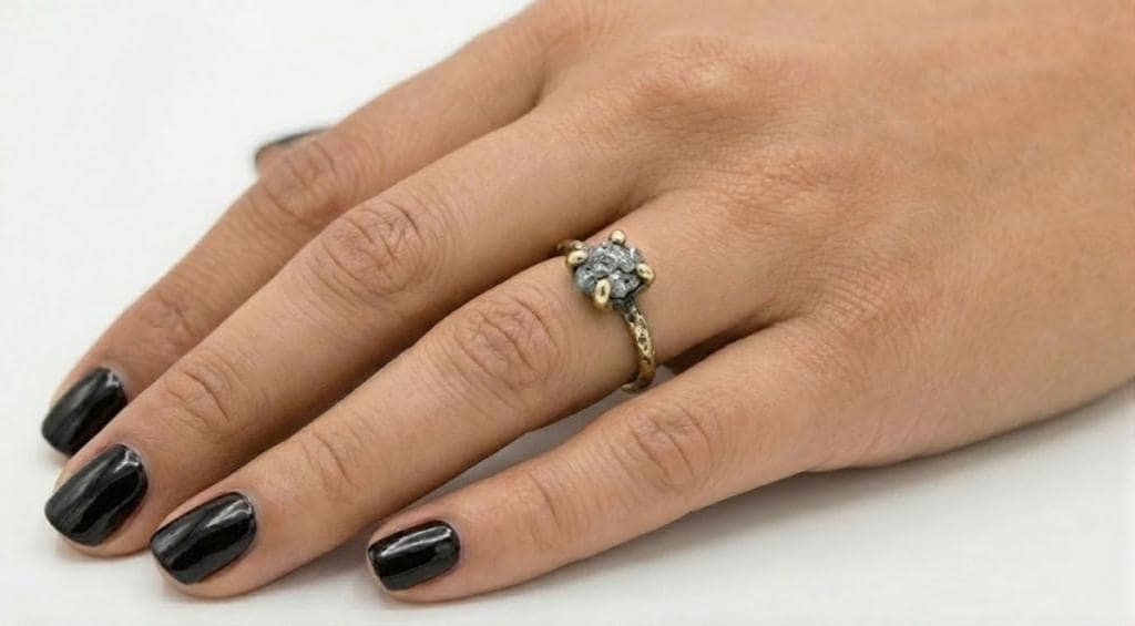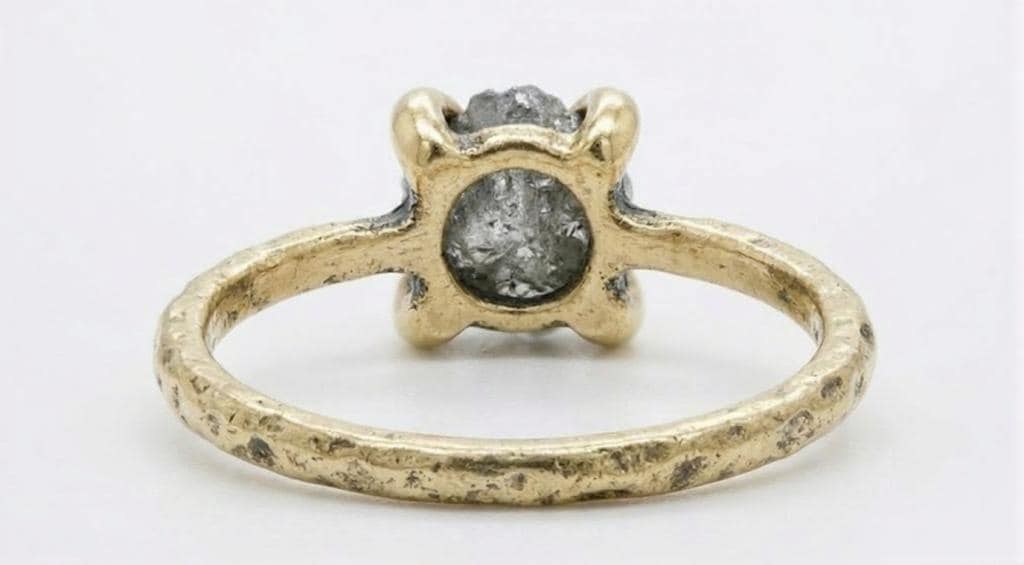 This rough, uncut Salt and Pepper Diamond ring celebrates natural beauty in its purest form. The raw diamond’s organic texture is secured by bold prongs, giving the piece an earthy, one-of-a-kind charm. It rests on a 1.5mm hammered gold band, adding artisanal character and subtle shimmer with every movement. Perfect for the bride who appreciates unique, natural design over traditional sparkle.