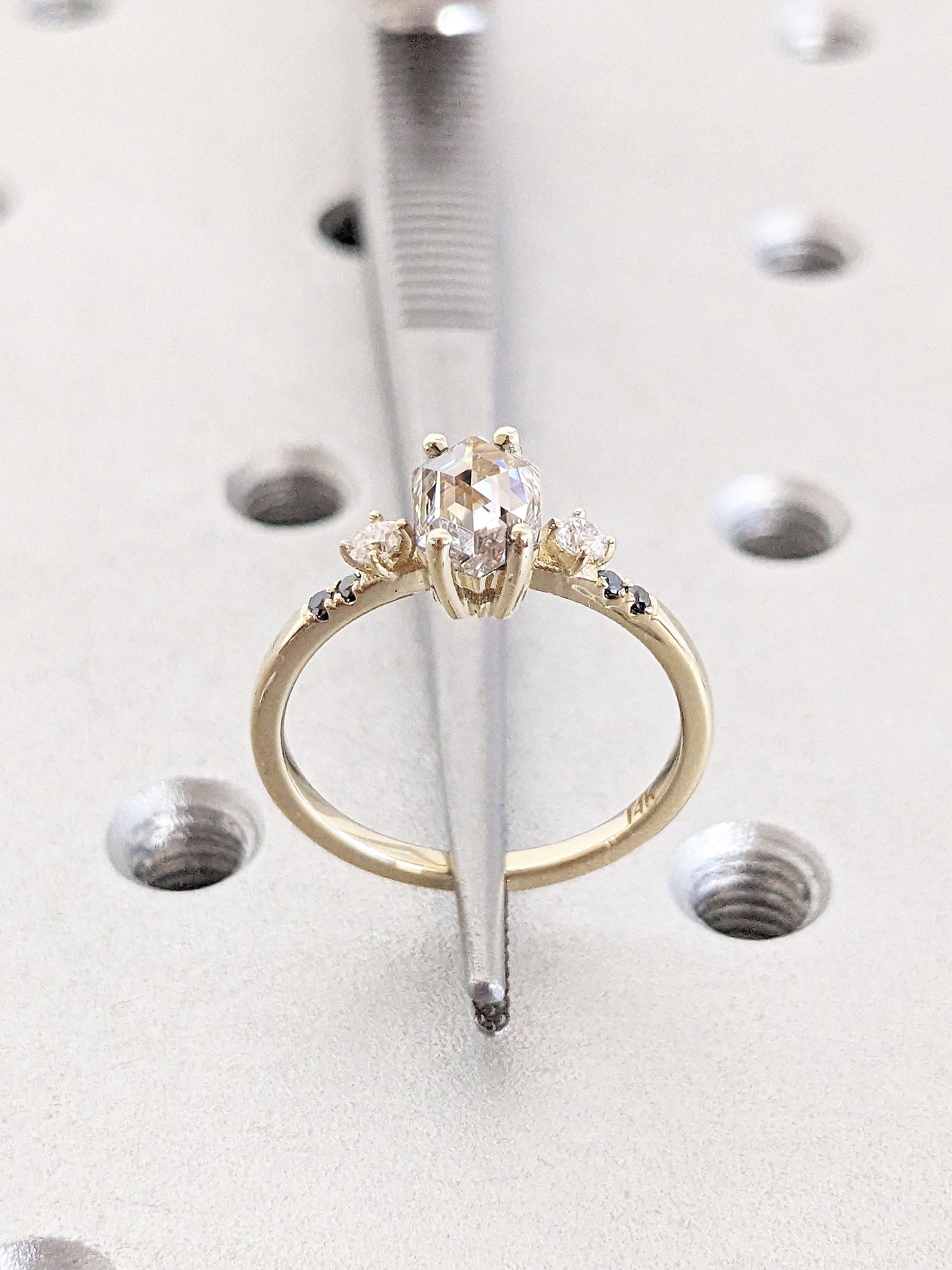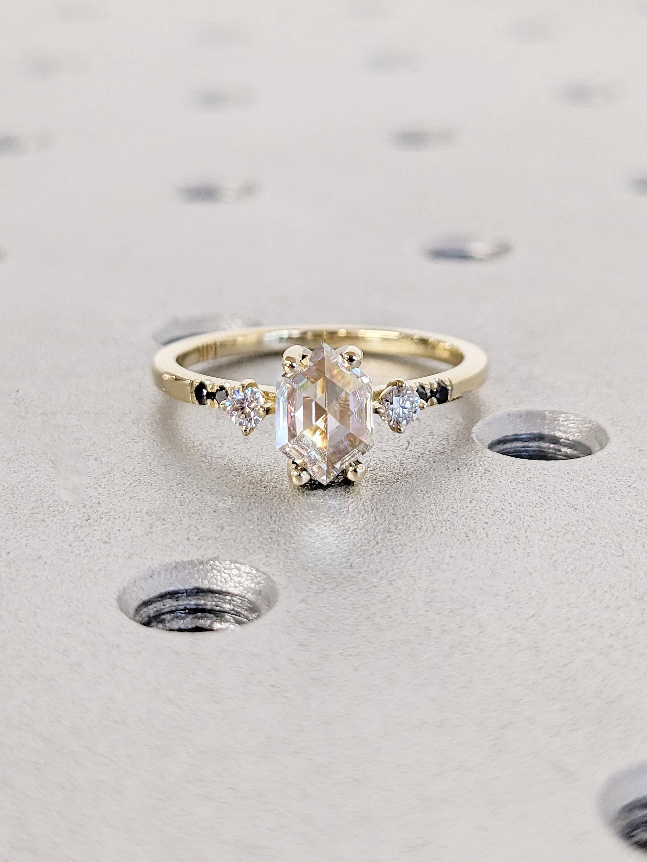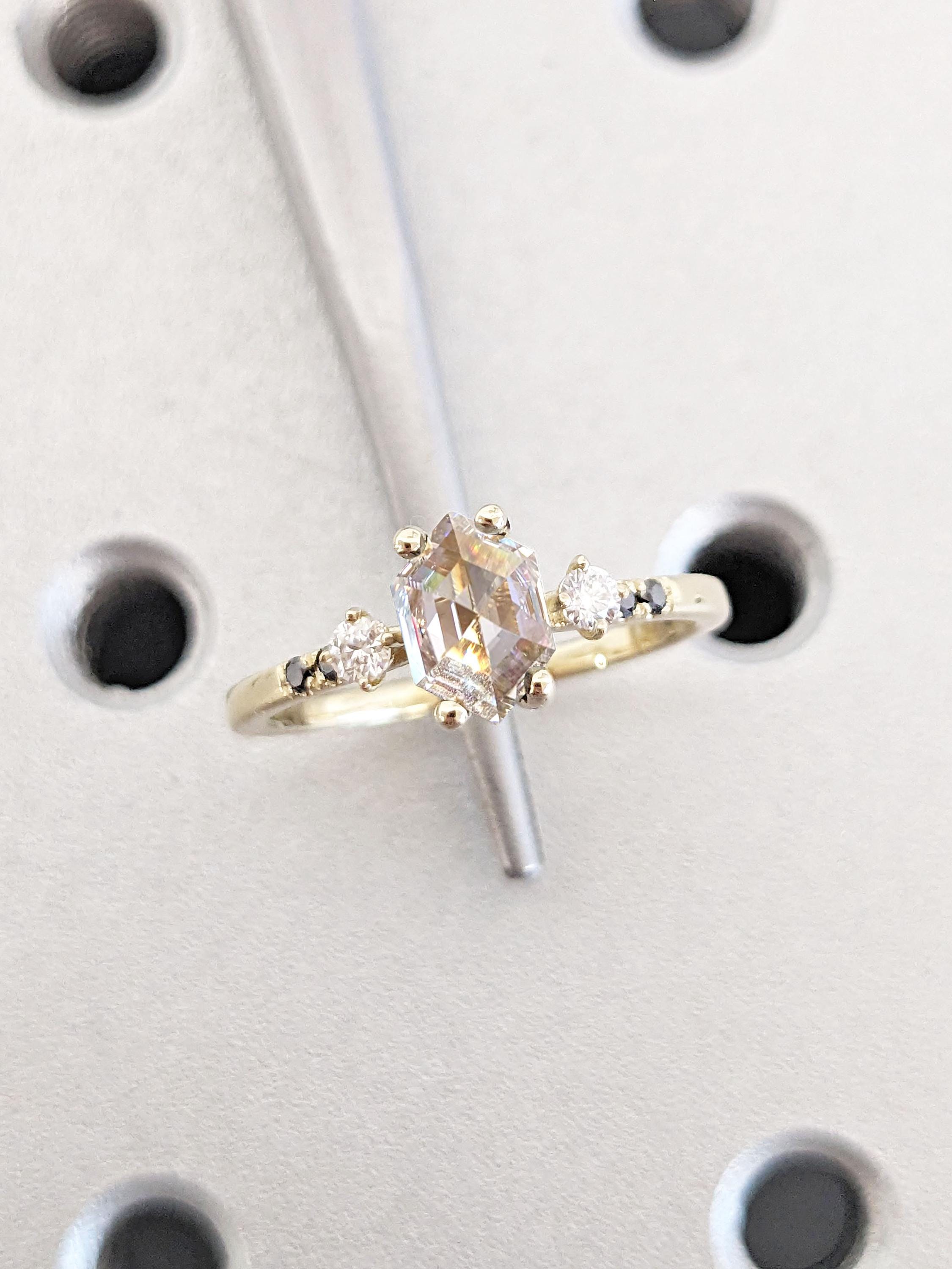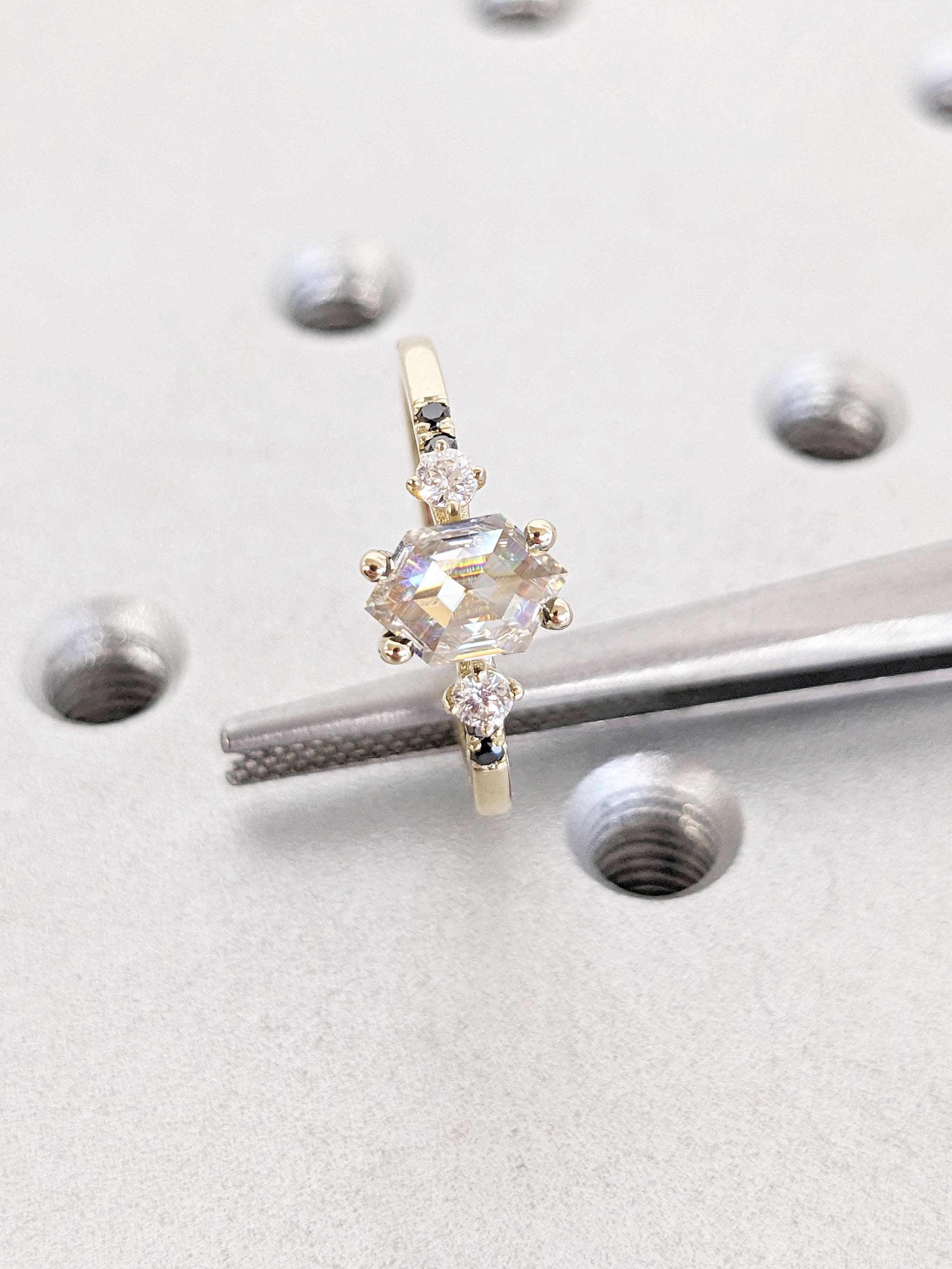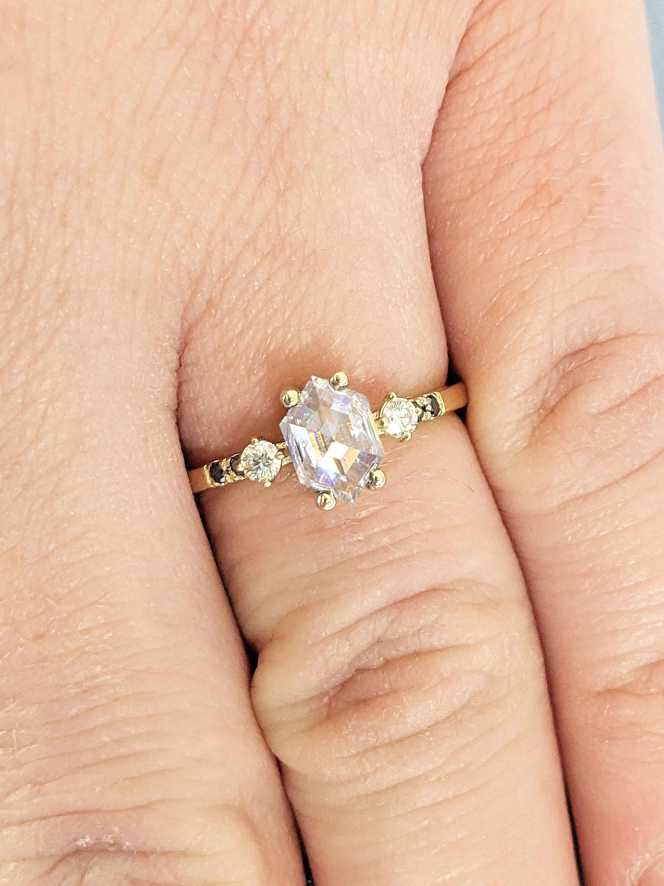 Delicate and timeless, this handmade ring features a geometrical hexagon cut Moissanite focal stone, accented by round cut white and black diamonds. With a thin band of 1.5mm width, this sophisticated ring is the perfect gift for engagement, wedding anniversary or birthday.
