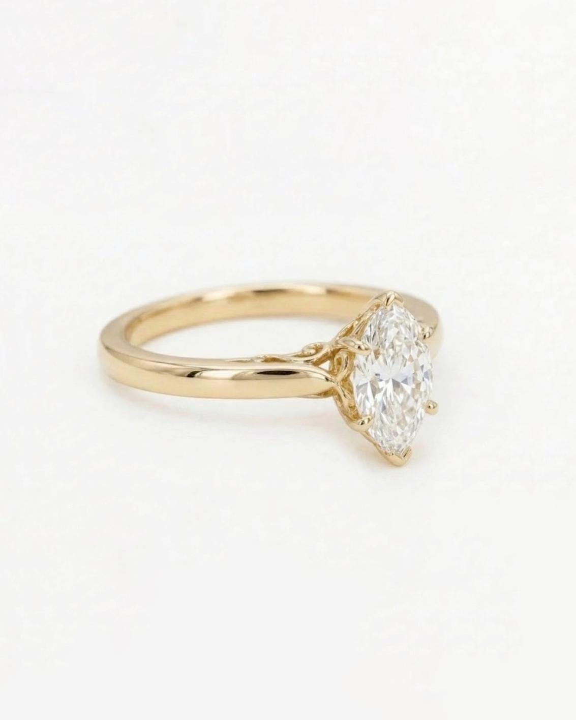 This timeless and elegant solitaire ring showcases a striking marquise cut Moissanite, loved for its elongated silhouette and brilliant sparkle. Beneath the center stone, the ring features delicate filigree motifs on the bridge, and flows subtly toward the shank. These ornamental details add a romantic, vintage-inspired touch while keeping the overall design clean and sophisticated. Perfect for anyone who wants a solitaire with subtle artistry, this ring balances modern elegance with classic craftsmanship.