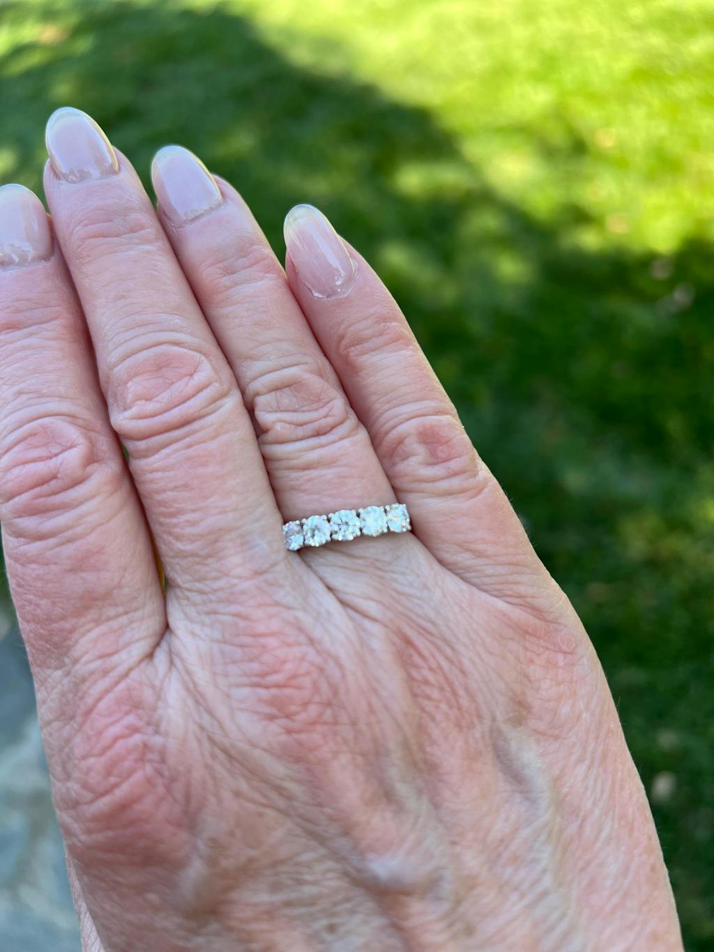 This hand made ring is crafted of the finest quality 14k gold. A design of everlasting bliss, the pure elegance of this wedding band with 5 4mm diamonds/ moissonaite gemstones, epic sparkle!