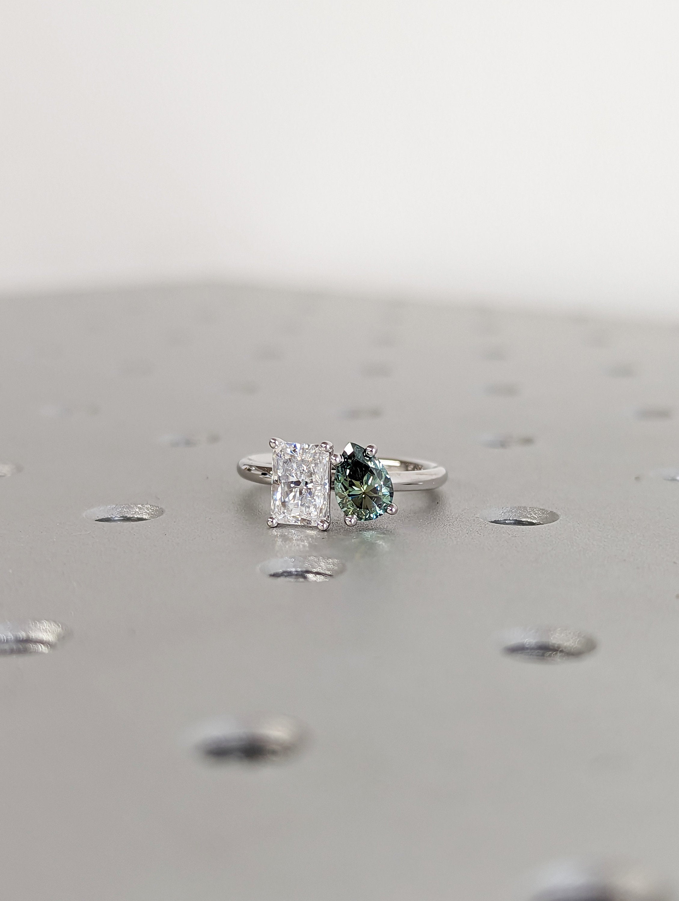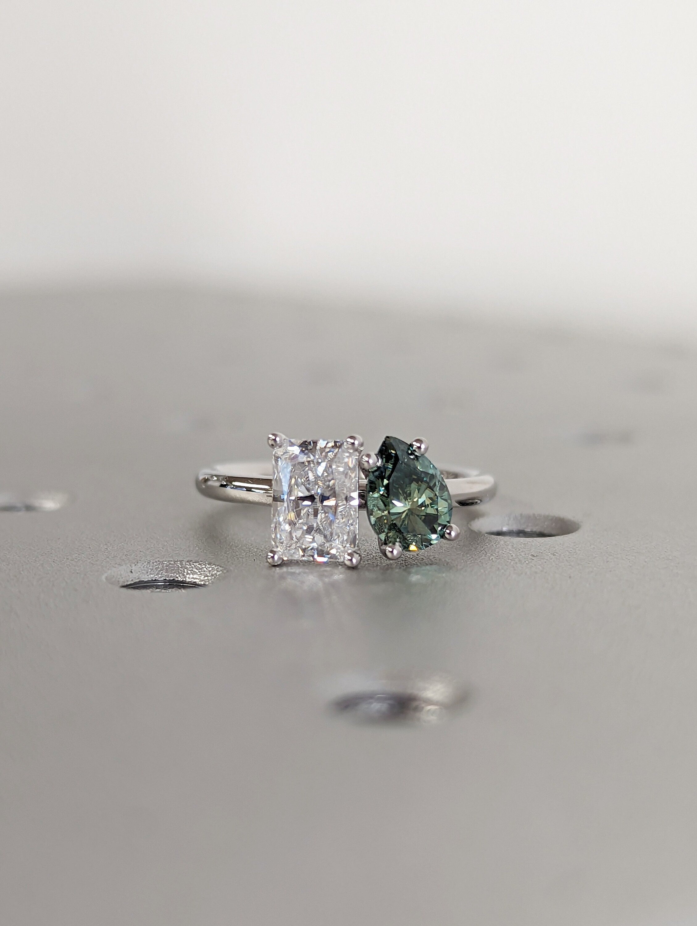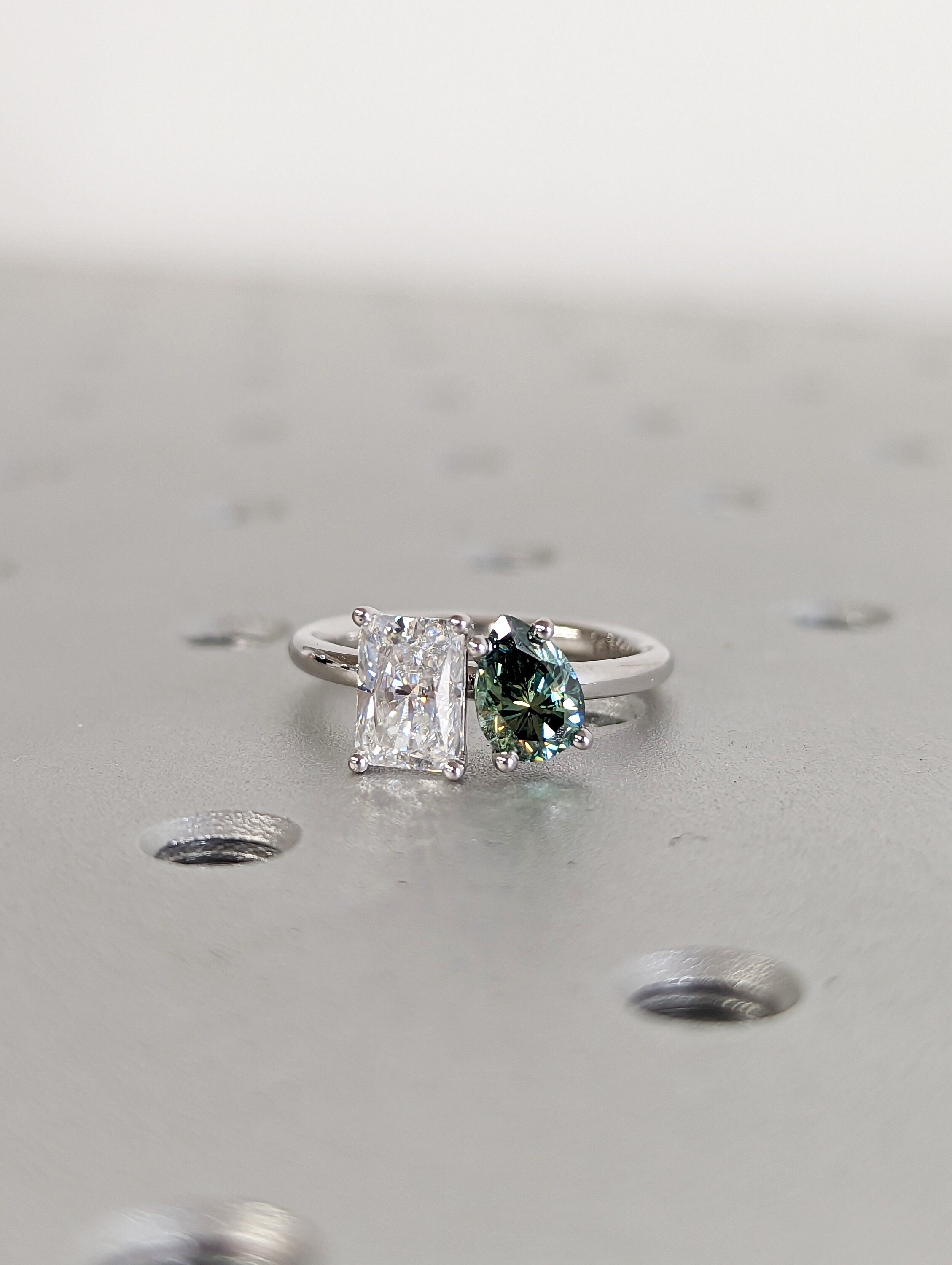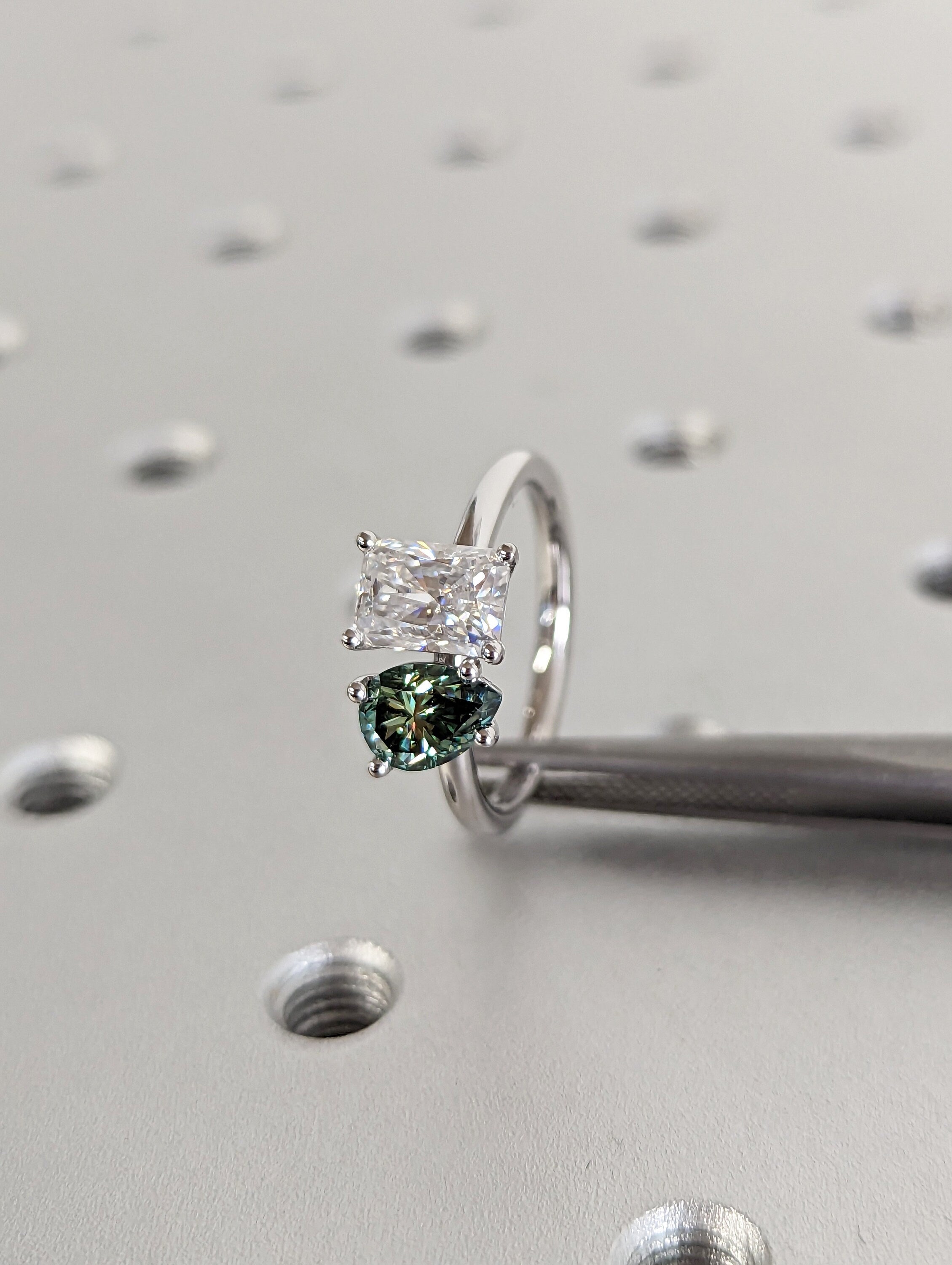 A beautiful dual radiant and pear shaped moissanites, set with a super delicate and thin setting the unique and delicate