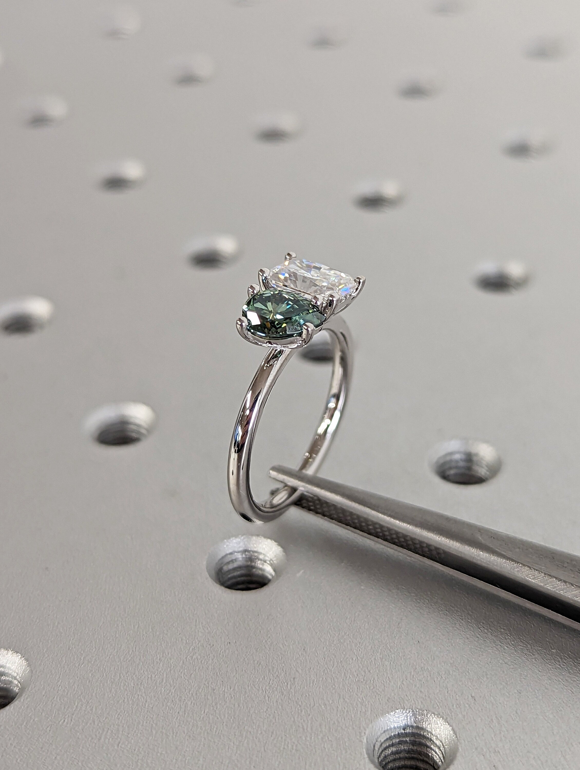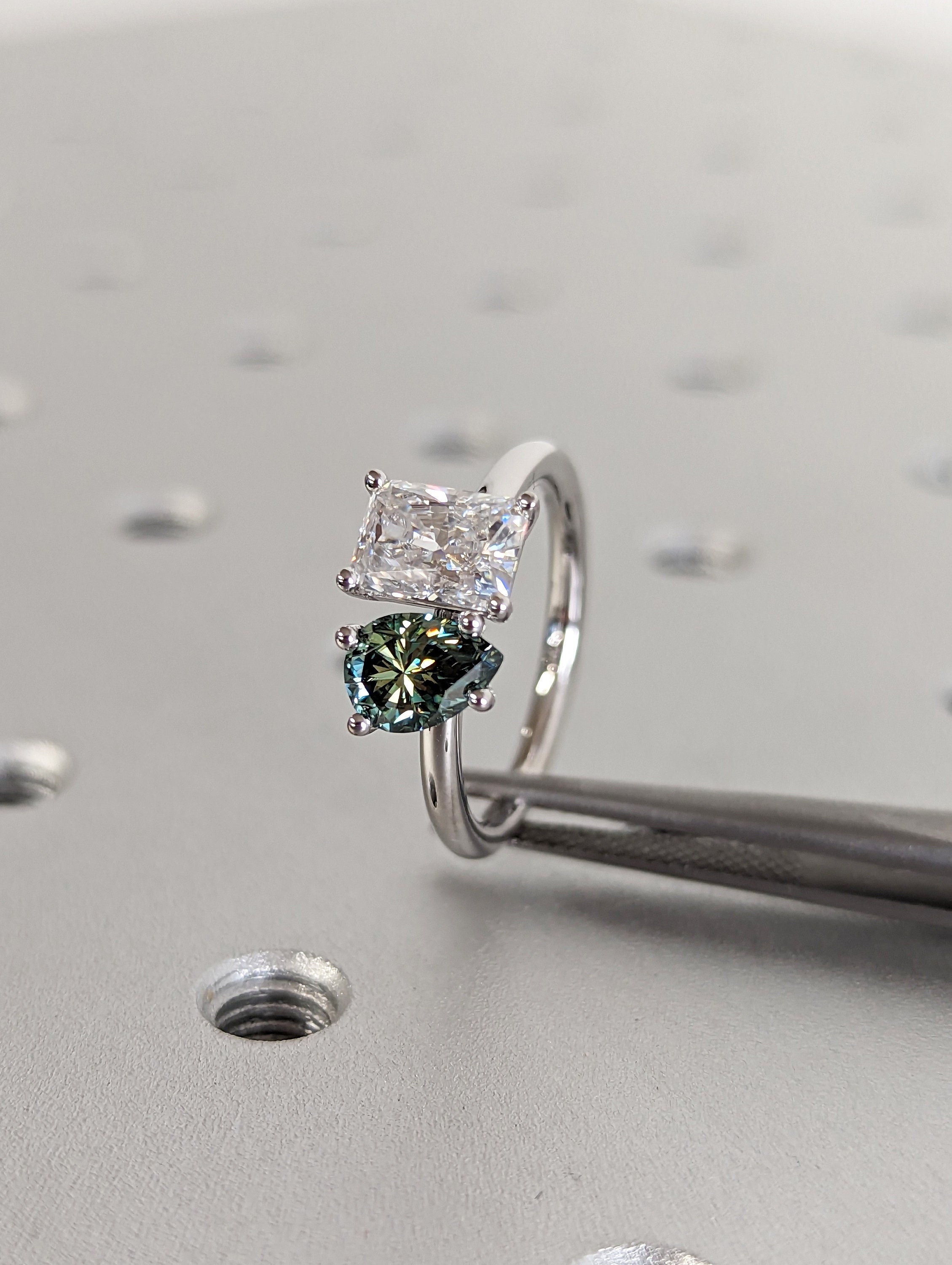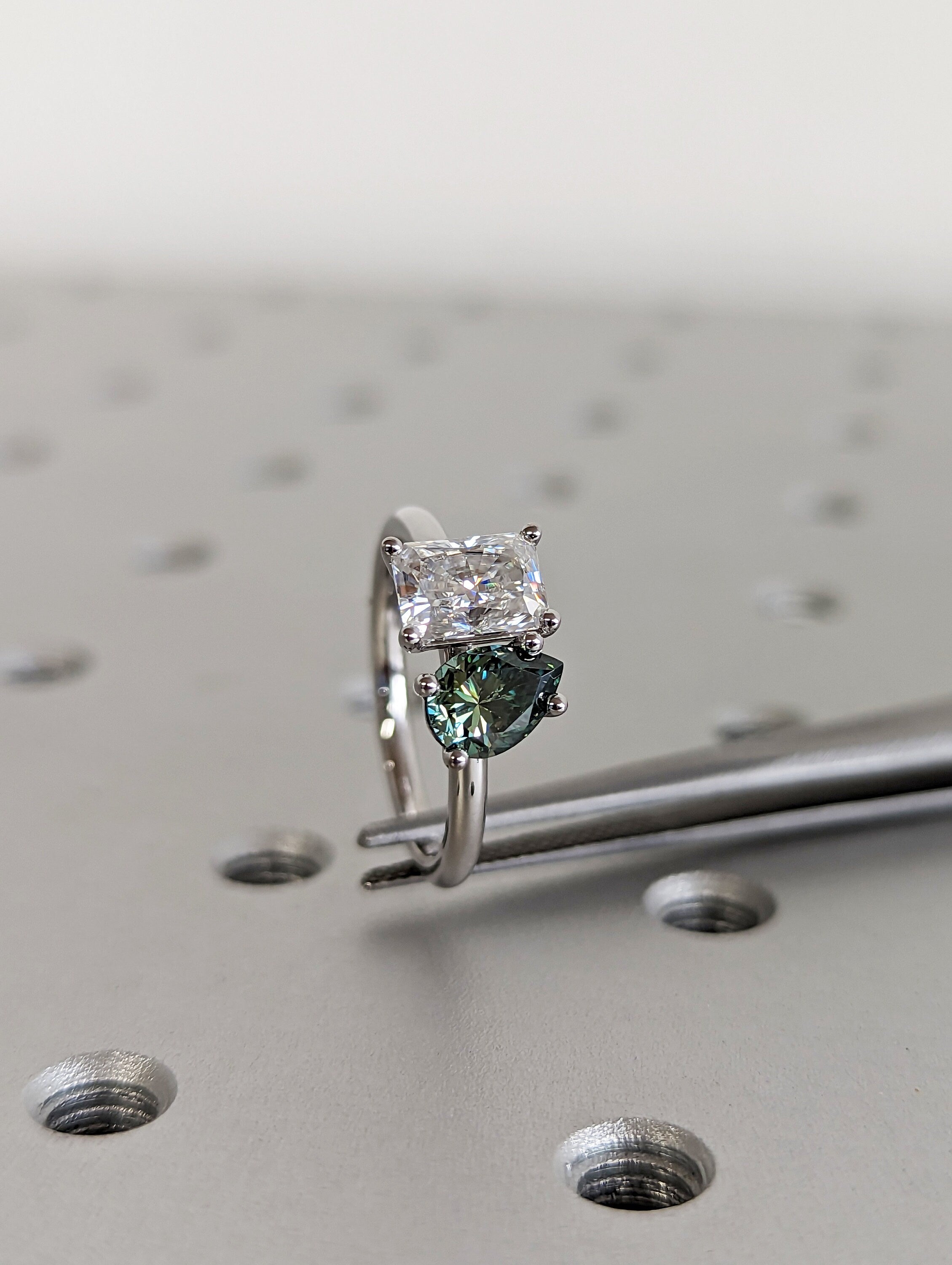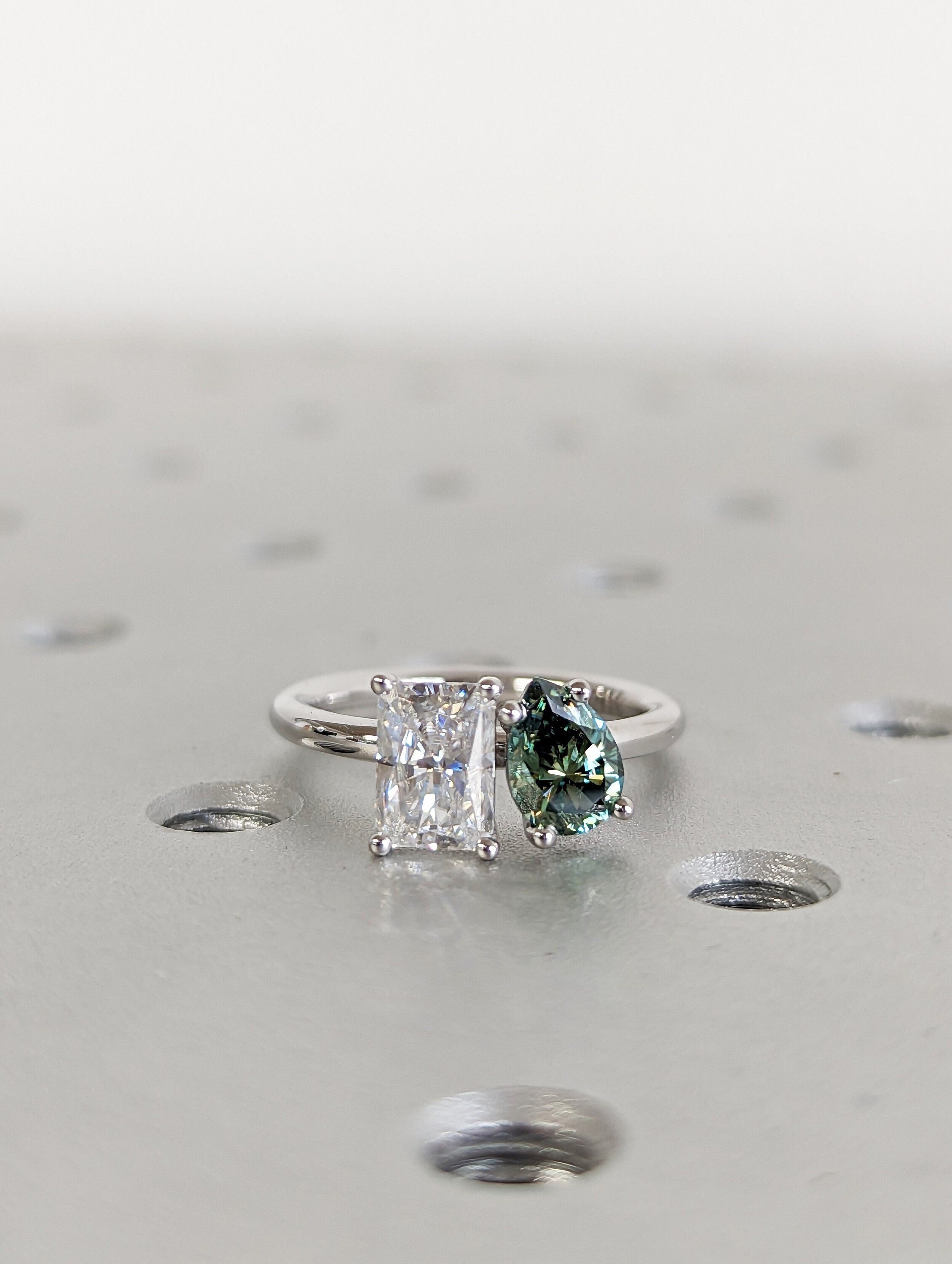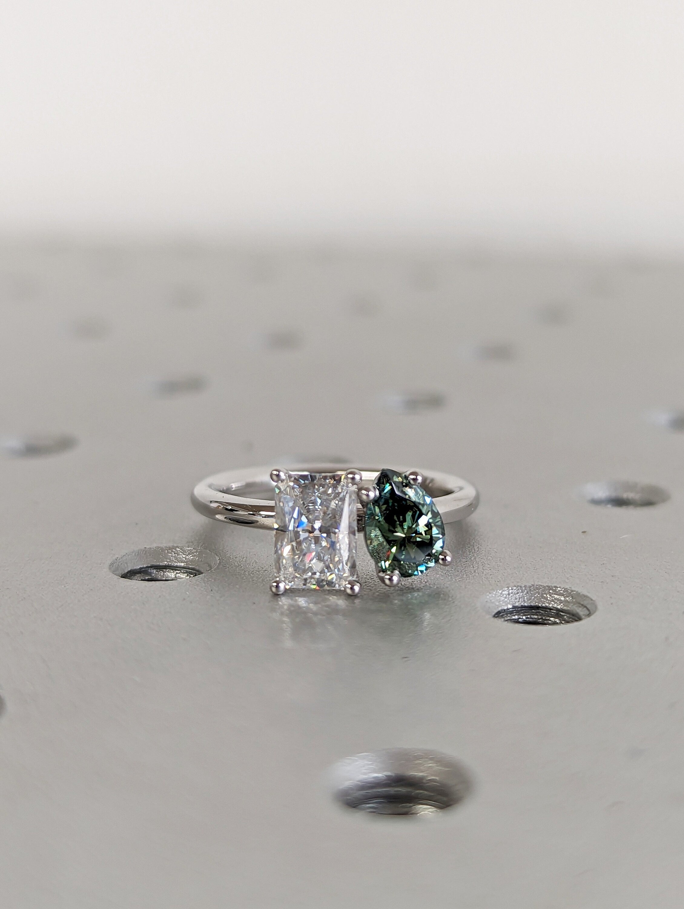 A beautiful dual radiant and pear shaped moissanites, set with a super delicate and thin setting the unique and delicate