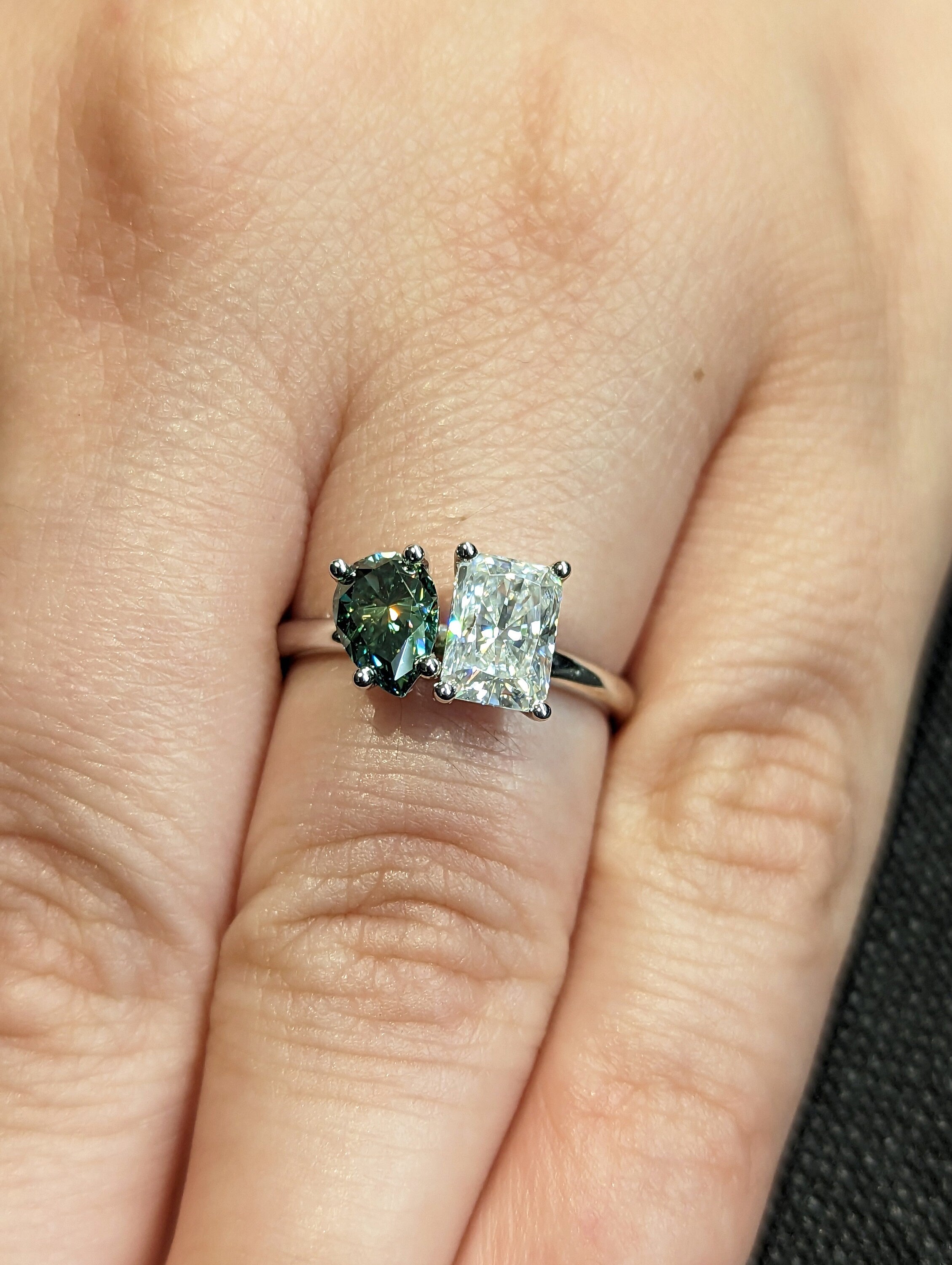1 Carat Double Stone Engagement Ring Green Pear Cut and Radiant Cut Moissanite Two Stone Wedding Ring 14K White Yellow Rose Gold
