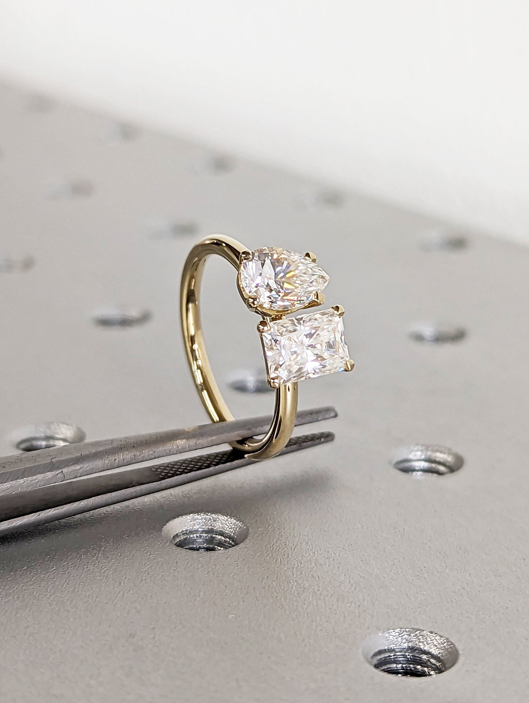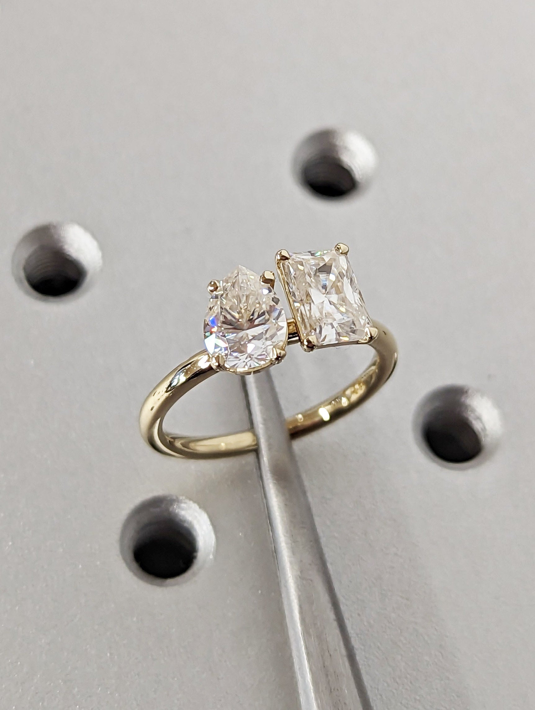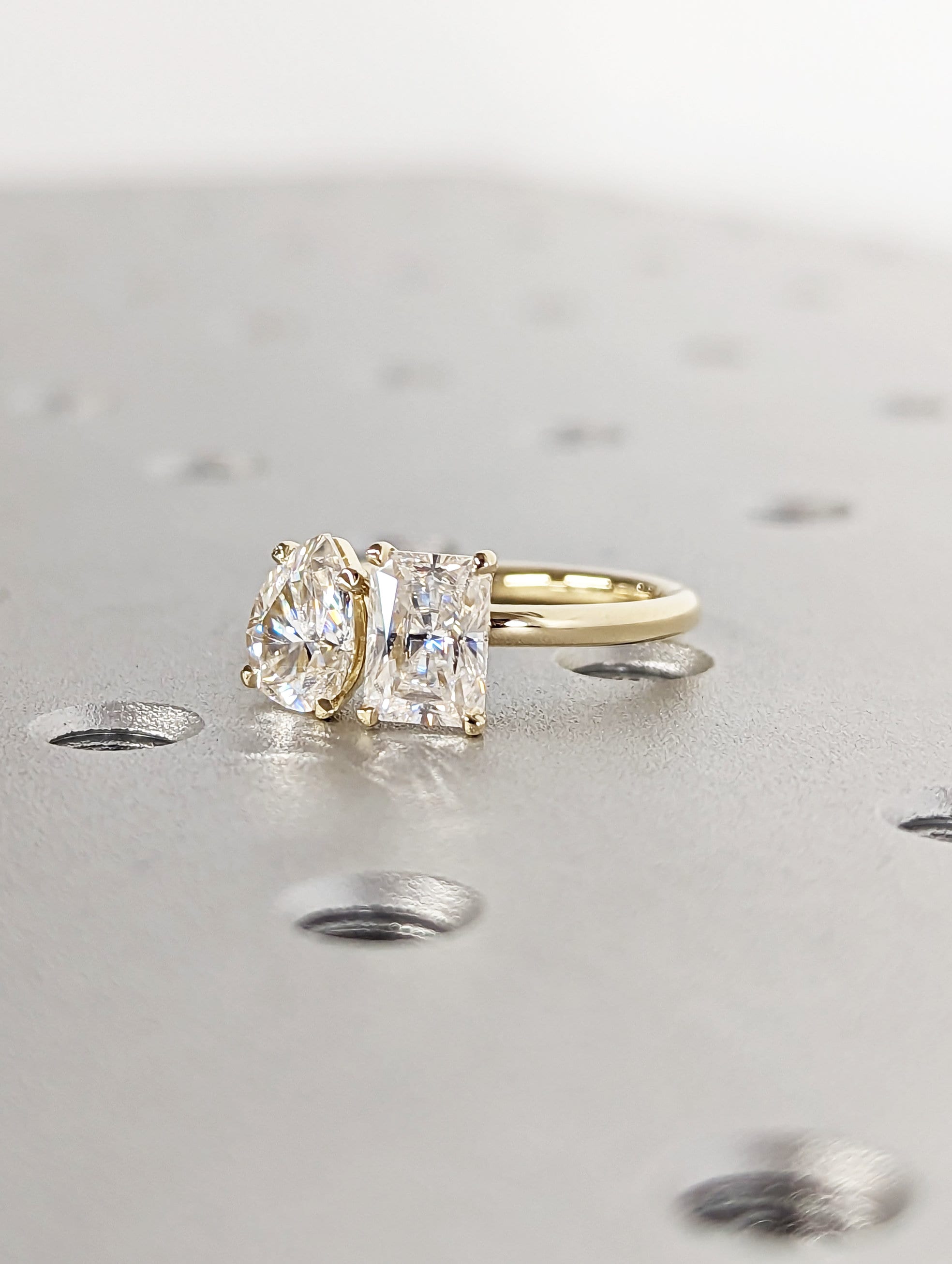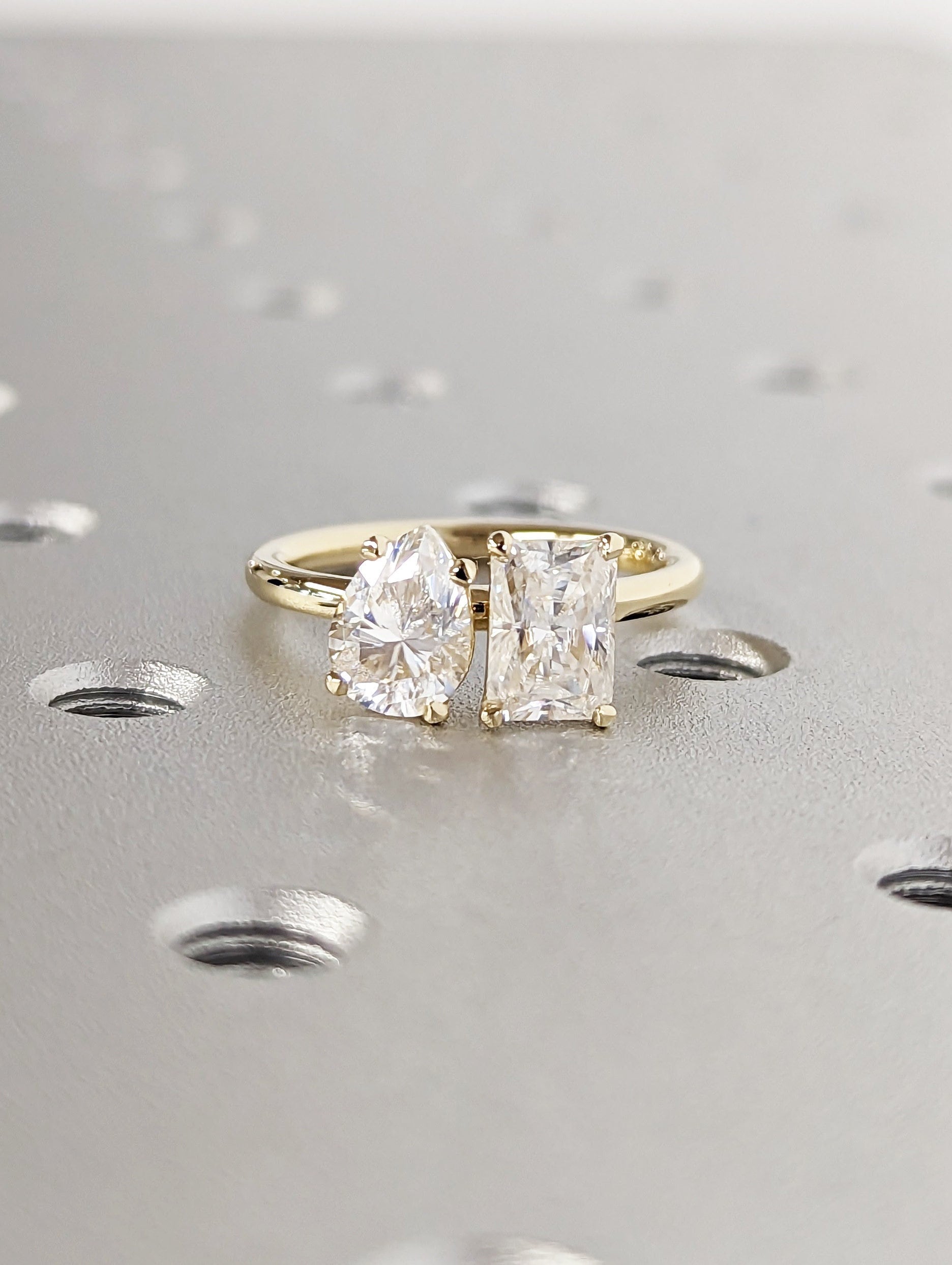 A beautiful dual radiant and pear shaped moissanites, set with a super delicate and thin setting the unique and delicate