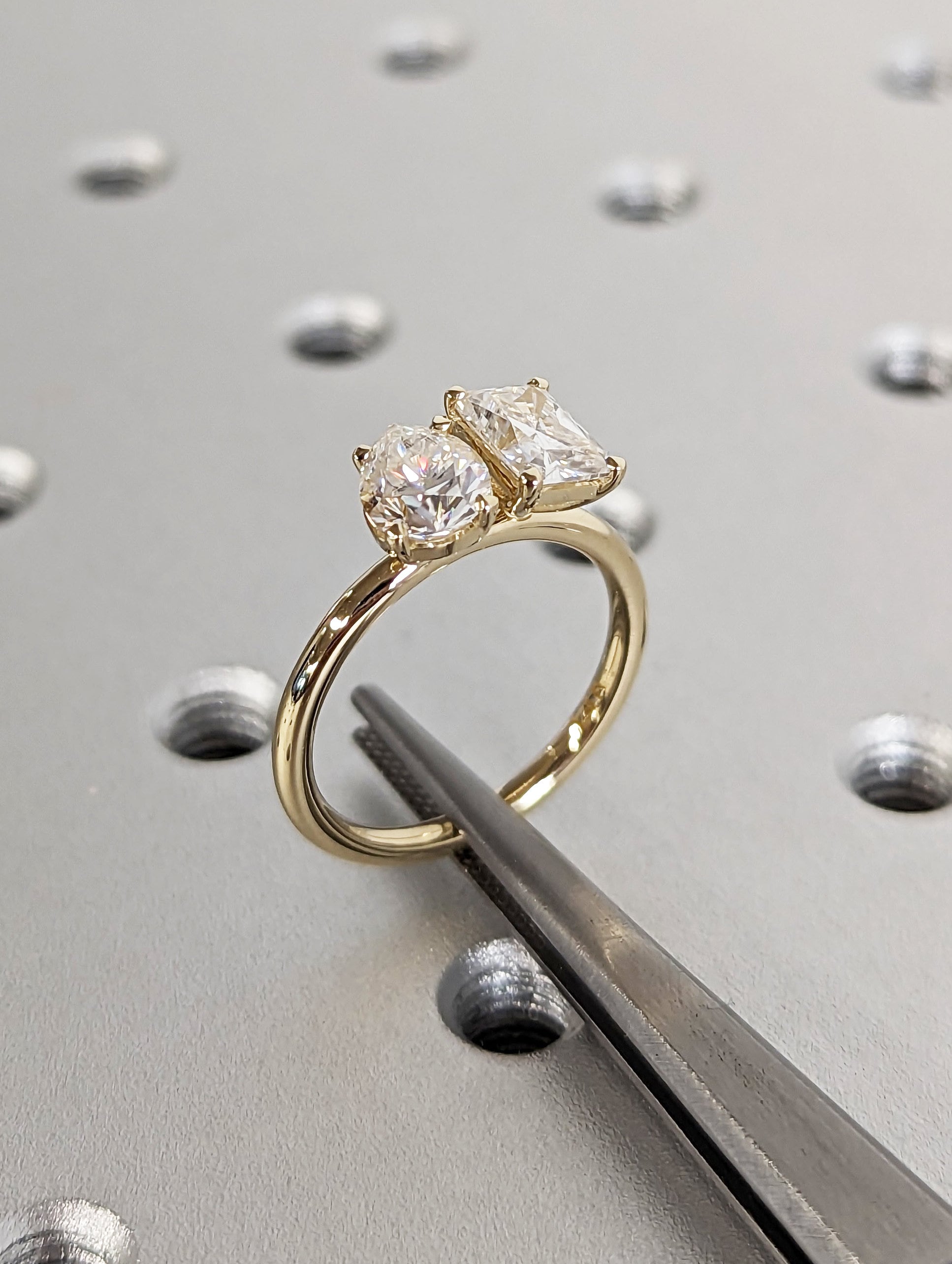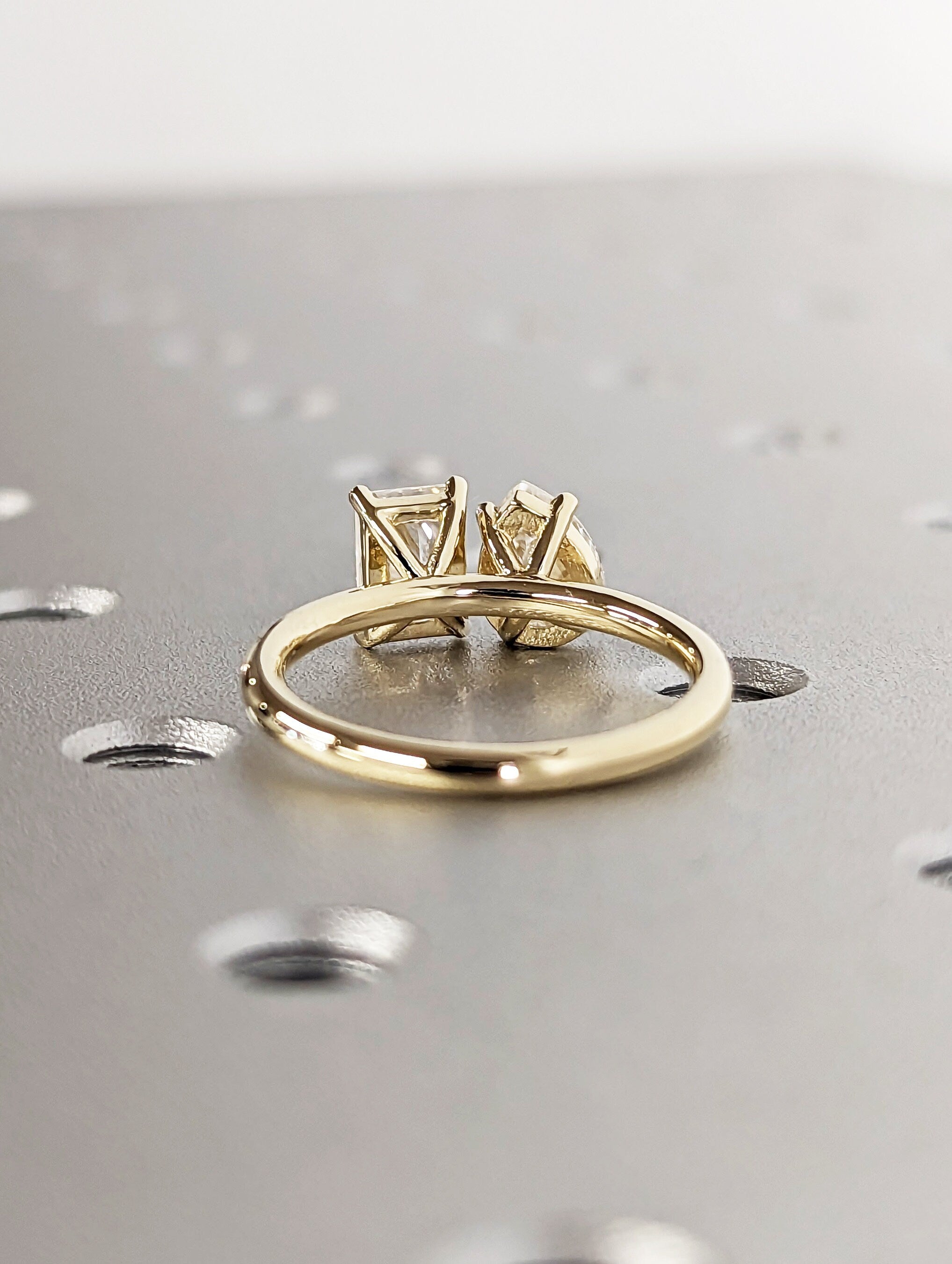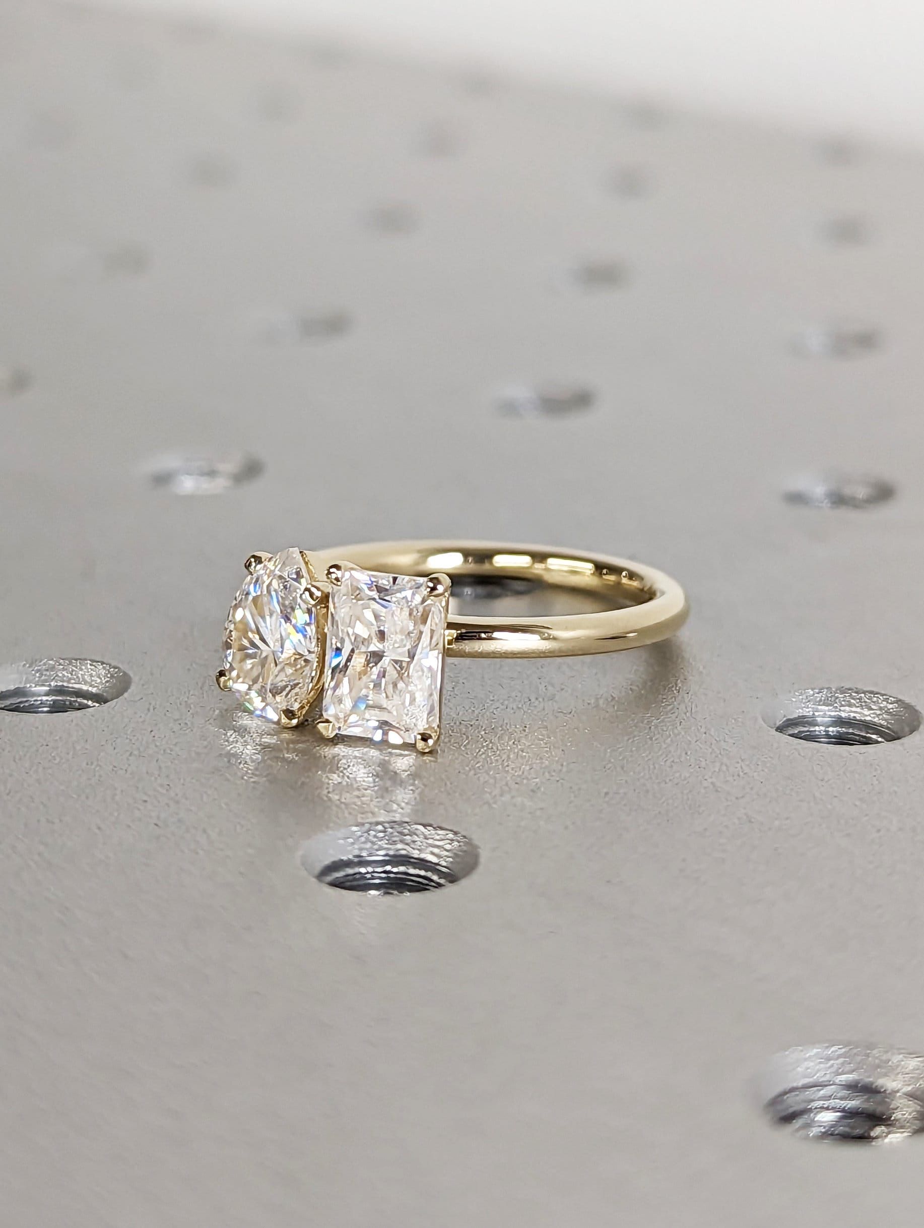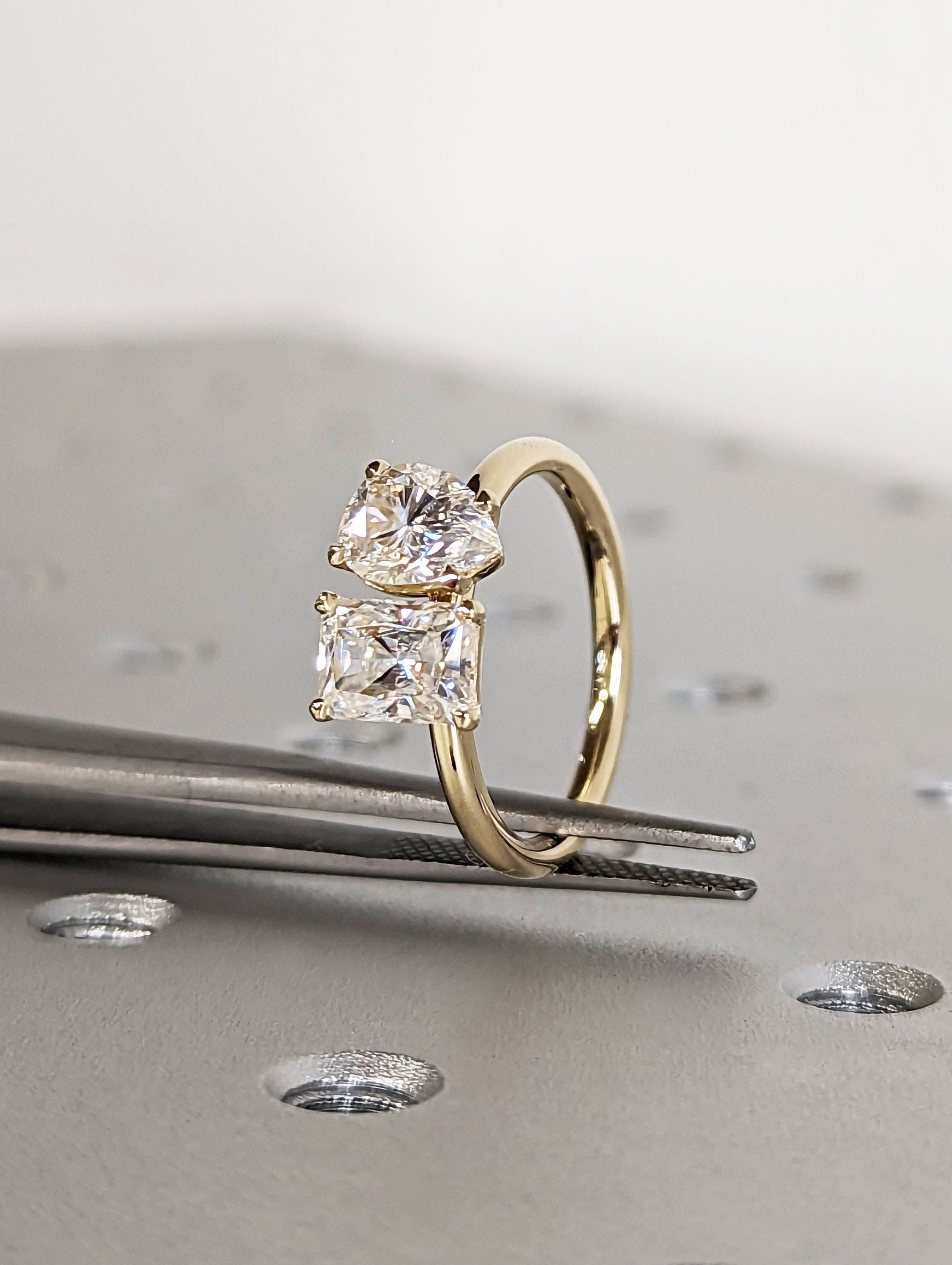 A beautiful dual radiant and pear shaped moissanites, set with a super delicate and thin setting the unique and delicate