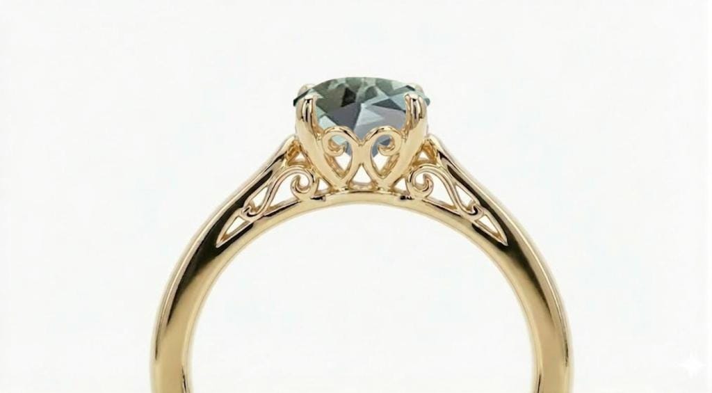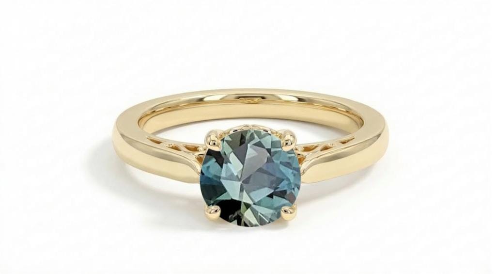 This engagement ring features a captivating round Peacock Sapphire center stone that shimmers with vibrant blue-green tones. Intricate filigree detailing beneath the setting adds a romantic, vintage touch that beautifully complements the gem’s color play. Set on a slender 1.8mm–2mm gold band, it offers a graceful and refined profile. A perfect choice for anyone drawn to distinctive gemstones and elegant craftsmanship.