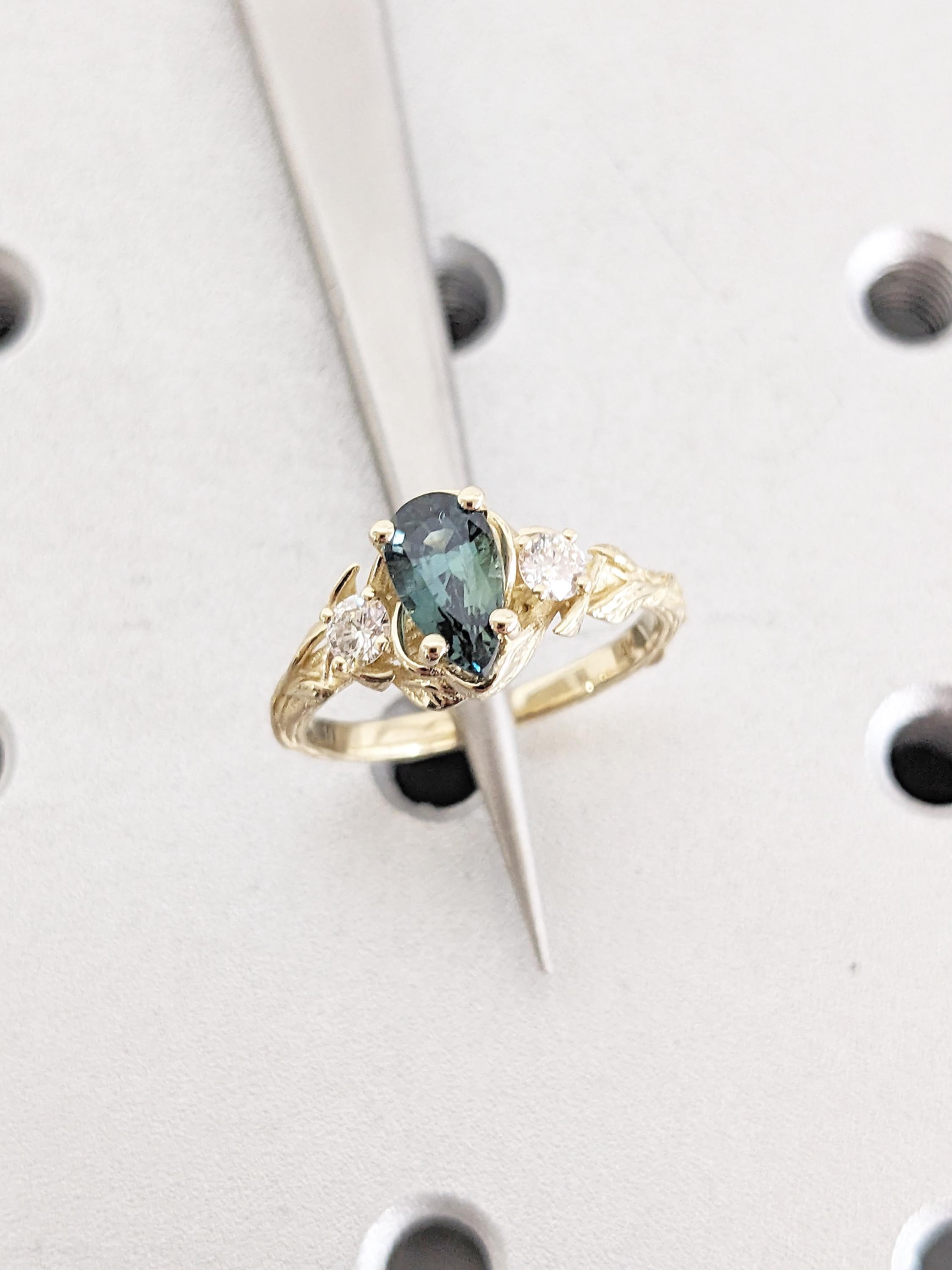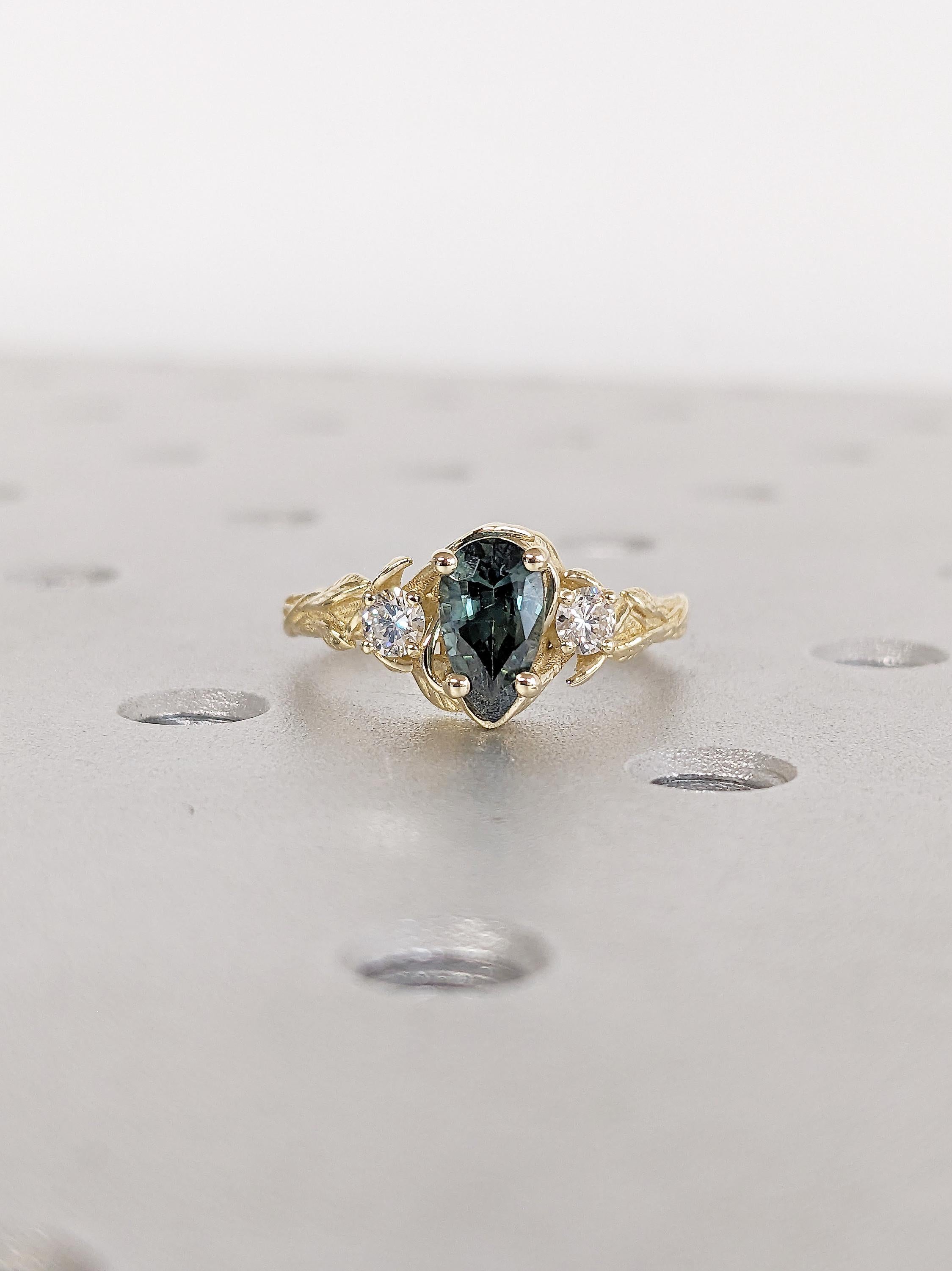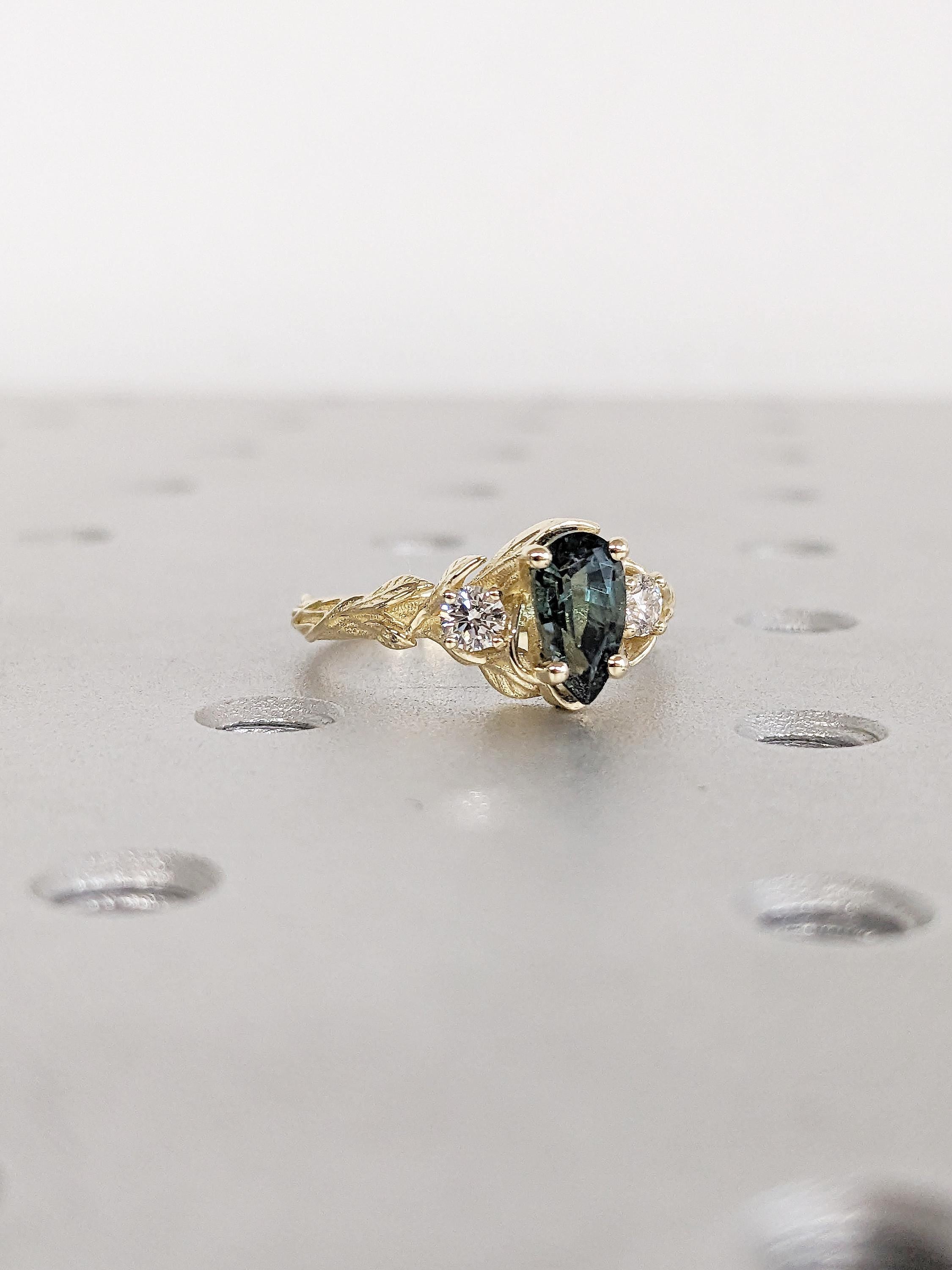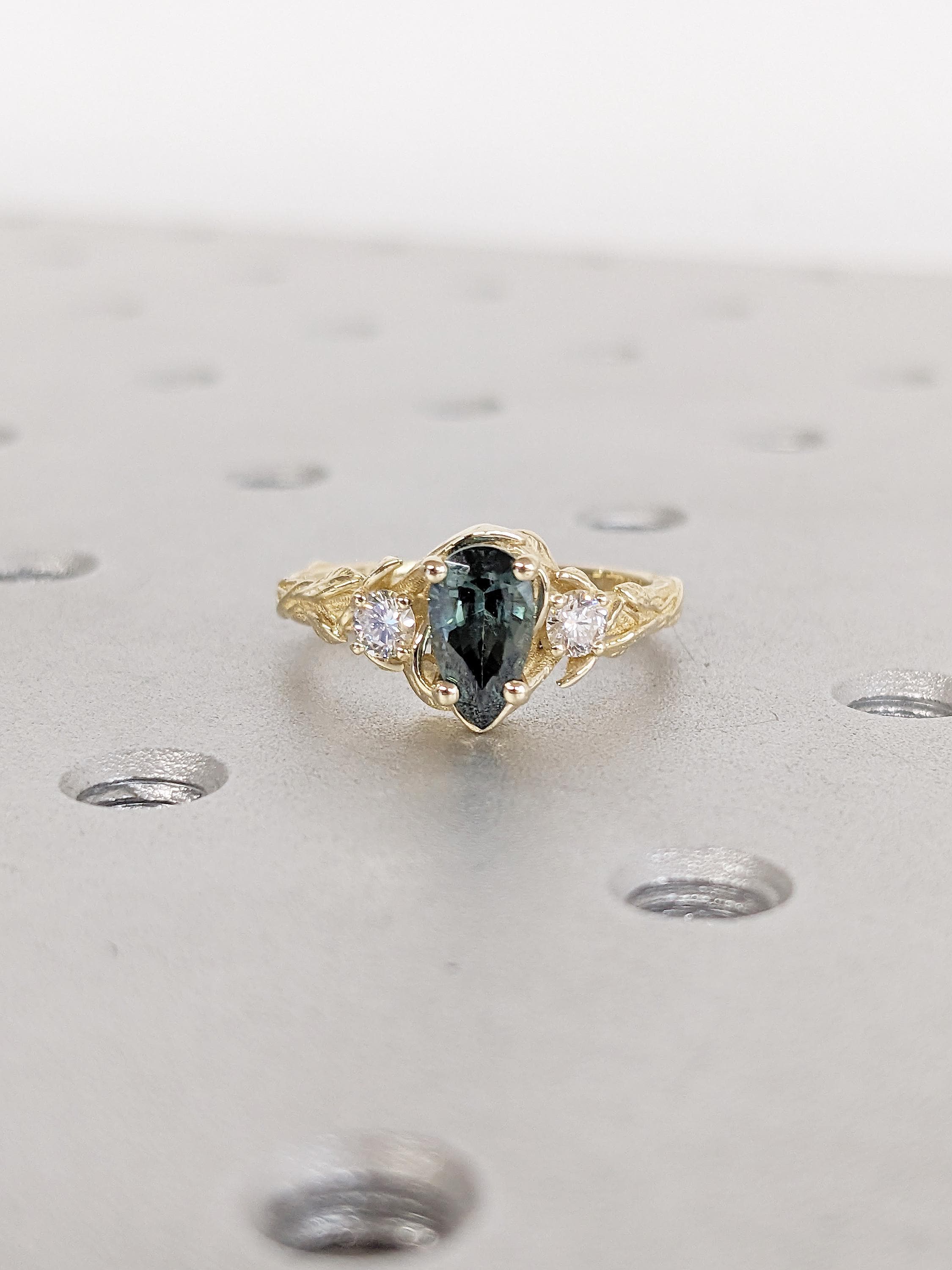 1 Carat Montana Sapphire Ring, 14k Yellow Gold Nature Inspired Pear Shaped Engagement Ring, Natural Diamond and September Birthstone Jewelry