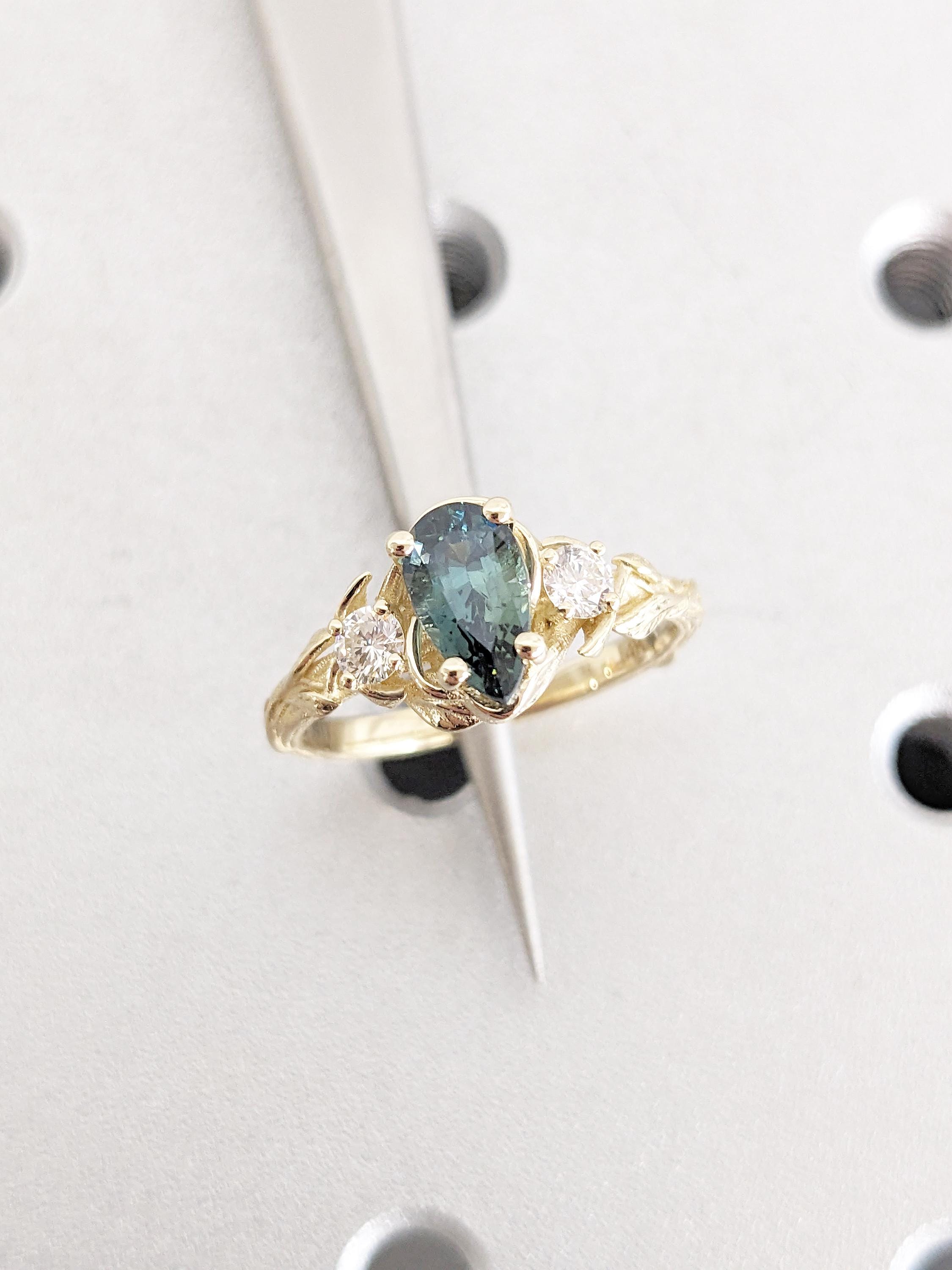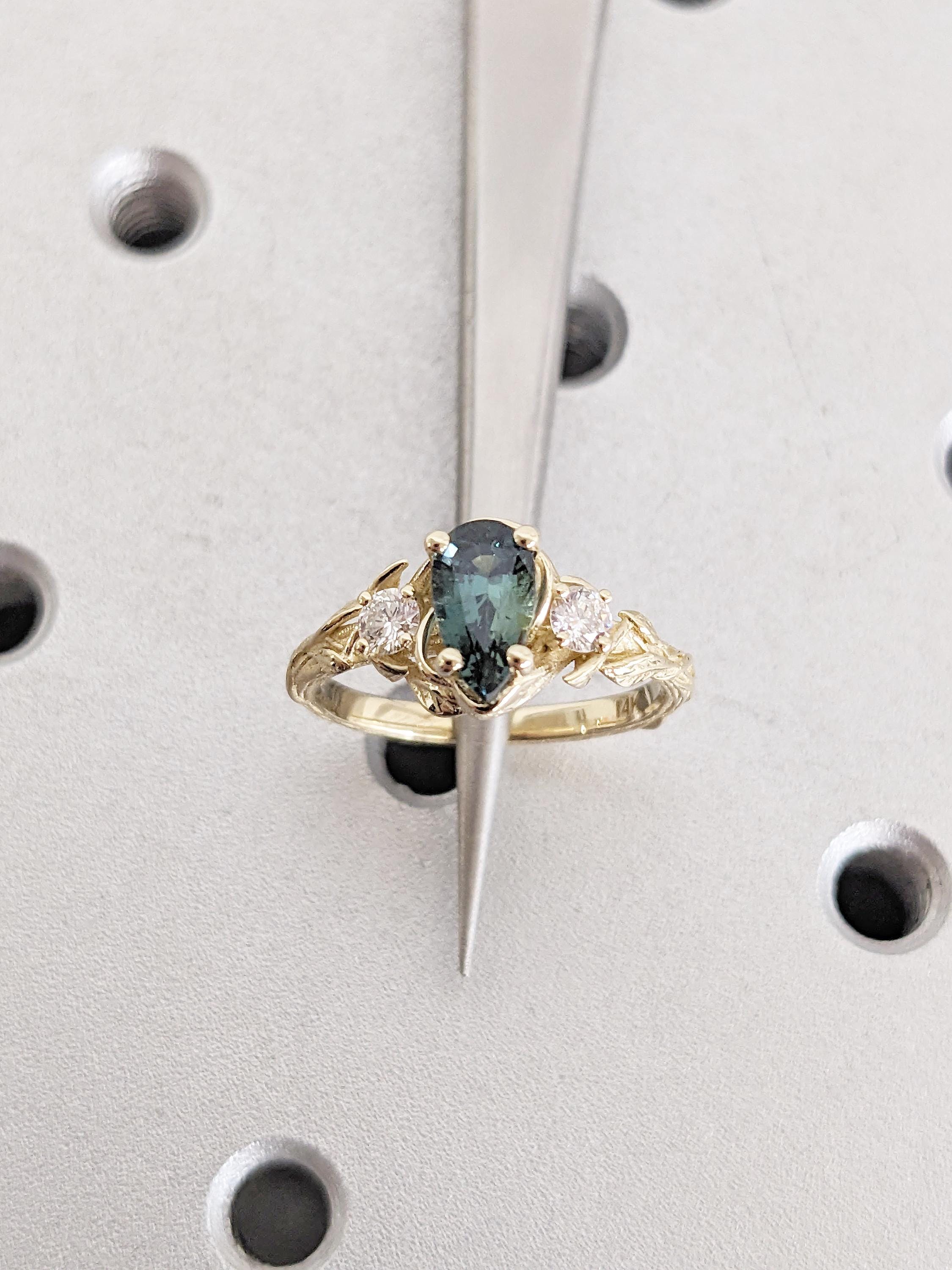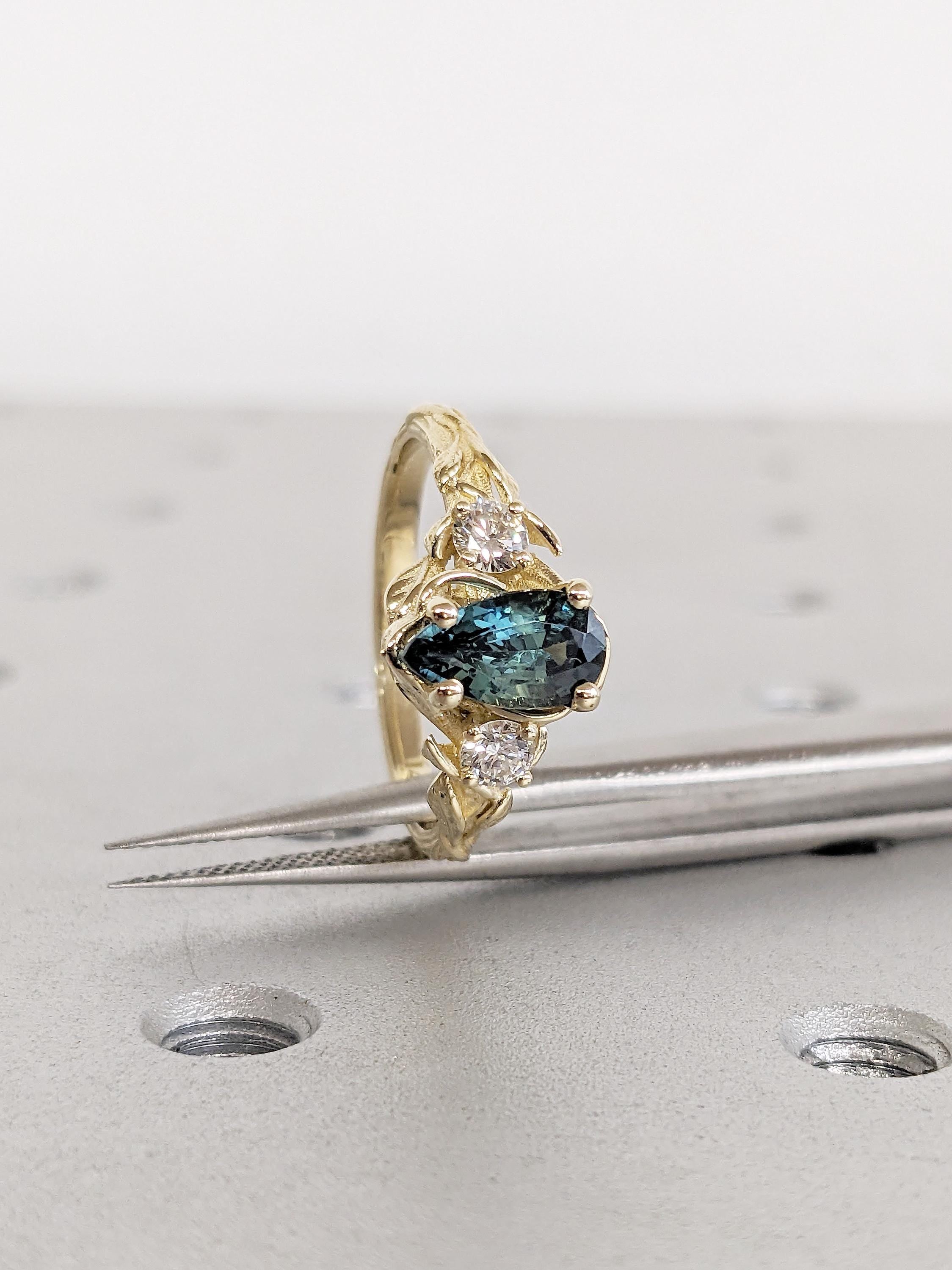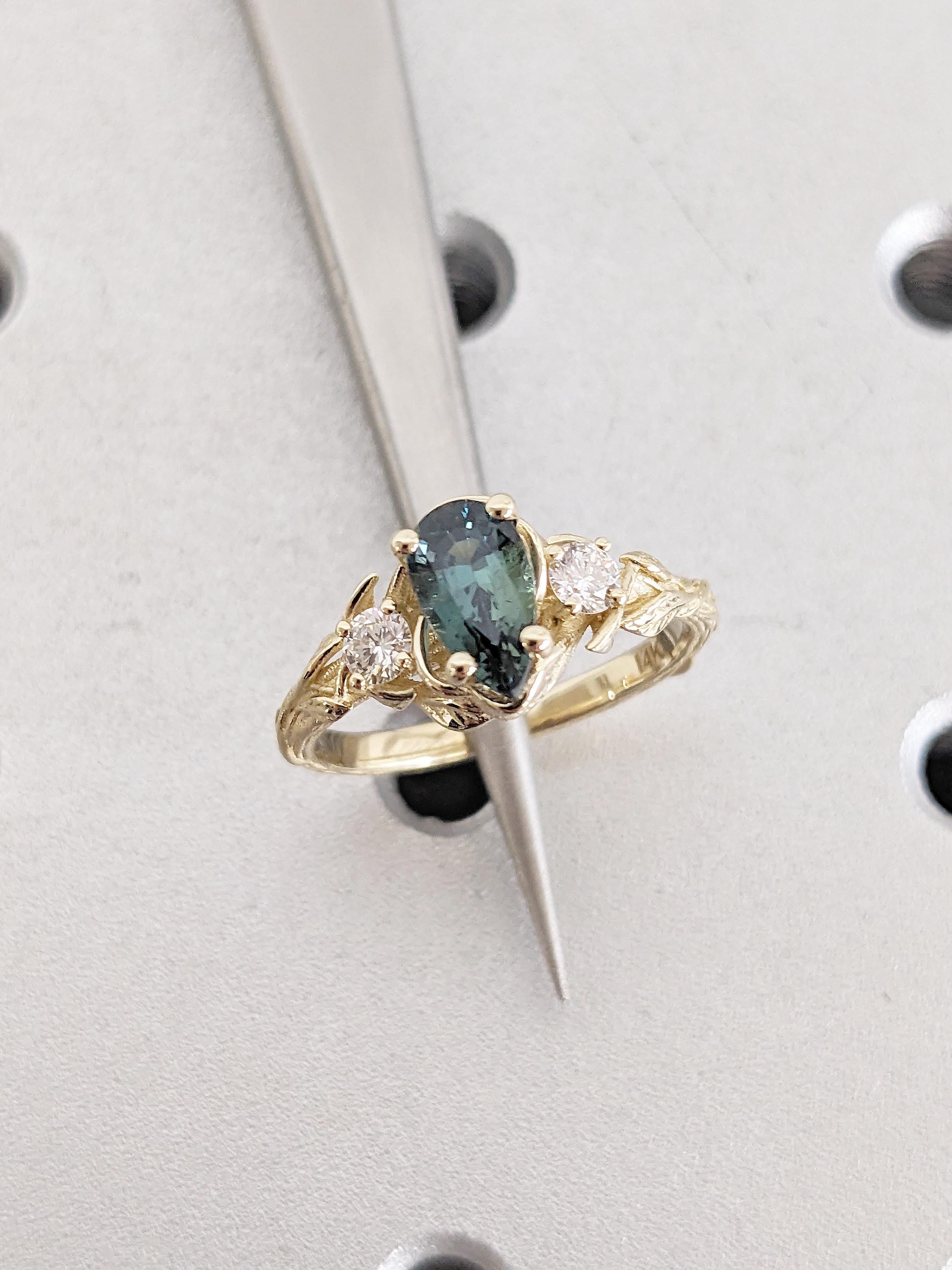 1 Carat Montana Sapphire Ring, 14k Yellow Gold Nature Inspired Pear Shaped Engagement Ring, Natural Diamond and September Birthstone Jewelry
