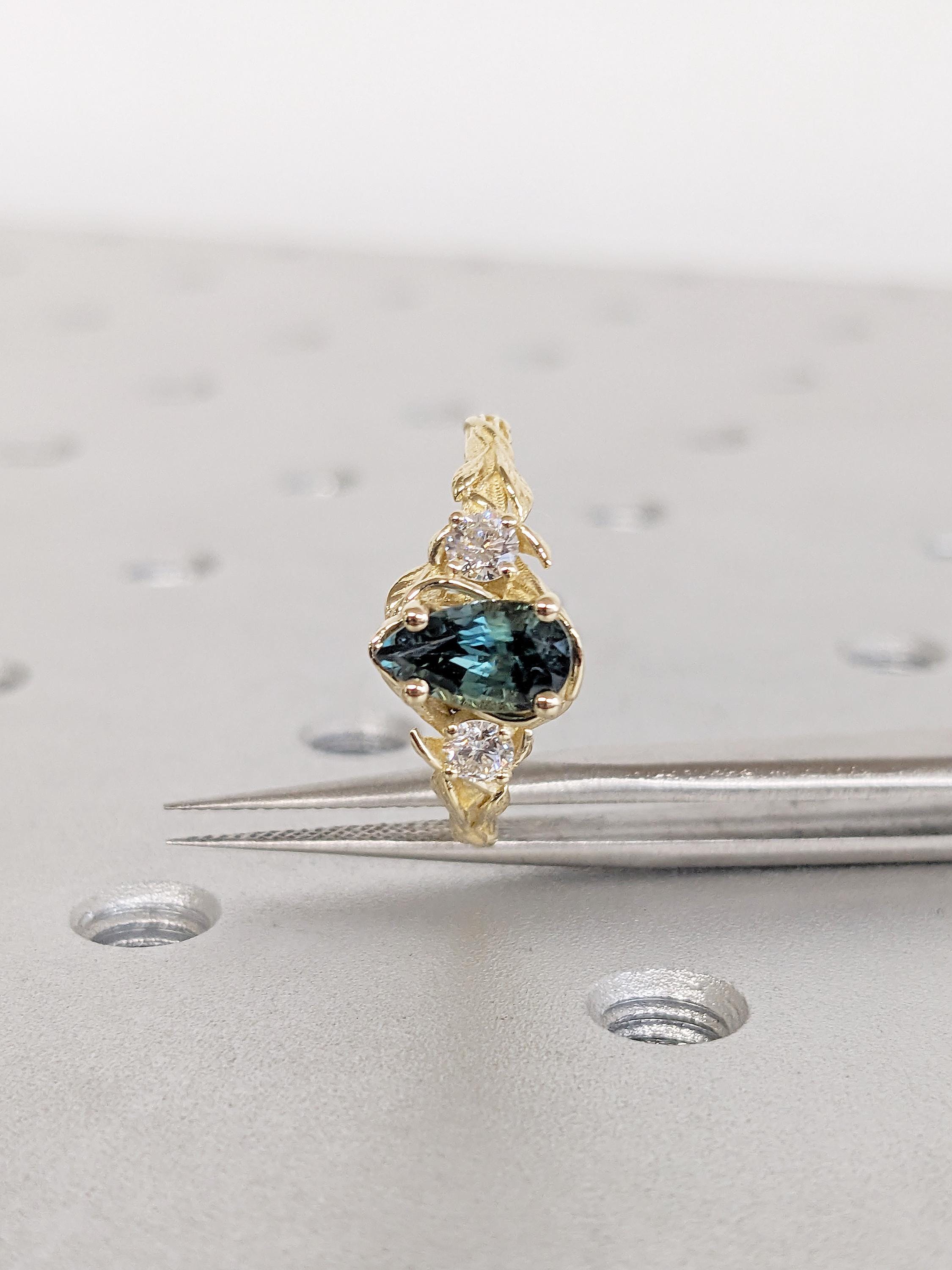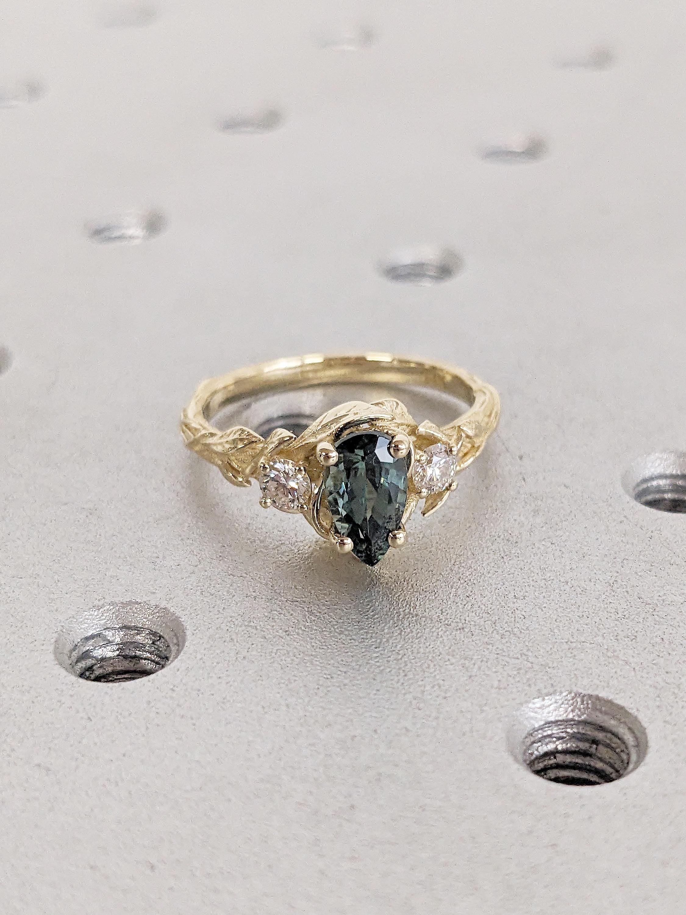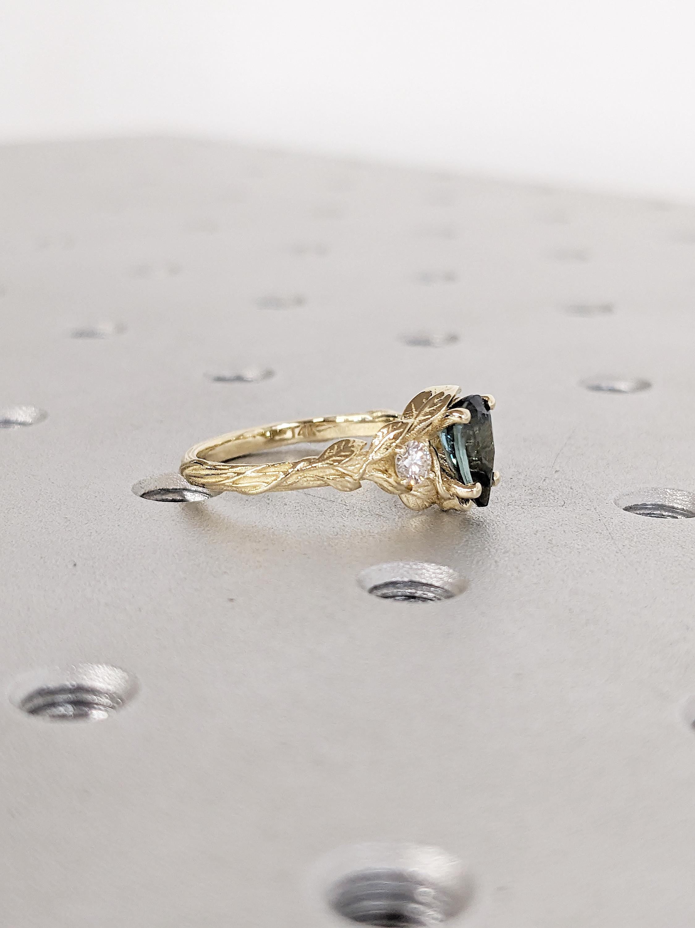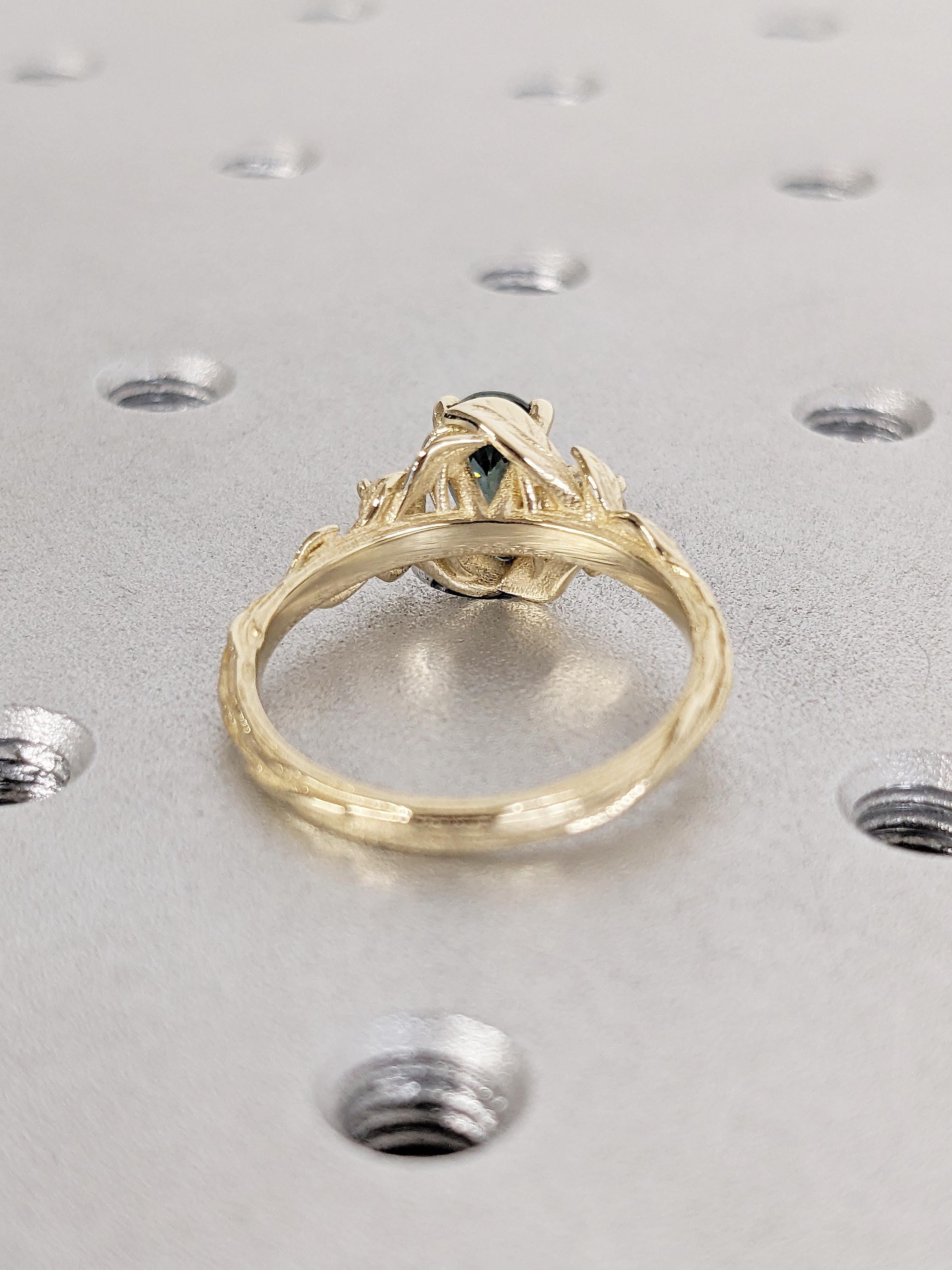 This ring features graceful stems that gently curve towards a stunning Peacock Sapphire at the center, encircled by elegant leaf accents. The shank is adorned with intricate twig motifs, while the two side stones can be customized from your choice of Natural Diamond, Lab Grown Diamond, or Moissanite, adding a personalized touch of elegance.