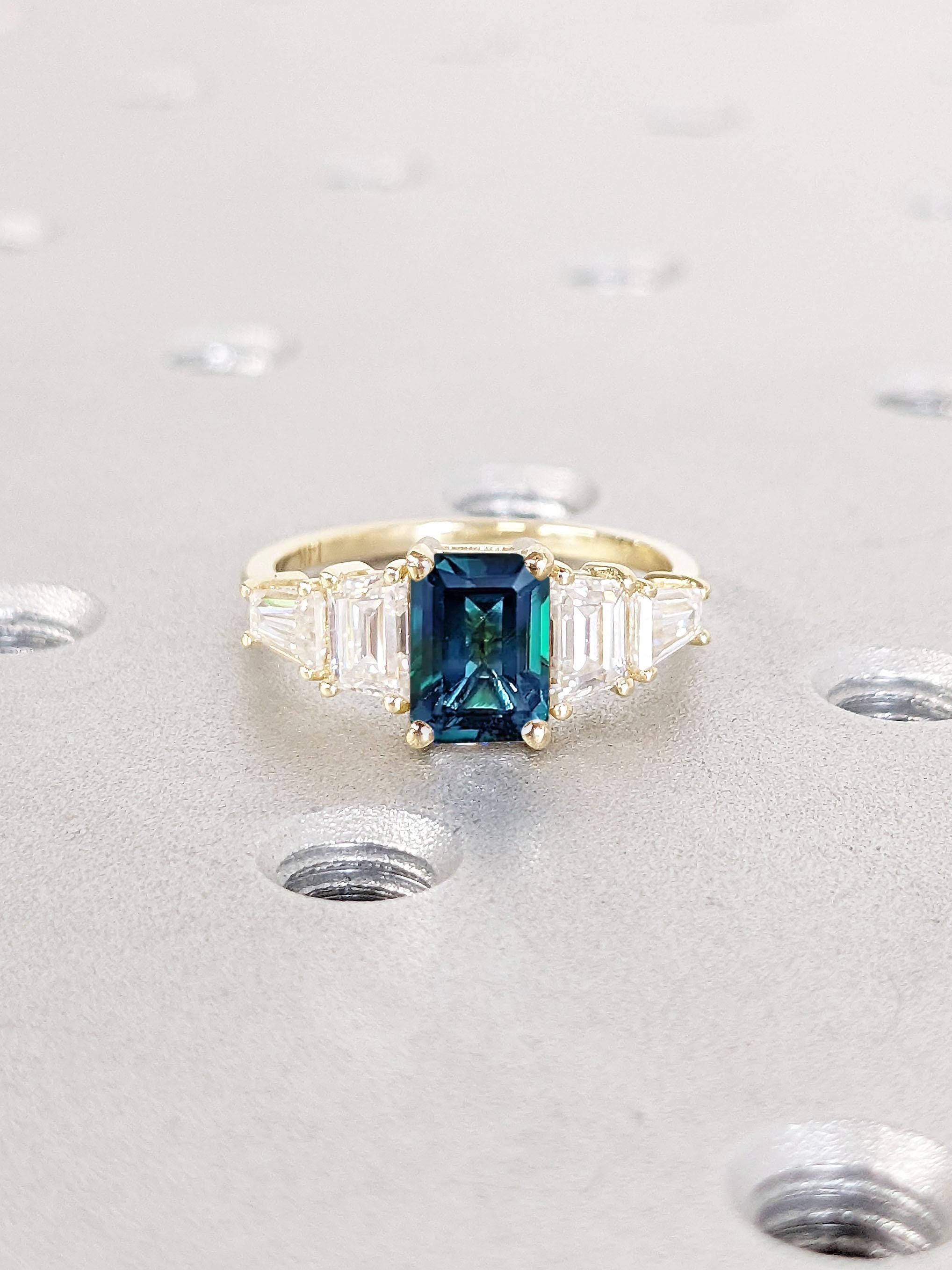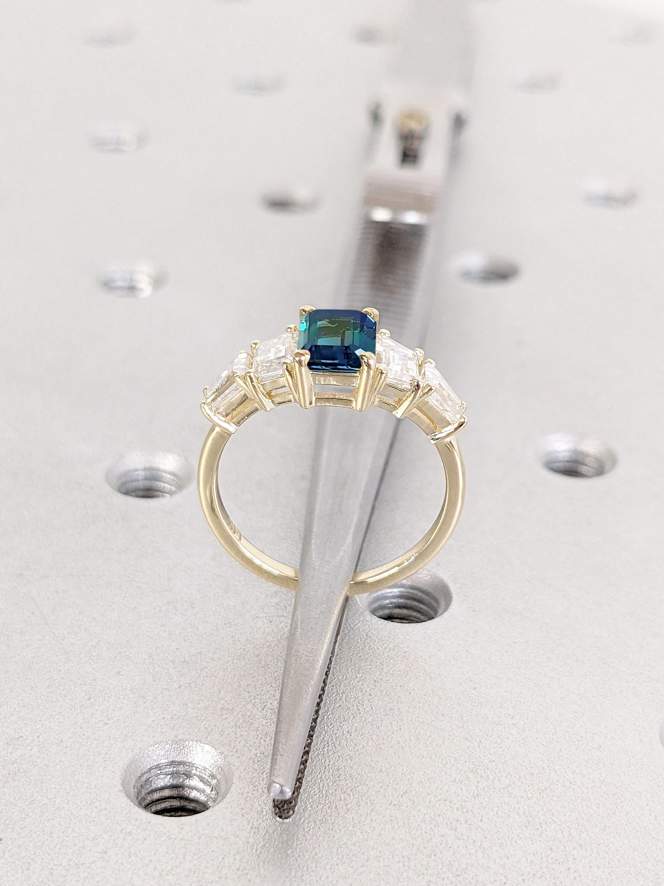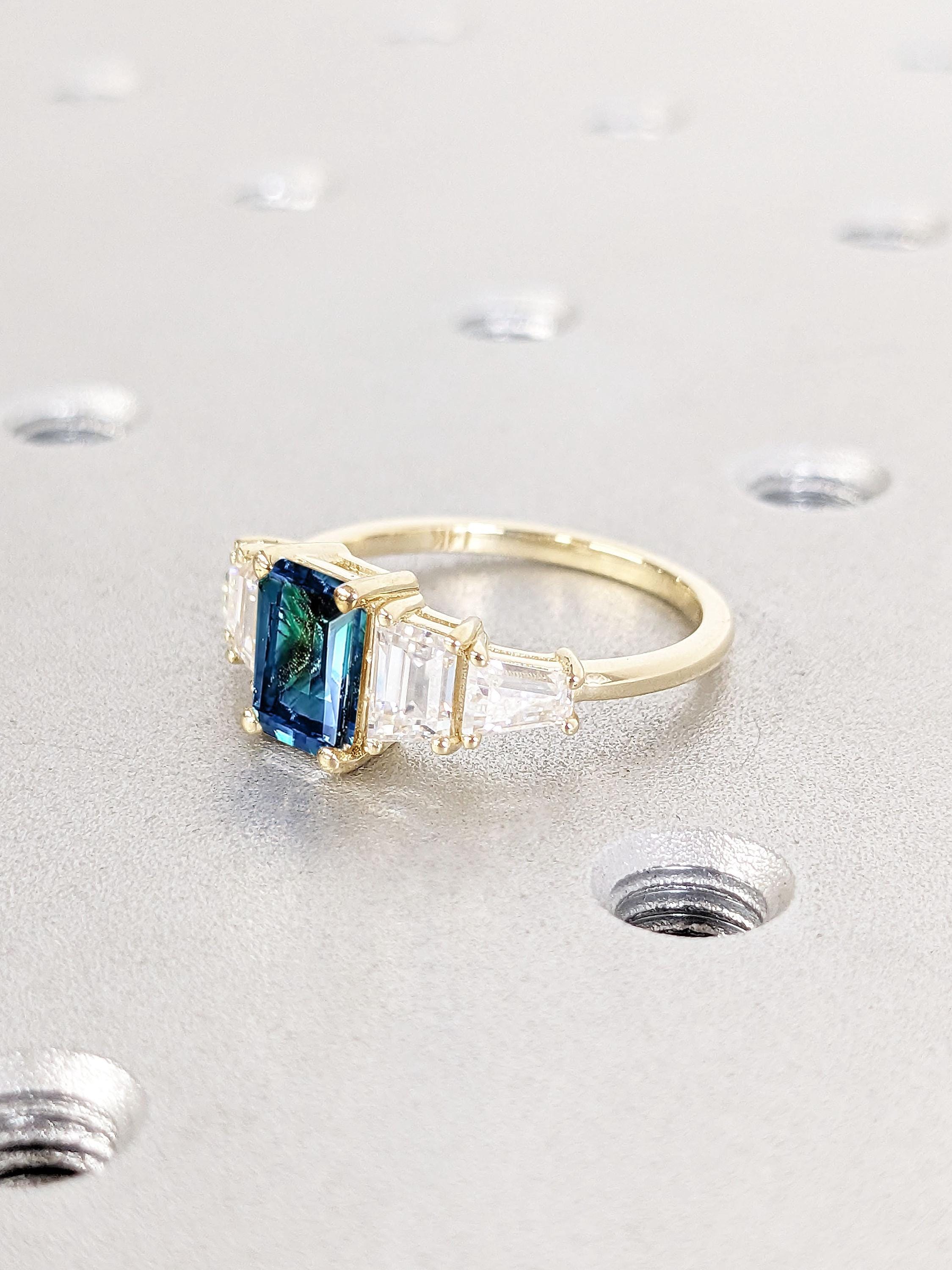 1 Carat Natural Blue Green Sapphire and Diamond Rings for Women | Emerald cut Engagement Ring | Five Stone Wedding Ring Anniversary Gift