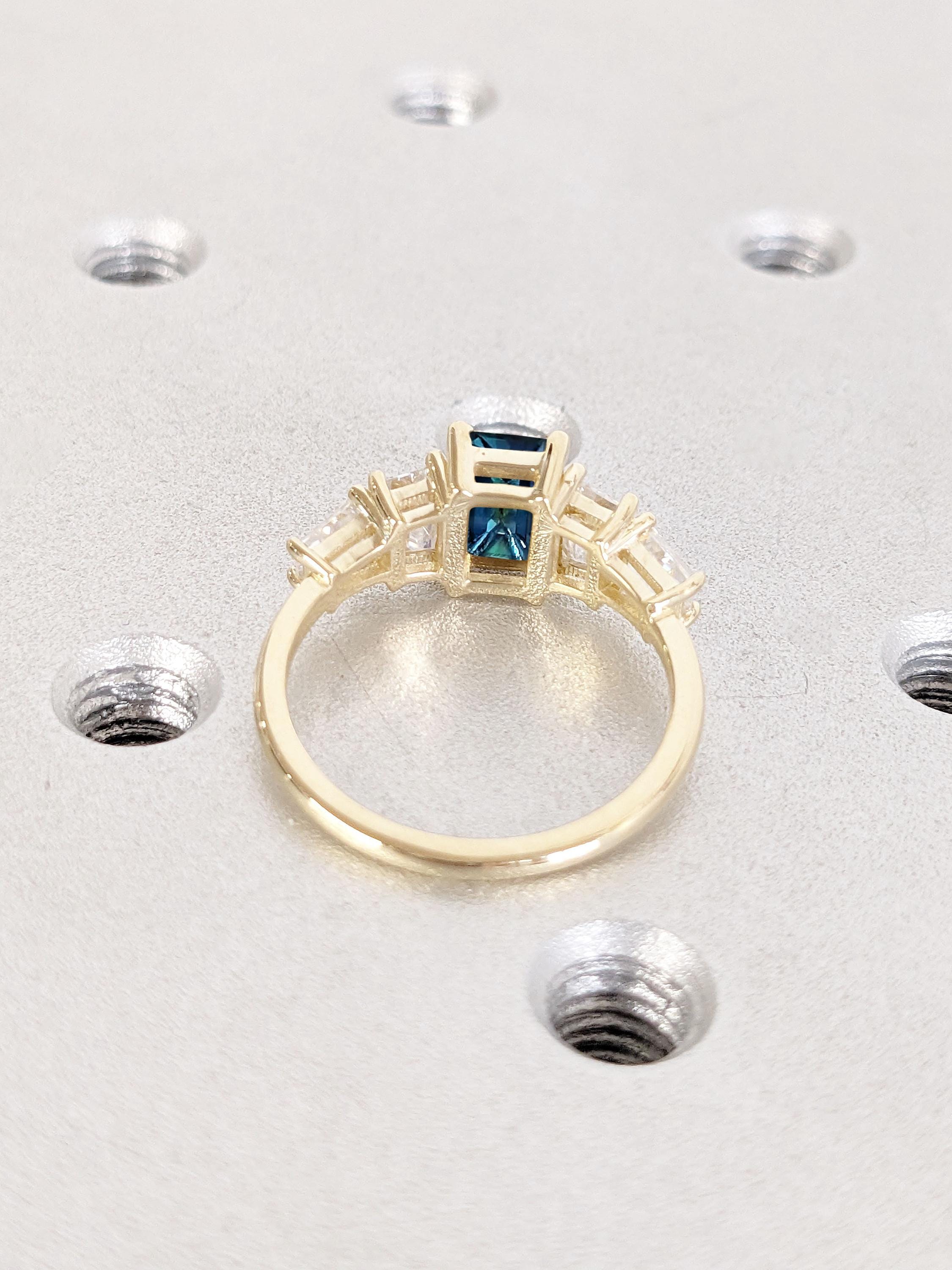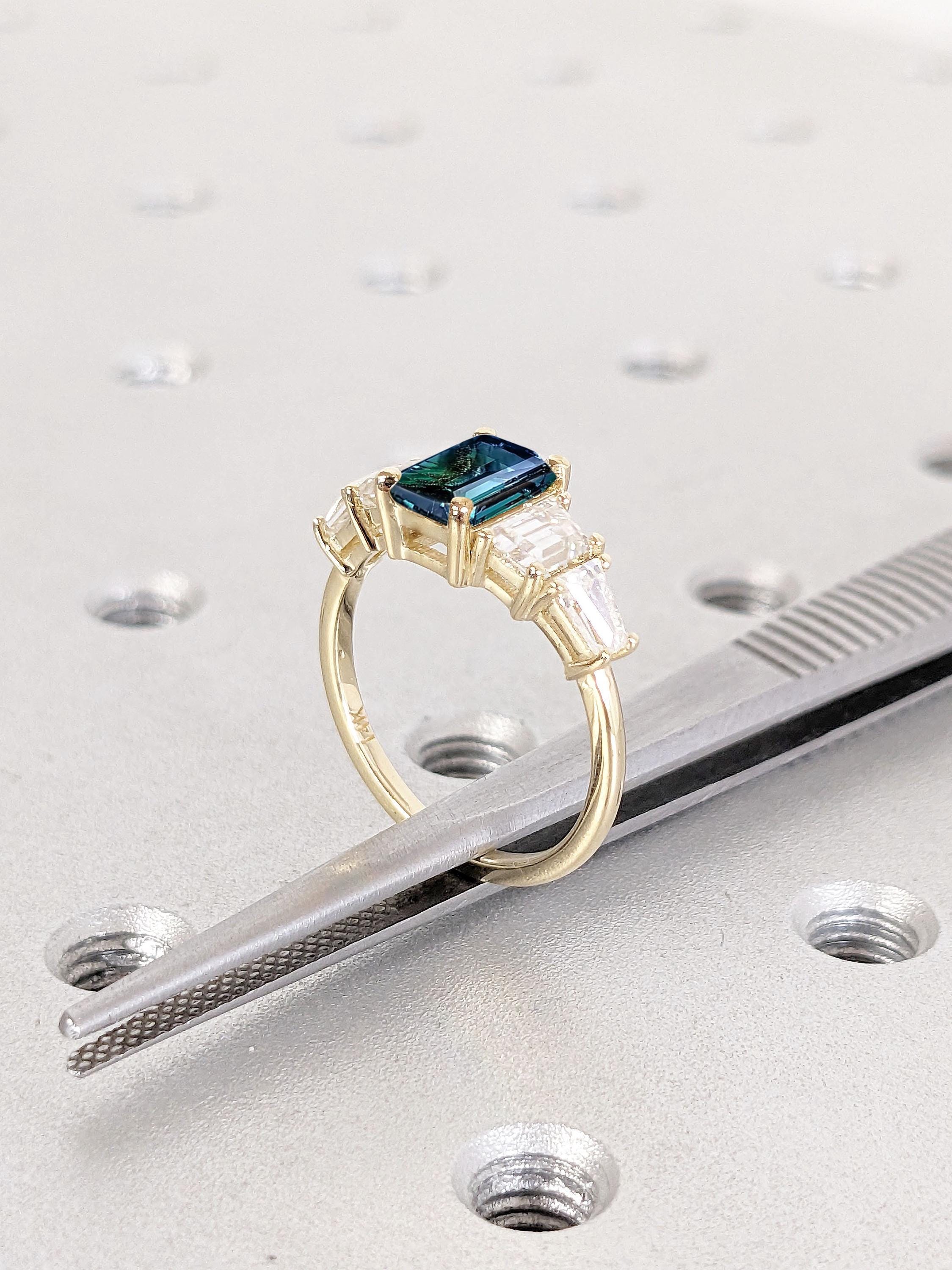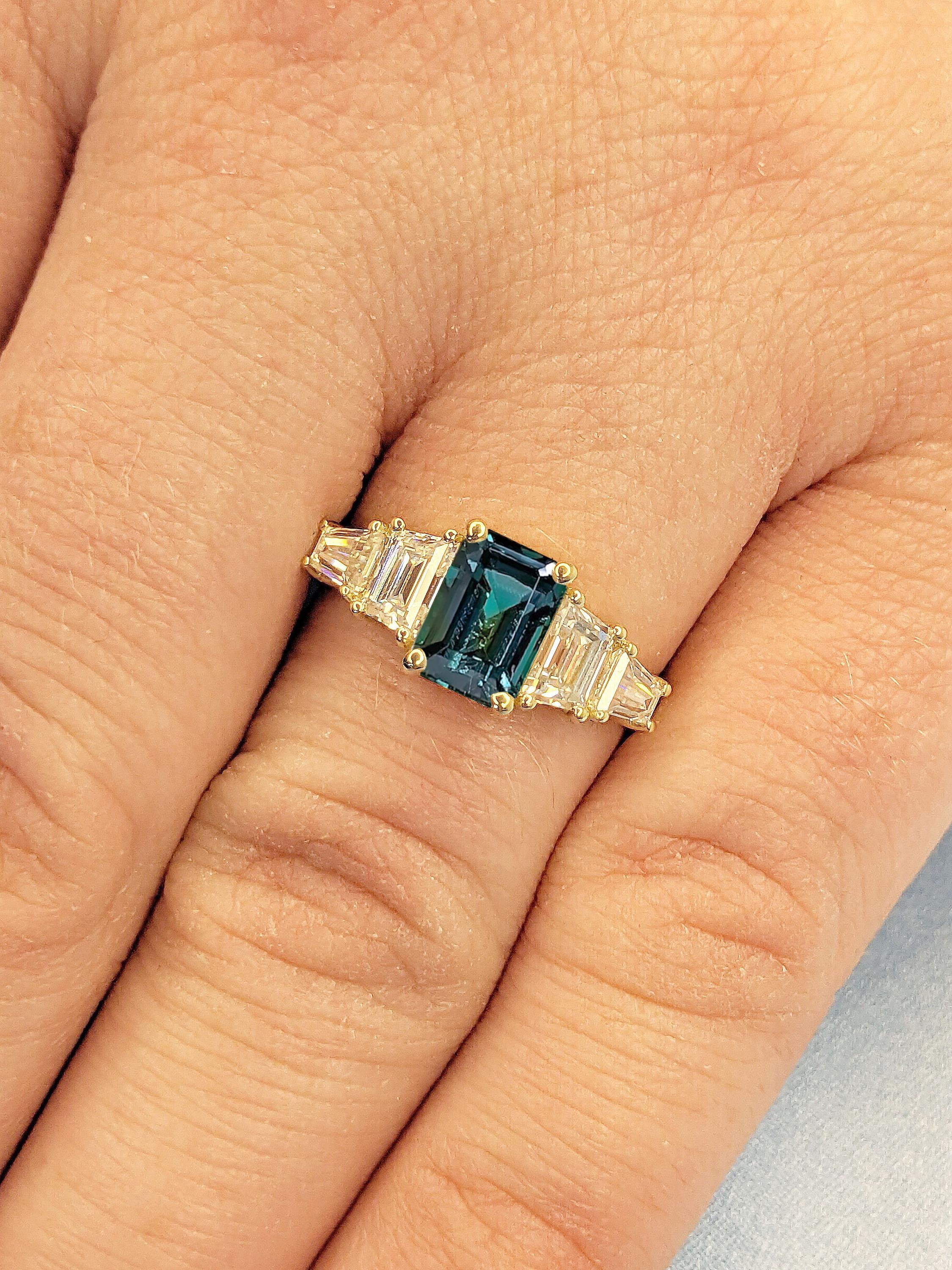 1 Carat Natural Blue Green Sapphire and Diamond Rings for Women | Emerald cut Engagement Ring | Five Stone Wedding Ring Anniversary Gift
