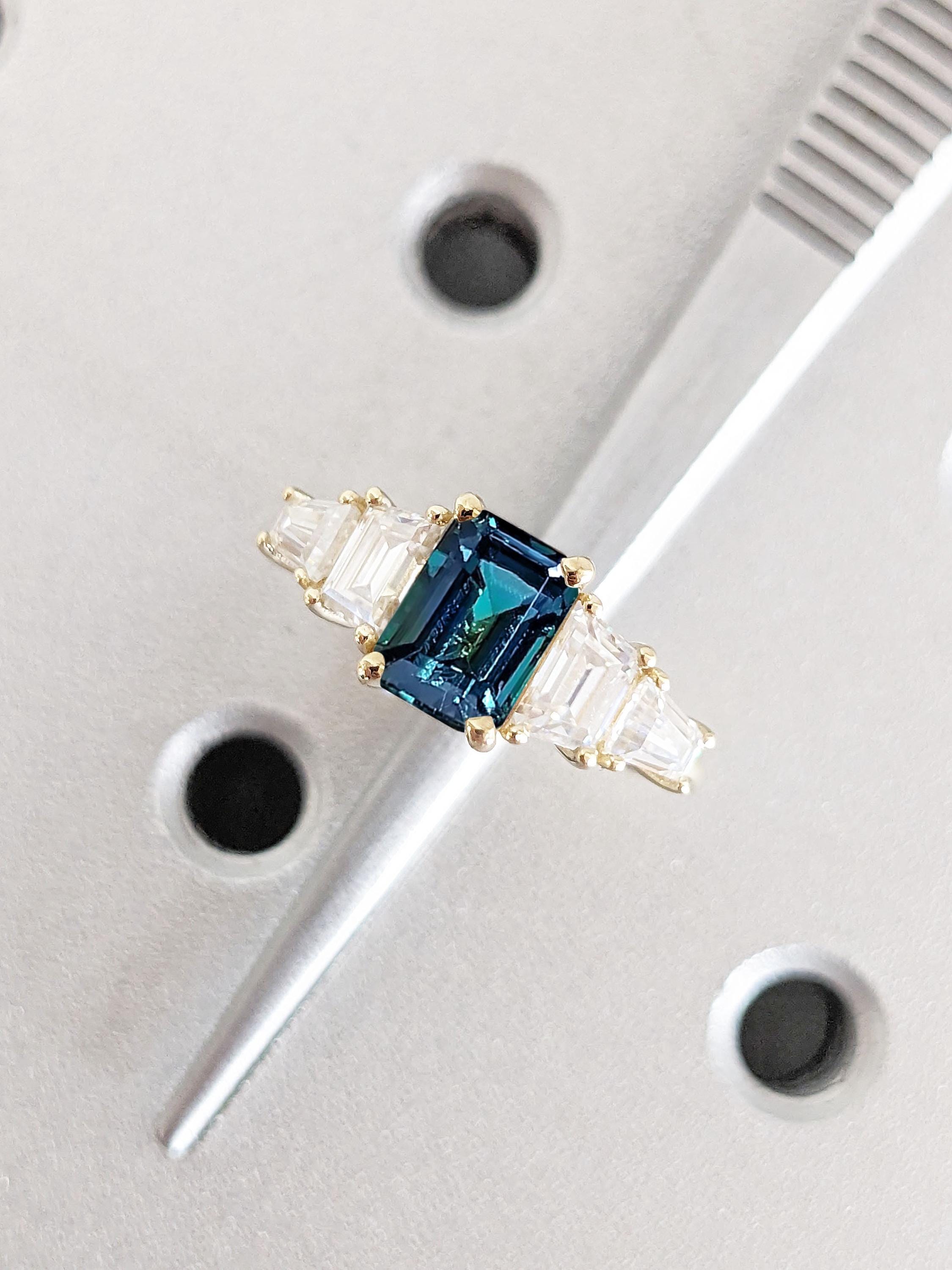 An exquisite geometrical masterpiece, this handmade ring features an emerald cut Sapphire center, accented by tapered baguette cut and trapezoid shaped side stones. Set on a thin band of 1.4mm width, this five stones ring is the perfect gift to celebrate wedding anniversary, as it symbolizes the 5 pillars of a relationship: love, trust, empathy, communication and commitment.