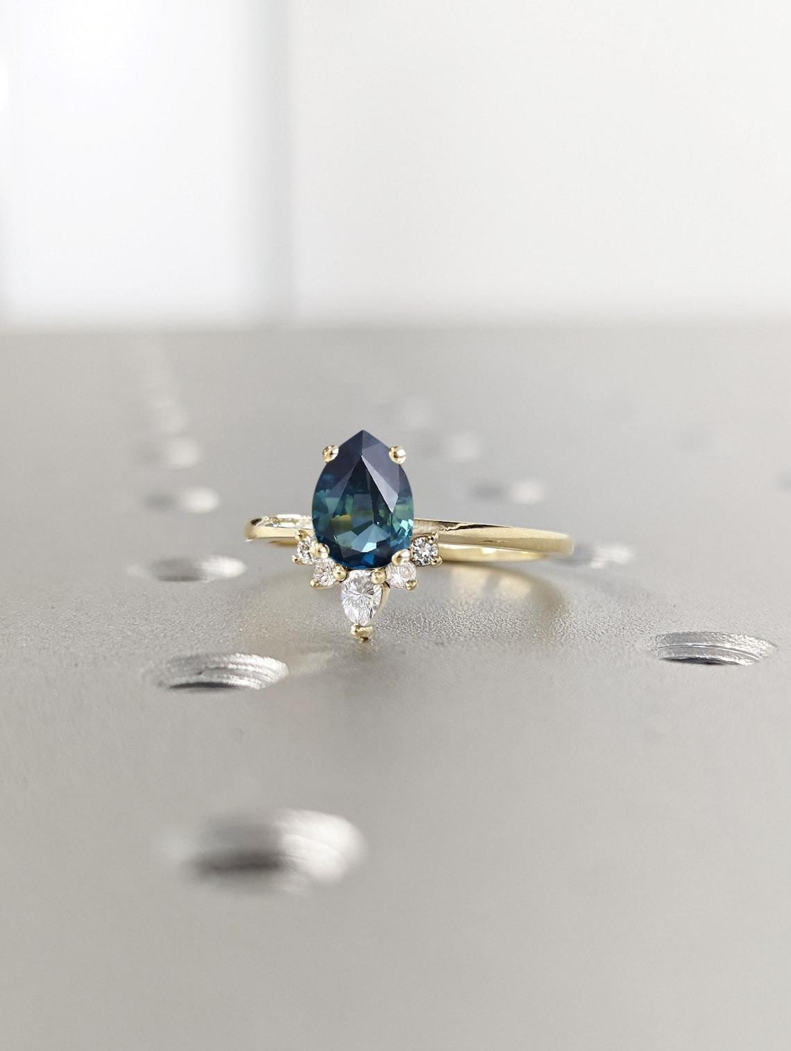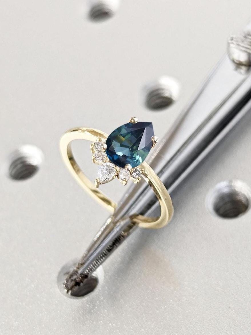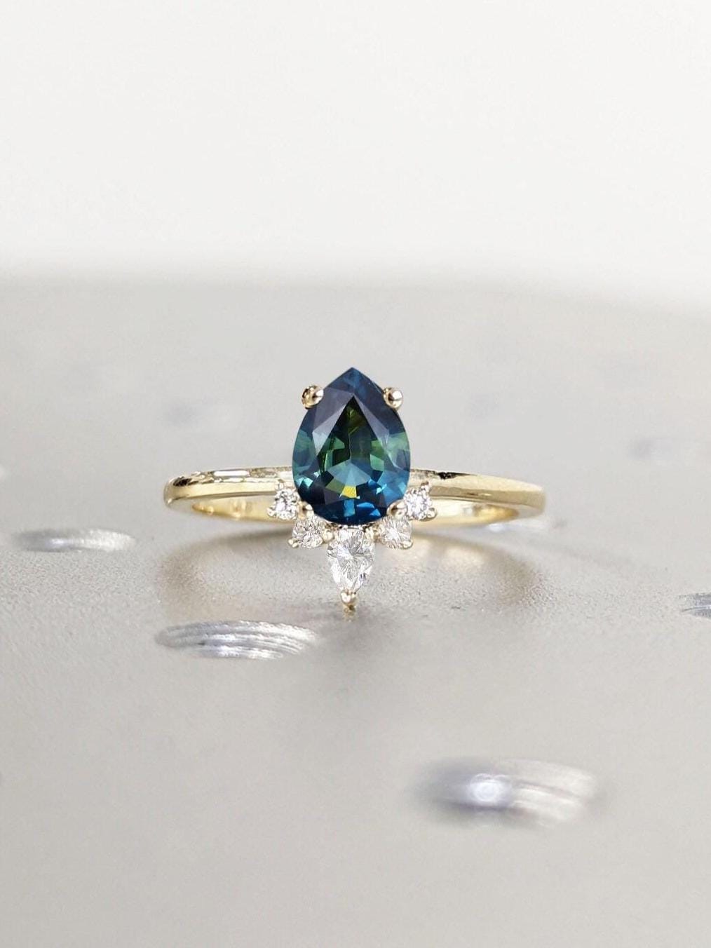 1 Carat Pear cut Blue Green Sapphire Wedding Anniversary Ring for Wife | Natural Gemstone Engagement Ring | 14k 18k Solid Gold Art Deco Ring