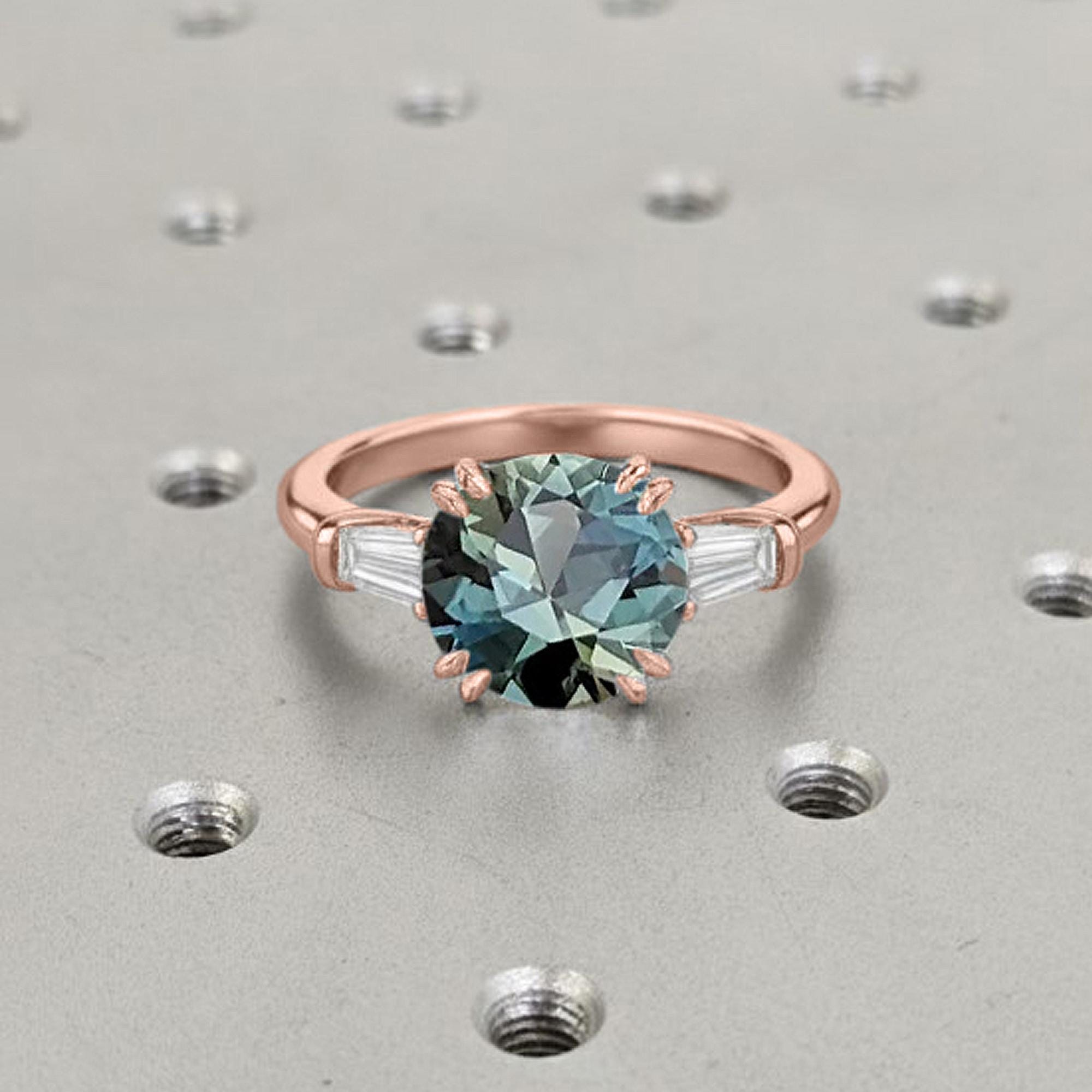 1 Carat Teal Sapphire Engagement Ring | 14k Rose Gold Sapphire Ring | Round Cut Promise Ring | Three Stone Past Present Future Wedding Ring