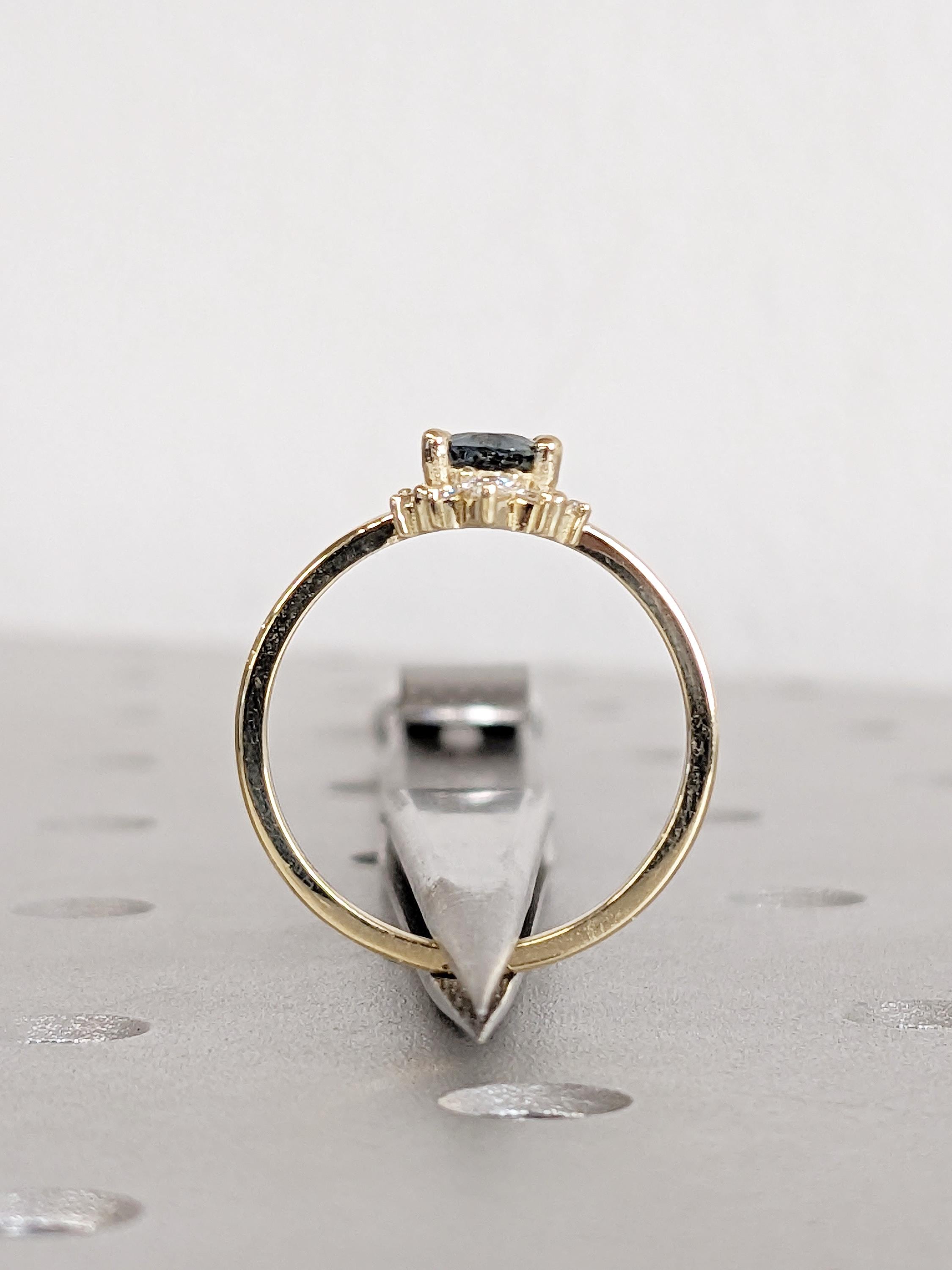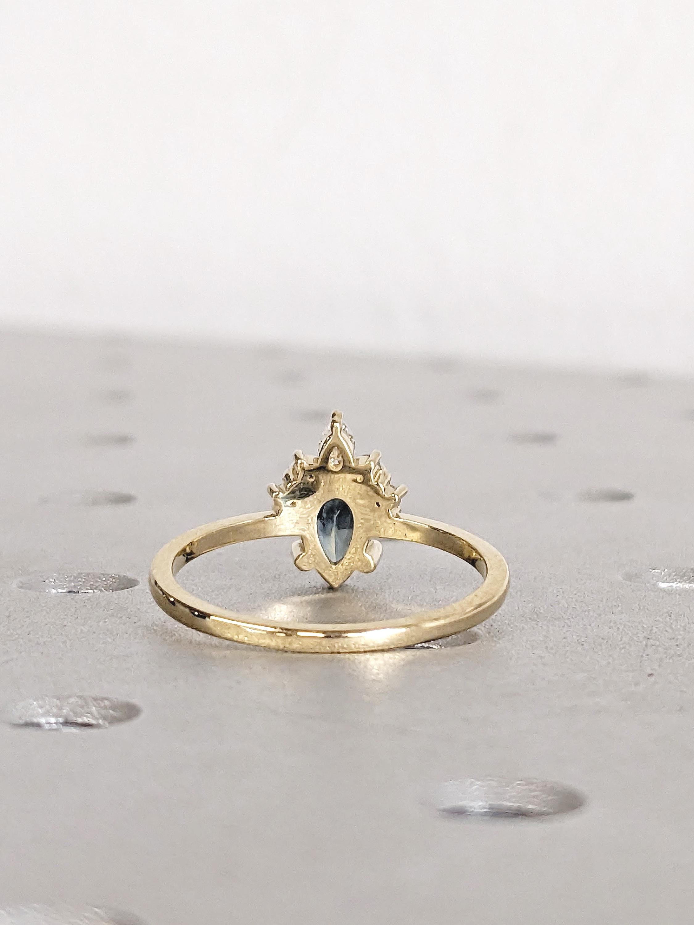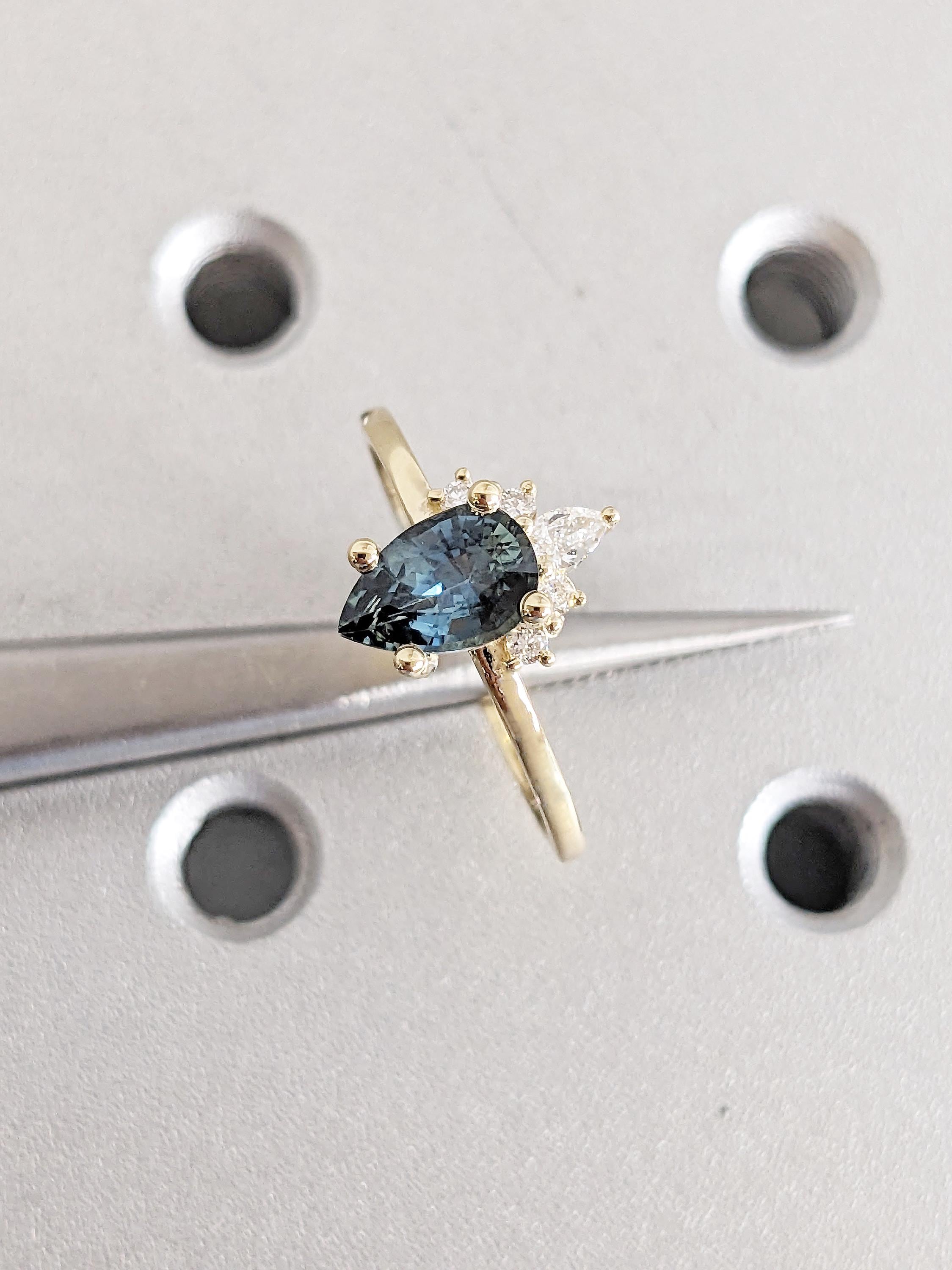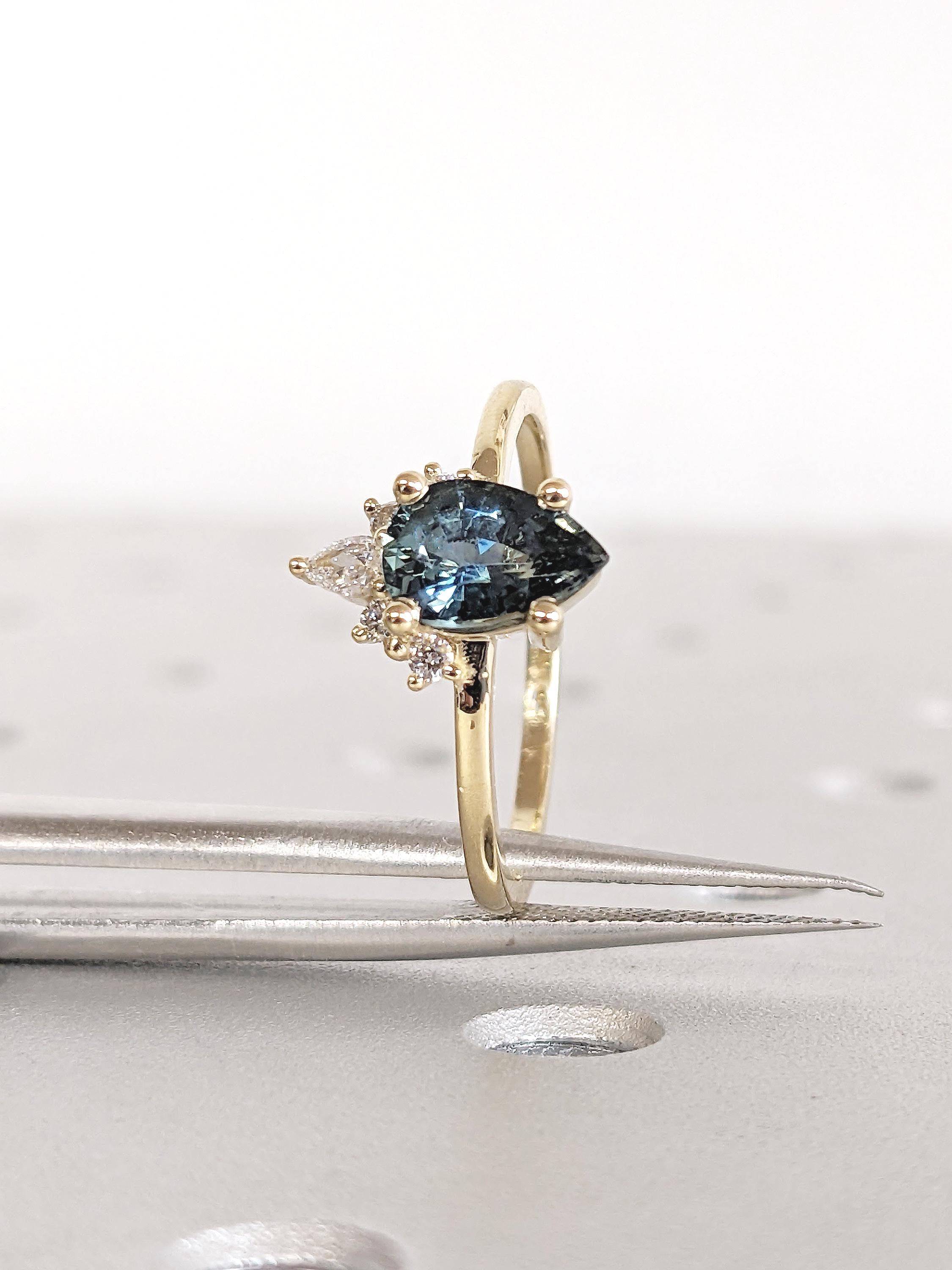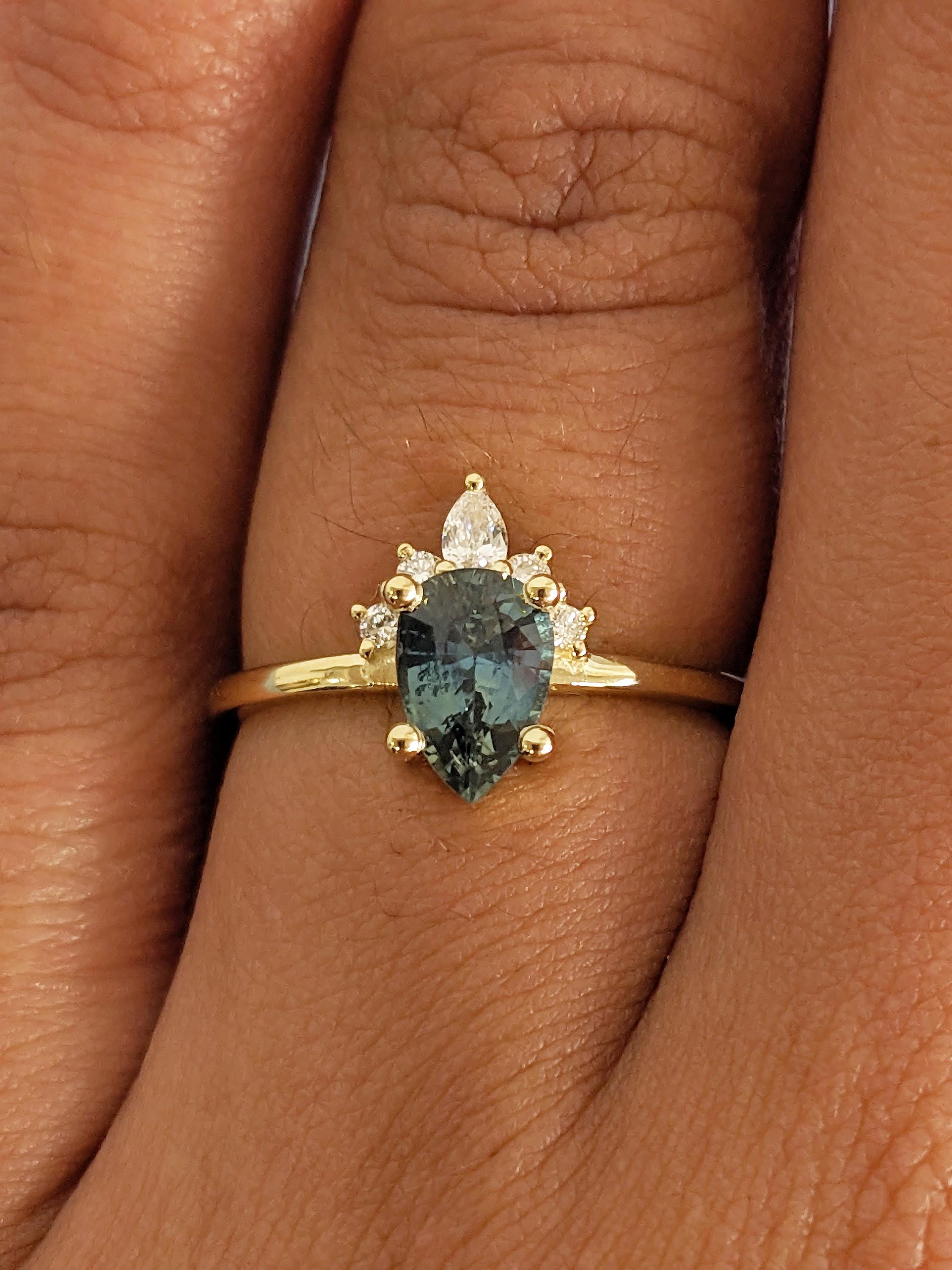 Admire the beauty of this ring with a pear cut natural Sapphire focal stone, adorned with a lovely half halo of pear and round cut side stones. The dazzling blue/green hue from the center stone enhances its unique charm and sophistication, making this delicate ring a wonderful gift for her for any special occasion.