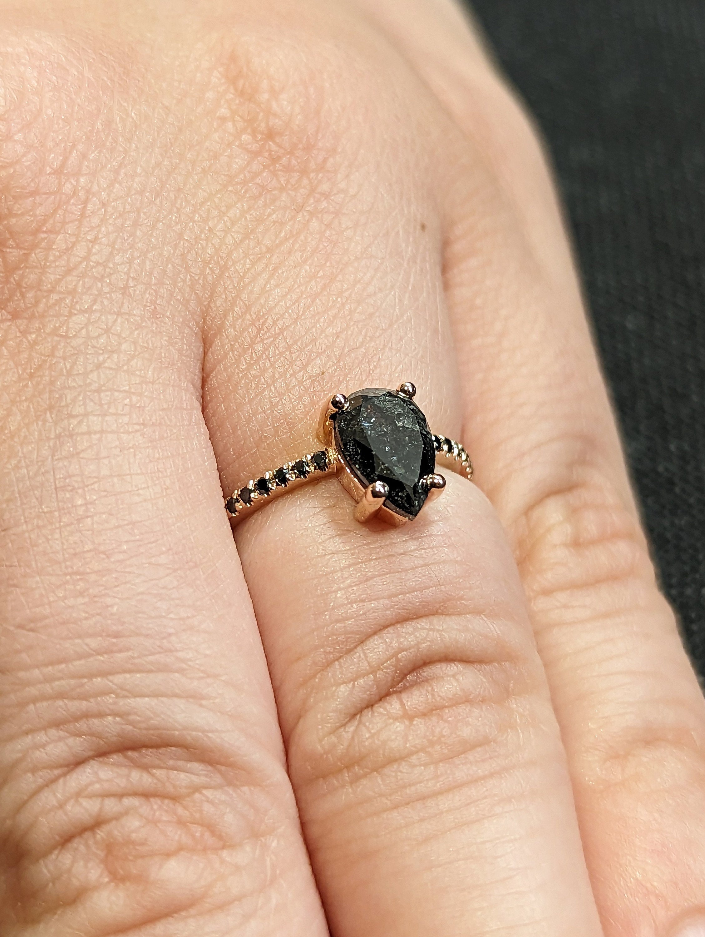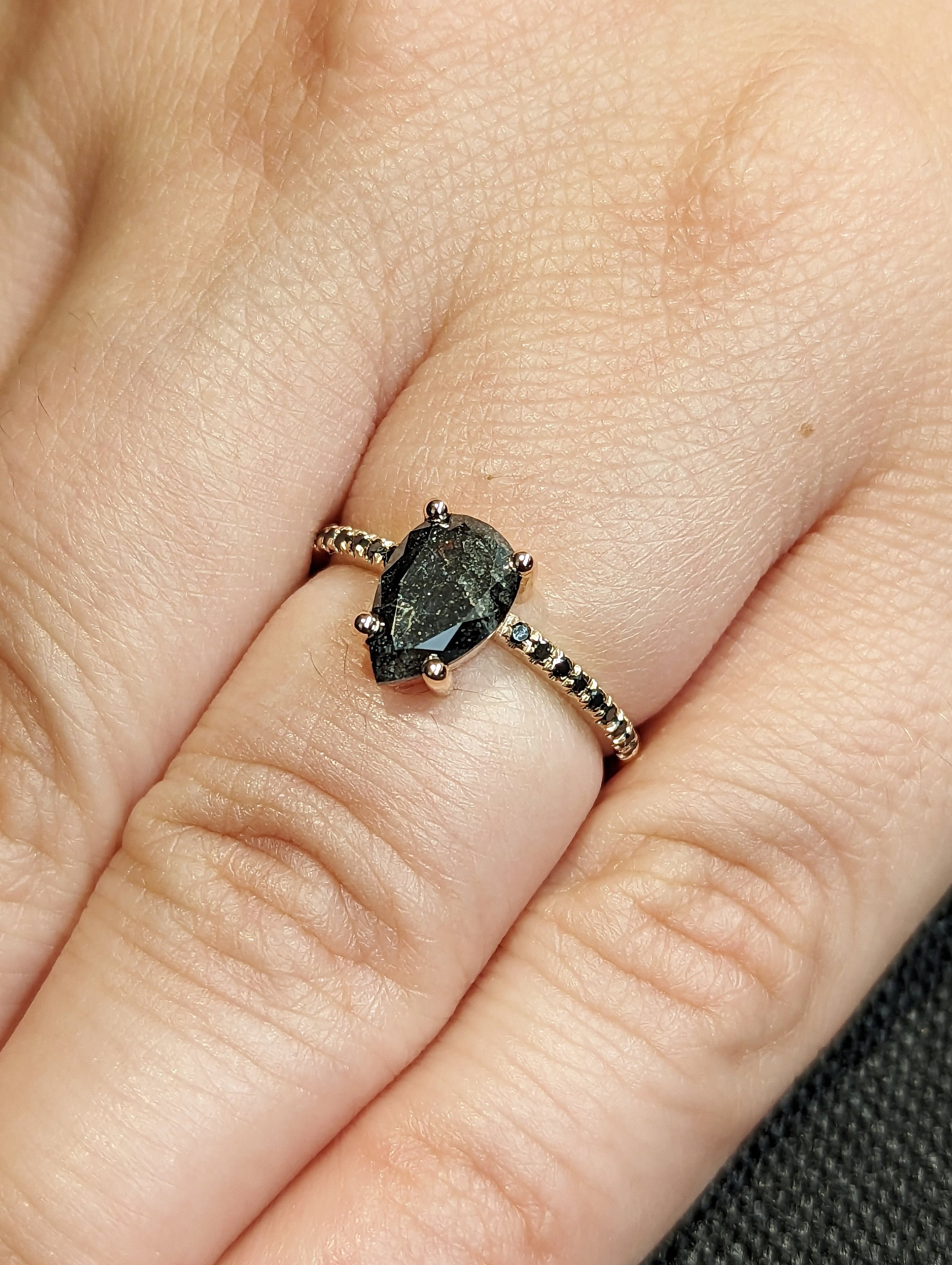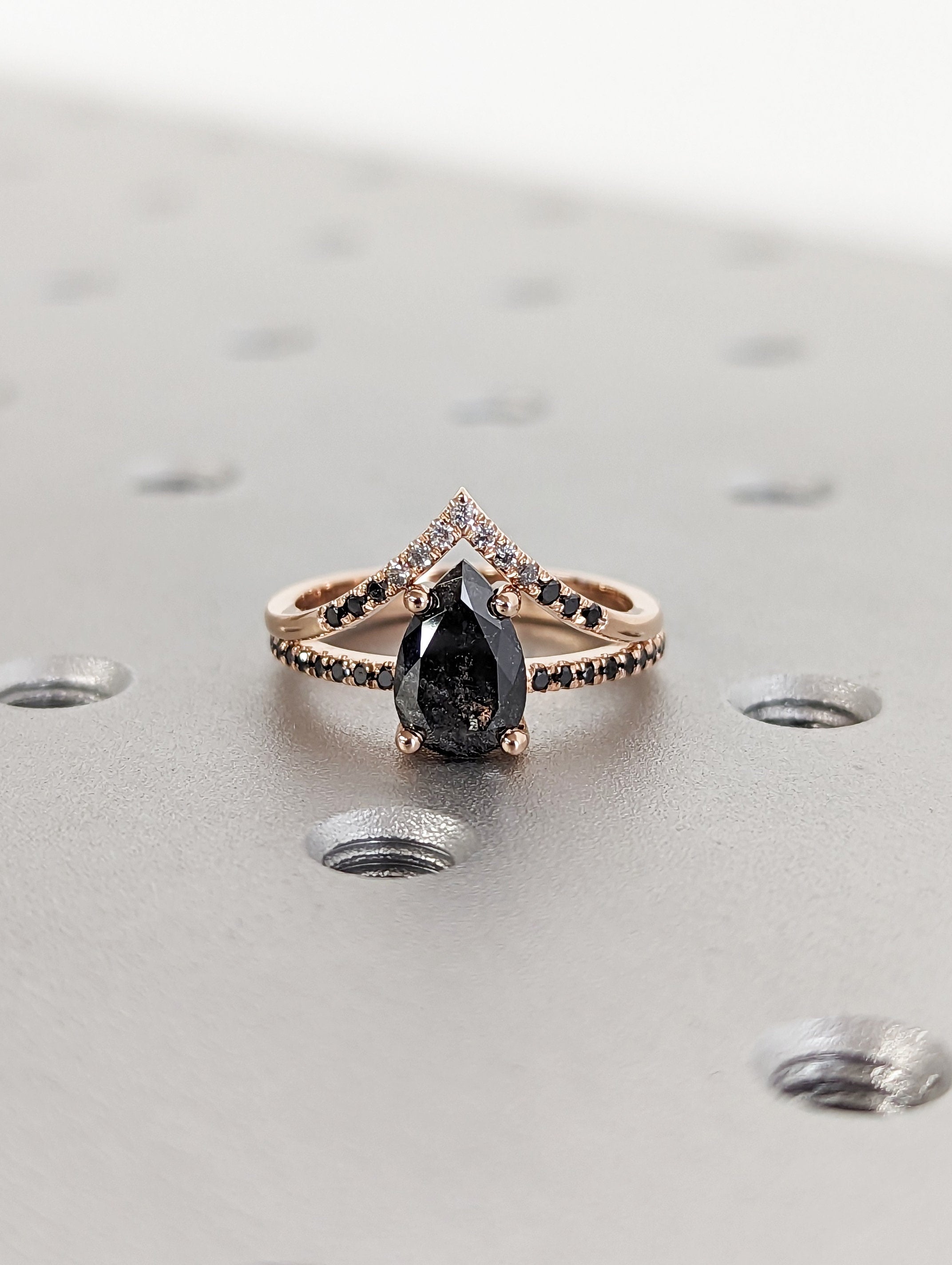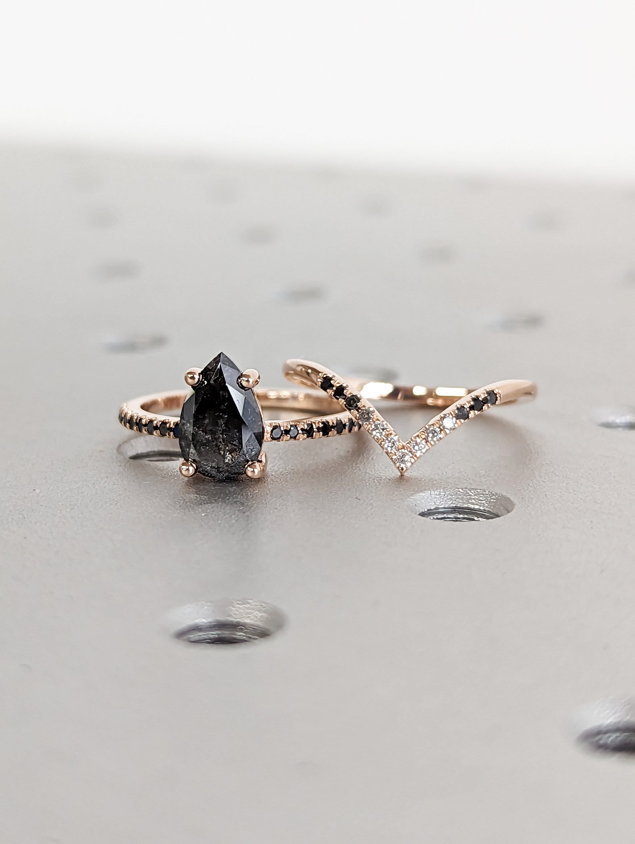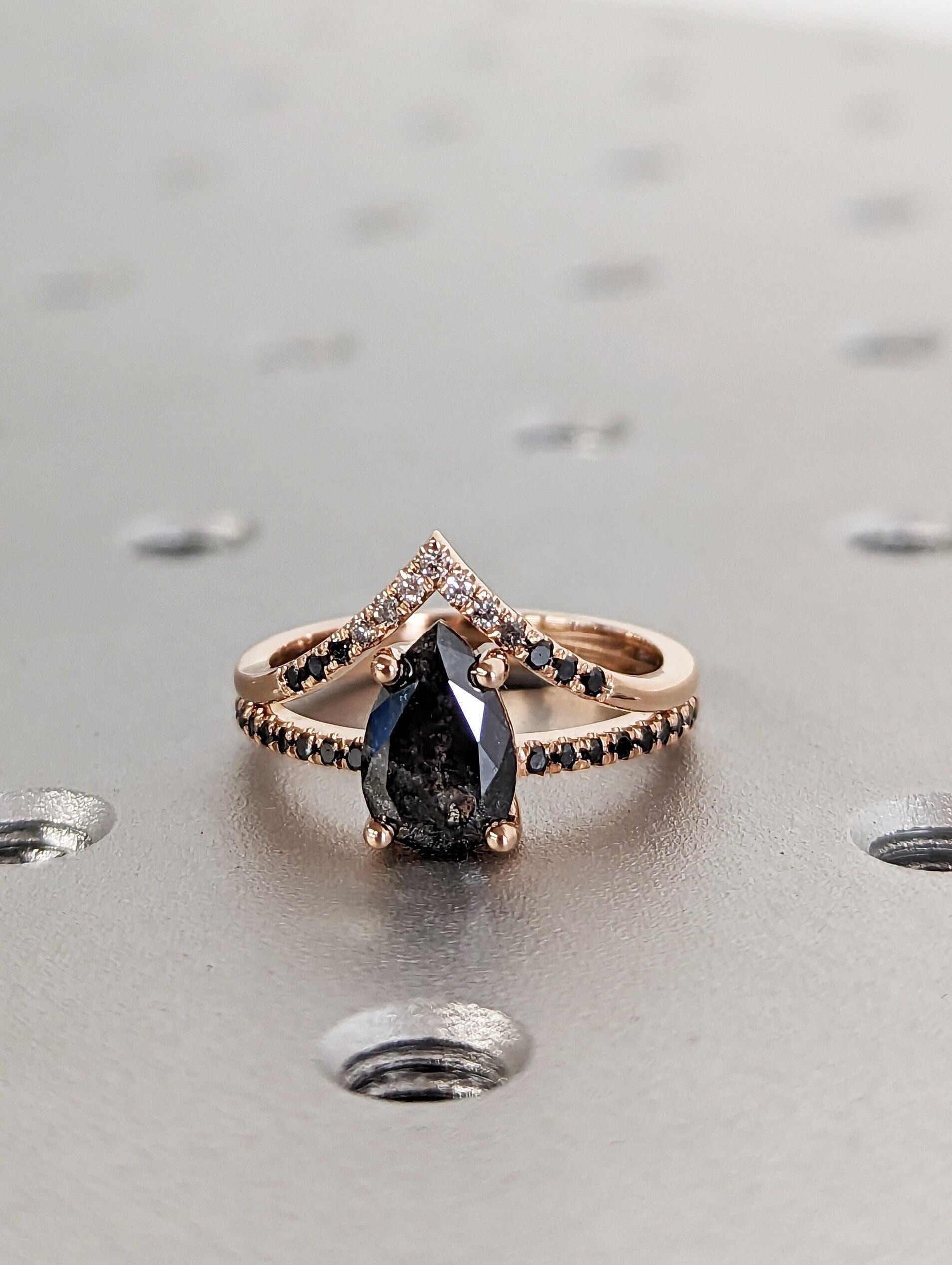 1.25 Carat 1920's Raw Salt and Pepper Diamond, Pear Diamond Ring, Unique Engagement Bridal Set, Black, Gray Pear 14k Yellow, Rose White Gold