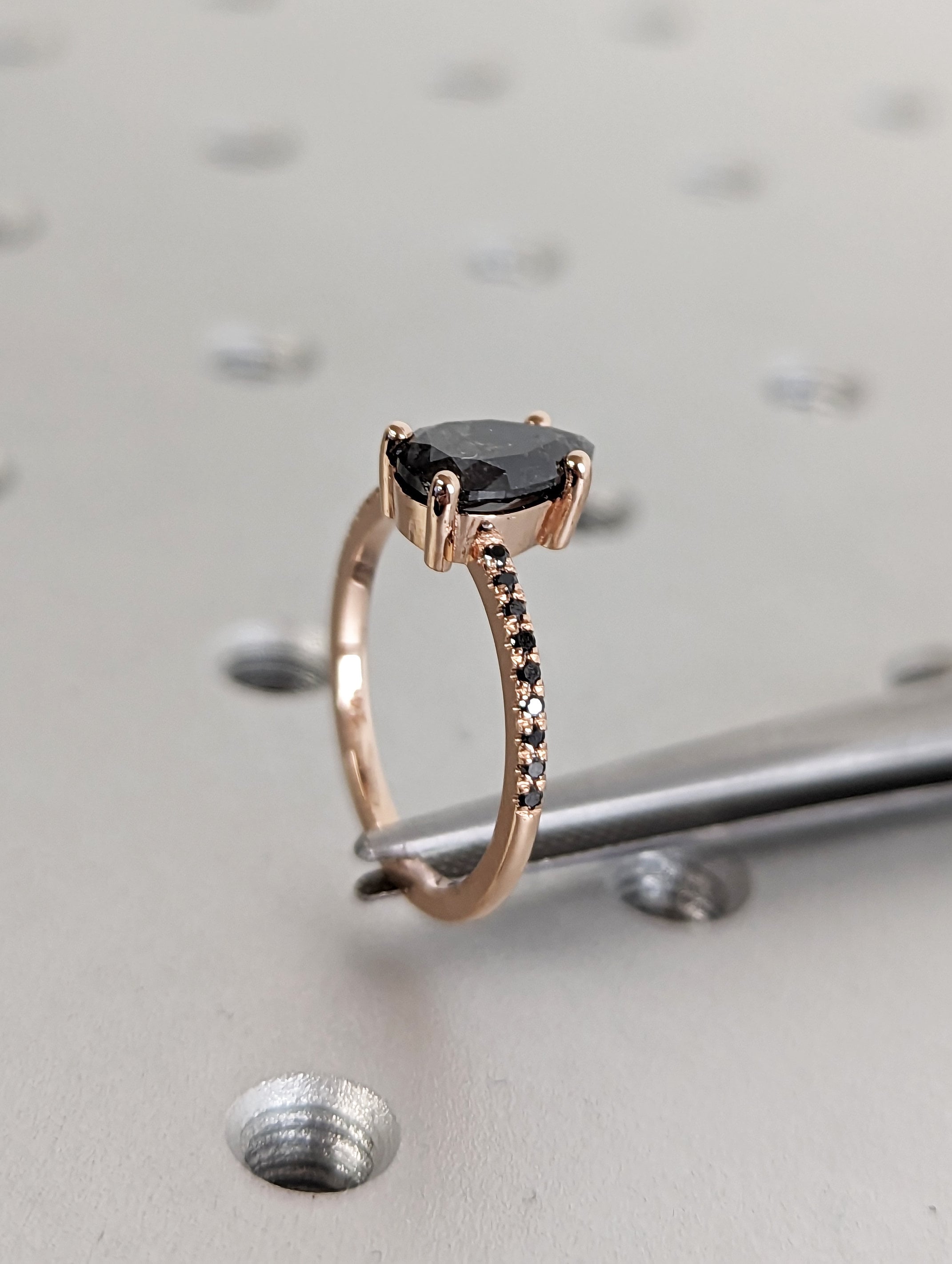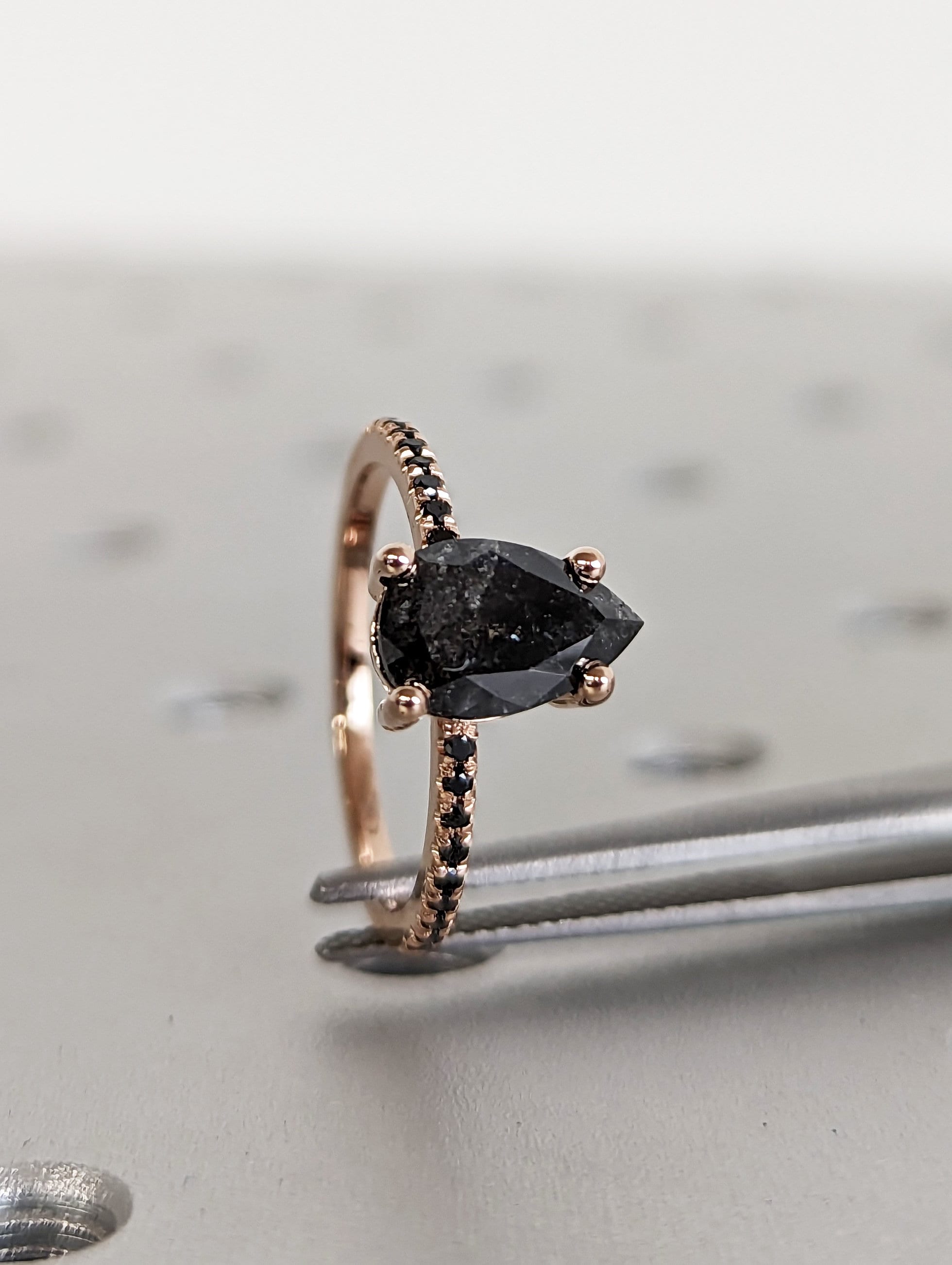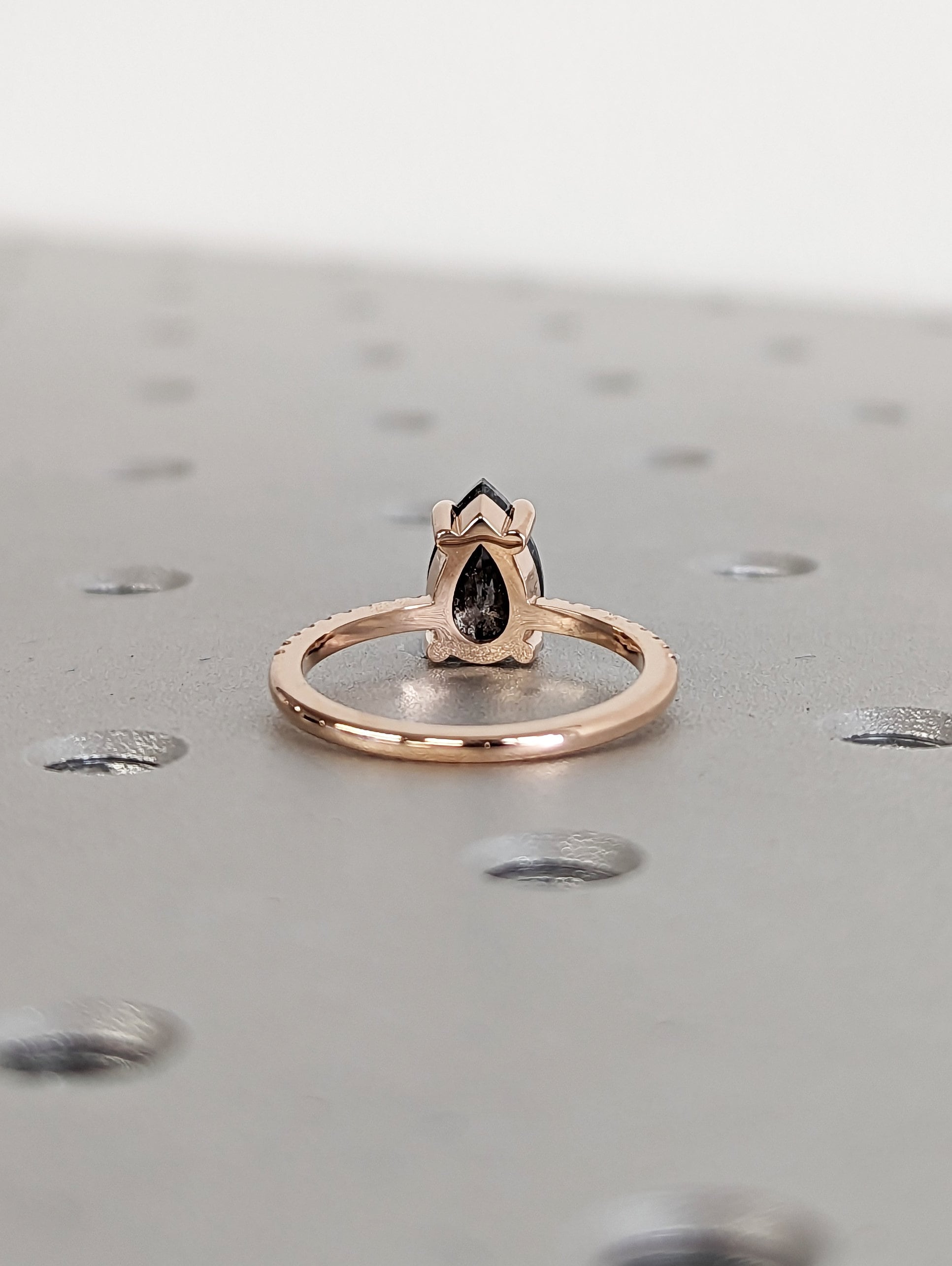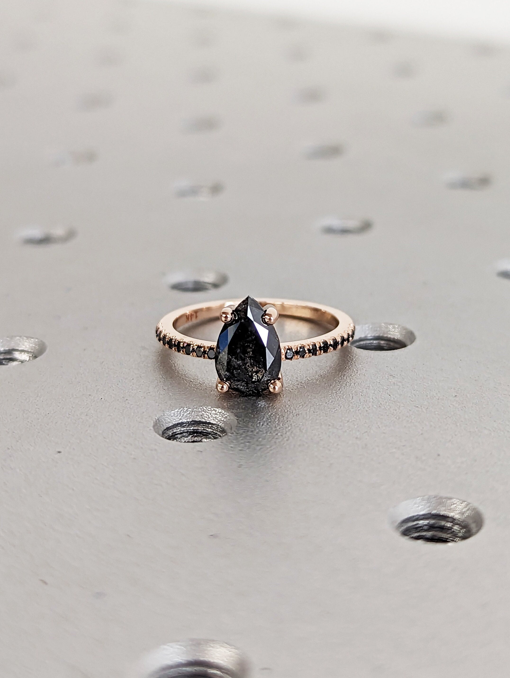1.25 Carat 1920's Raw Salt and Pepper Diamond, Pear Diamond Ring, Unique Engagement Bridal Set, Black, Gray Pear 14k Yellow, Rose White Gold