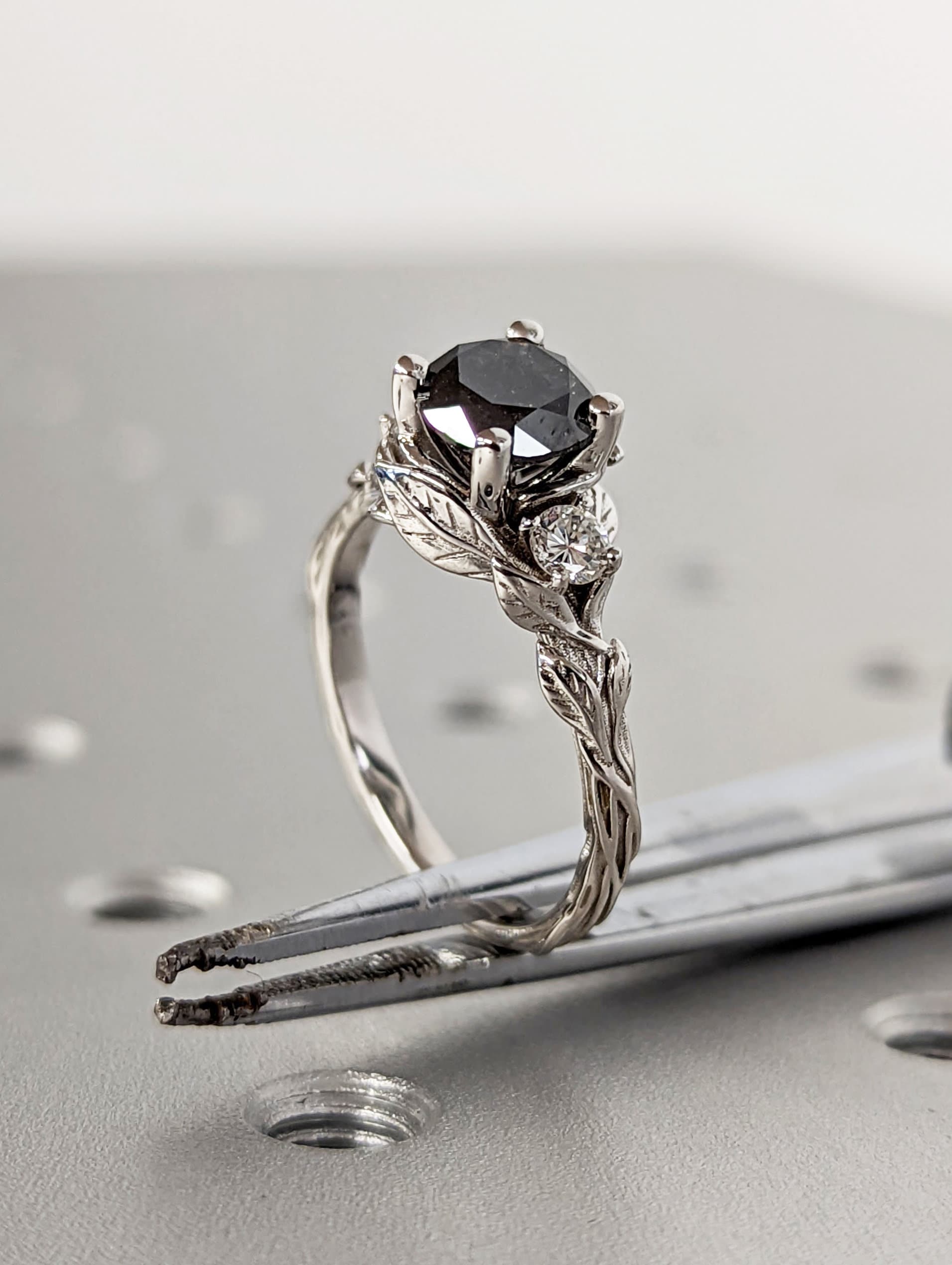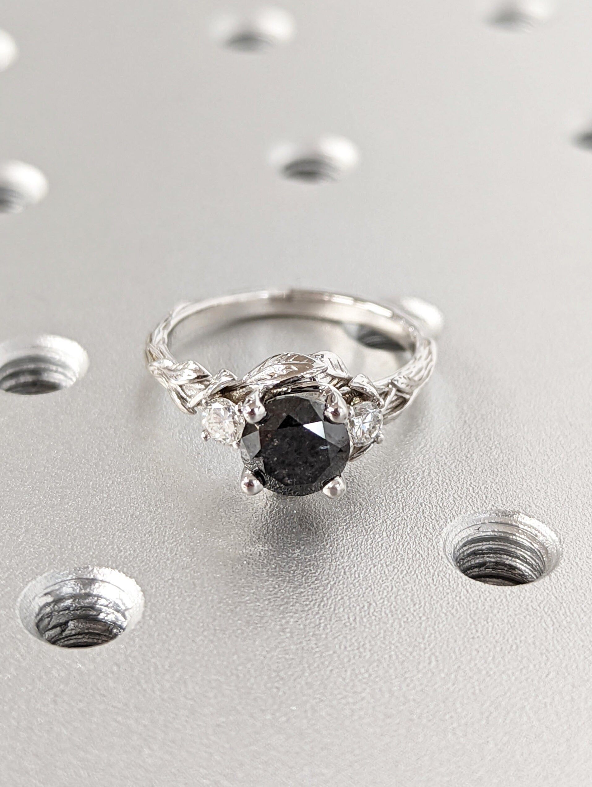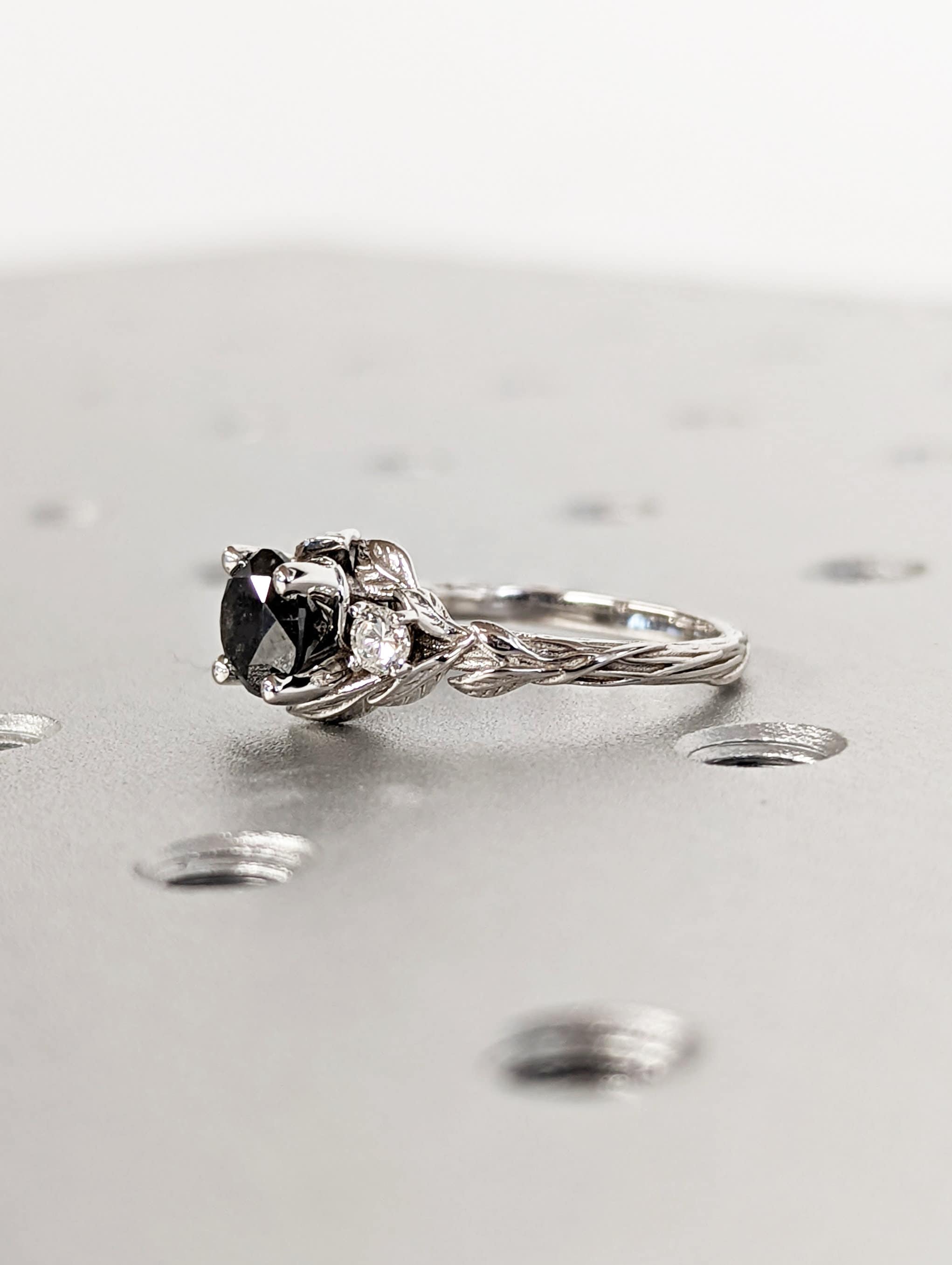 1.25 CT Salt and Pepper, Leaves Engagement Ring, 14K Gold and Diamond engagement ring, leaf ring, vintage ring, Alternative Engagement Ring
