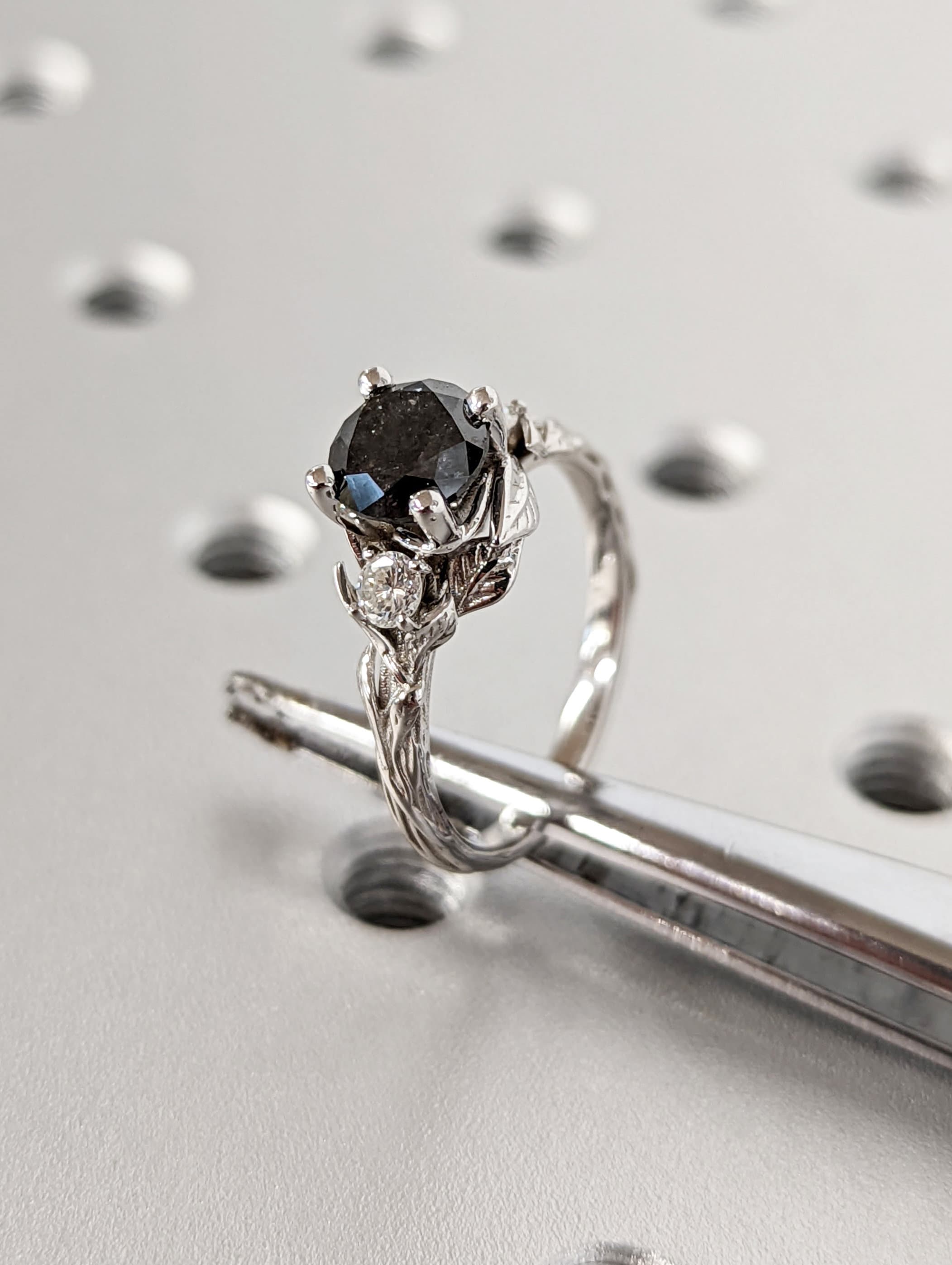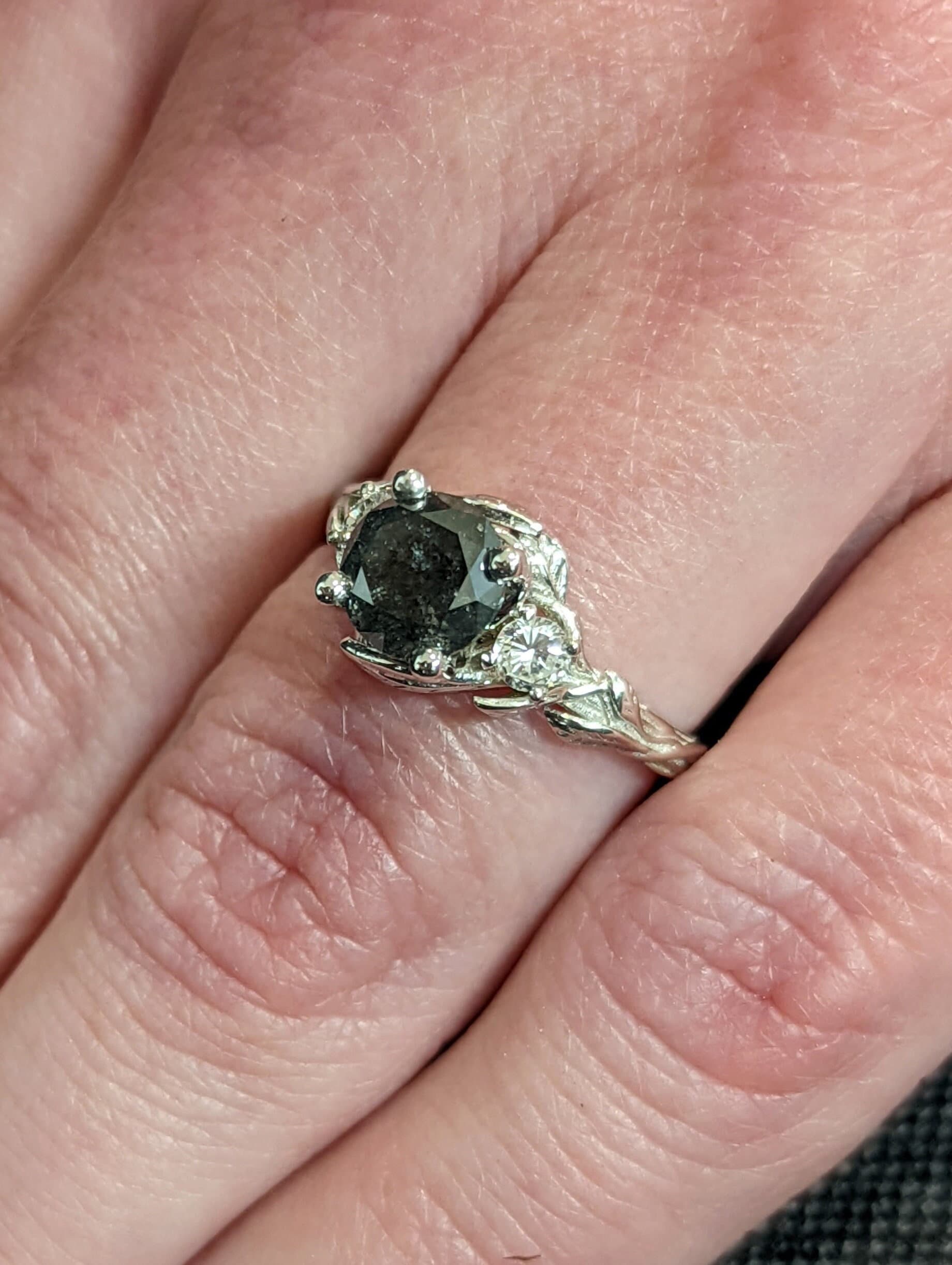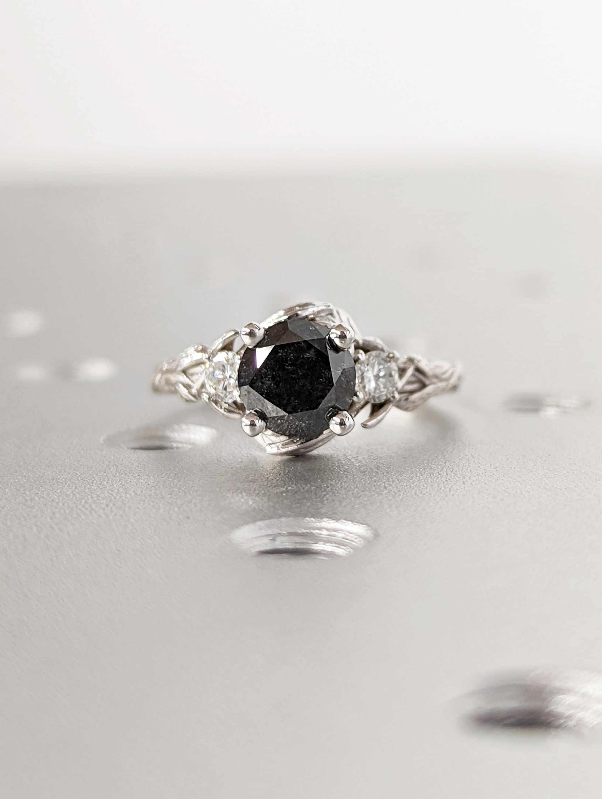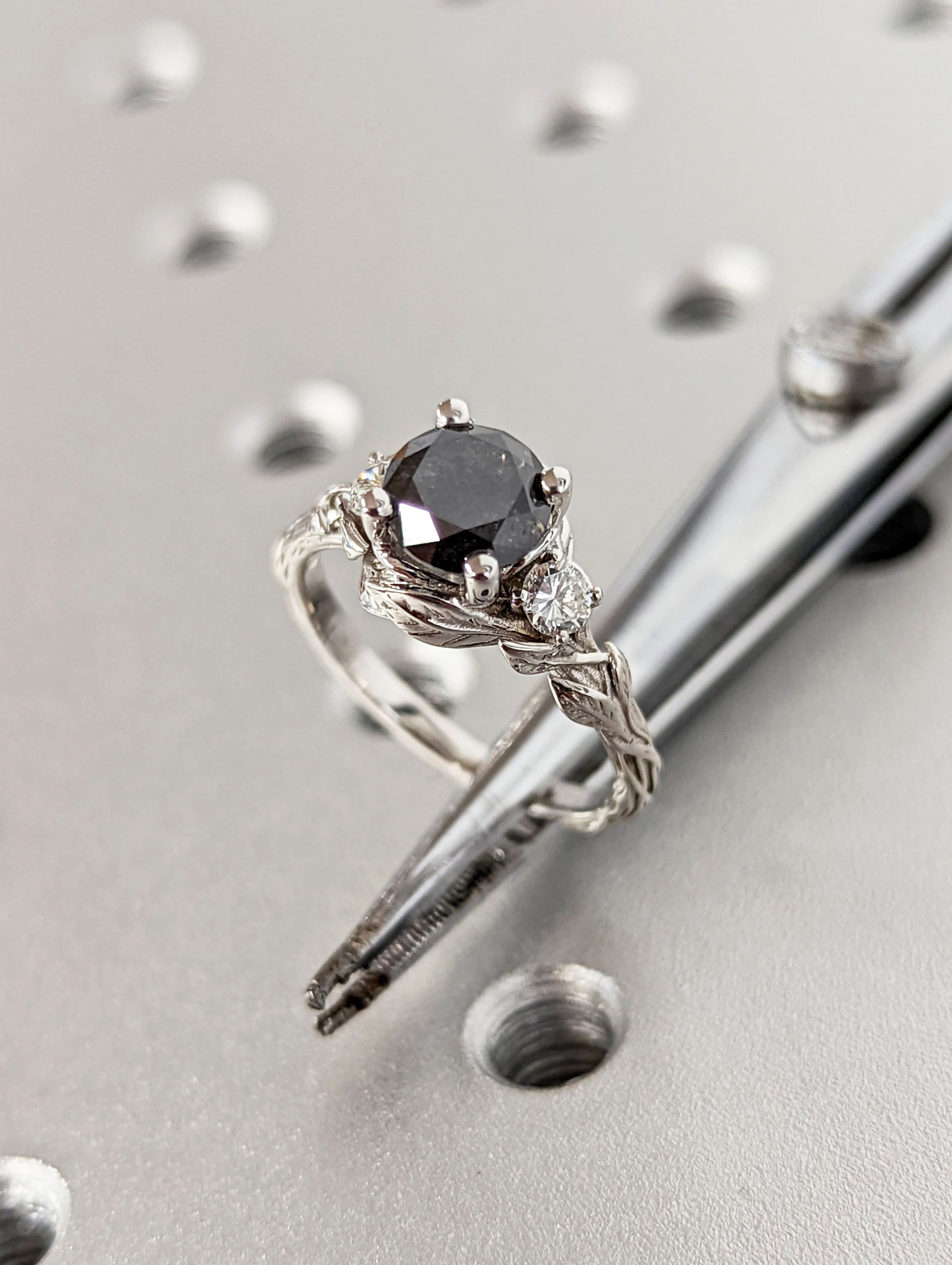 1.25 CT Salt and Pepper, Leaves Engagement Ring, 14K Gold and Diamond engagement ring, leaf ring, vintage ring, Alternative Engagement Ring