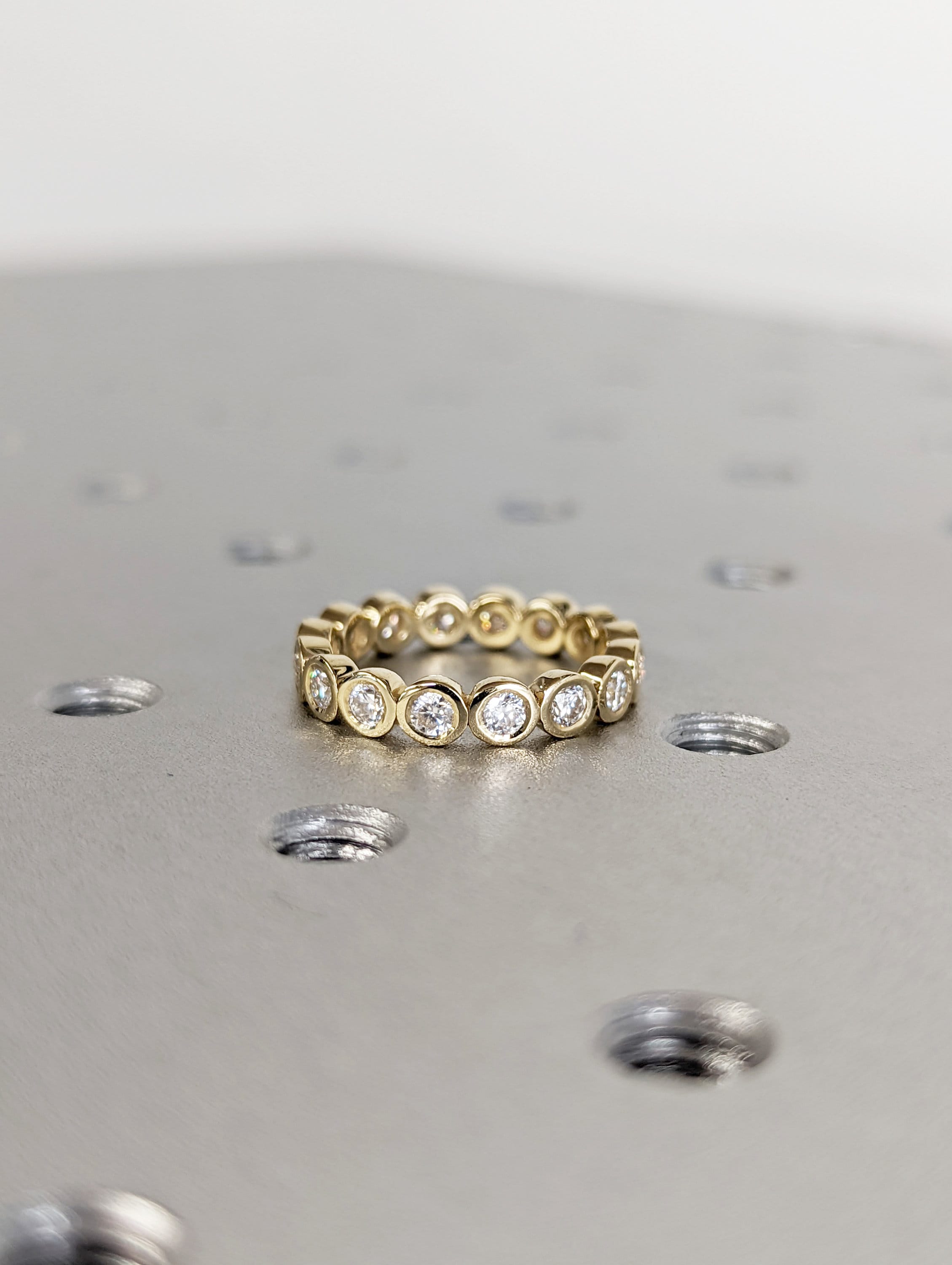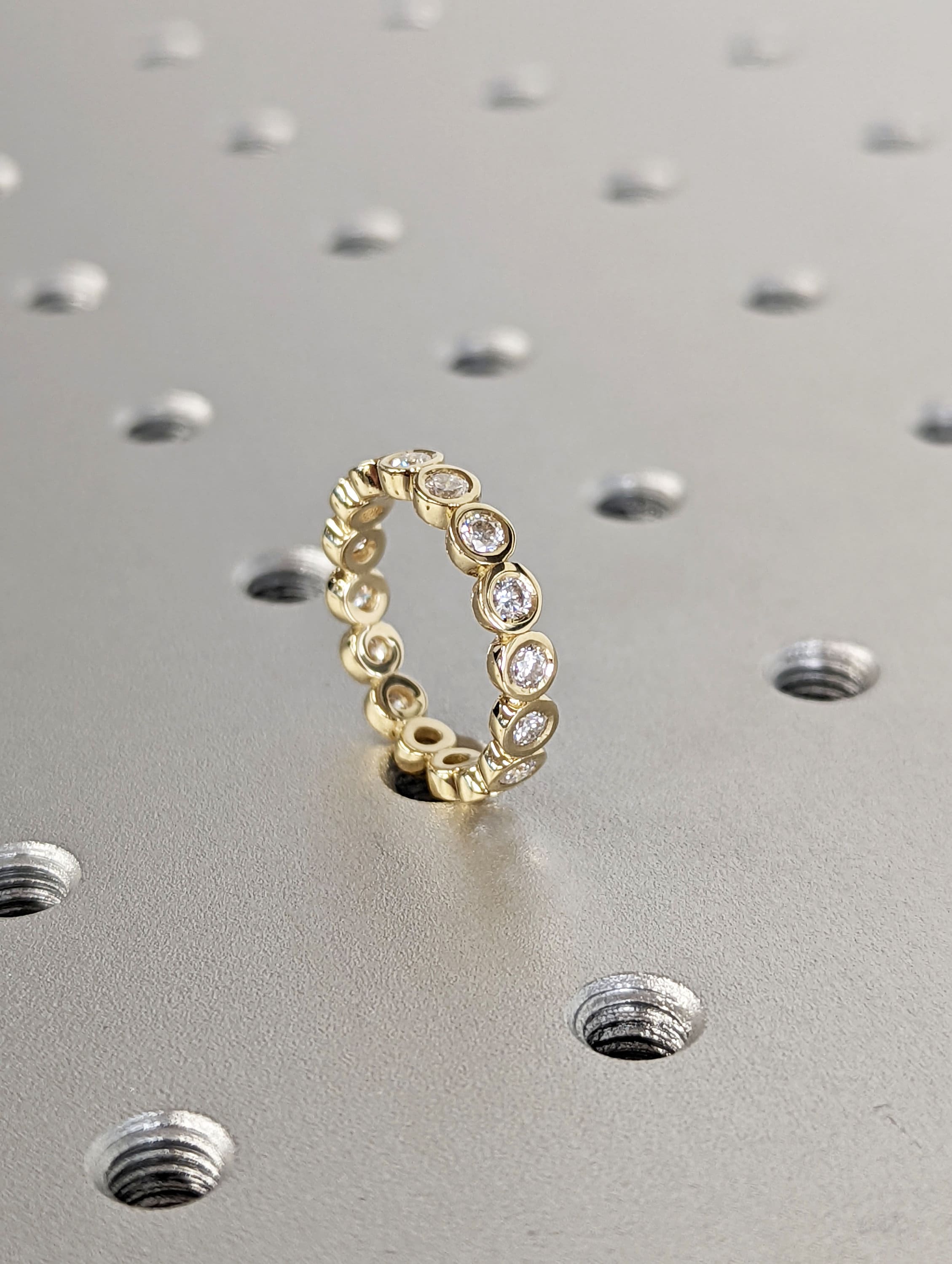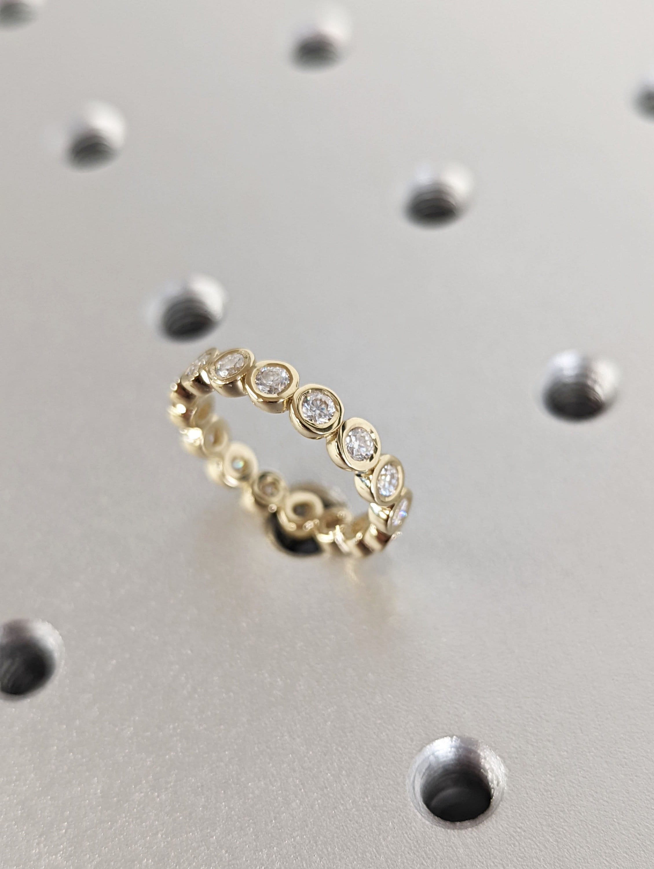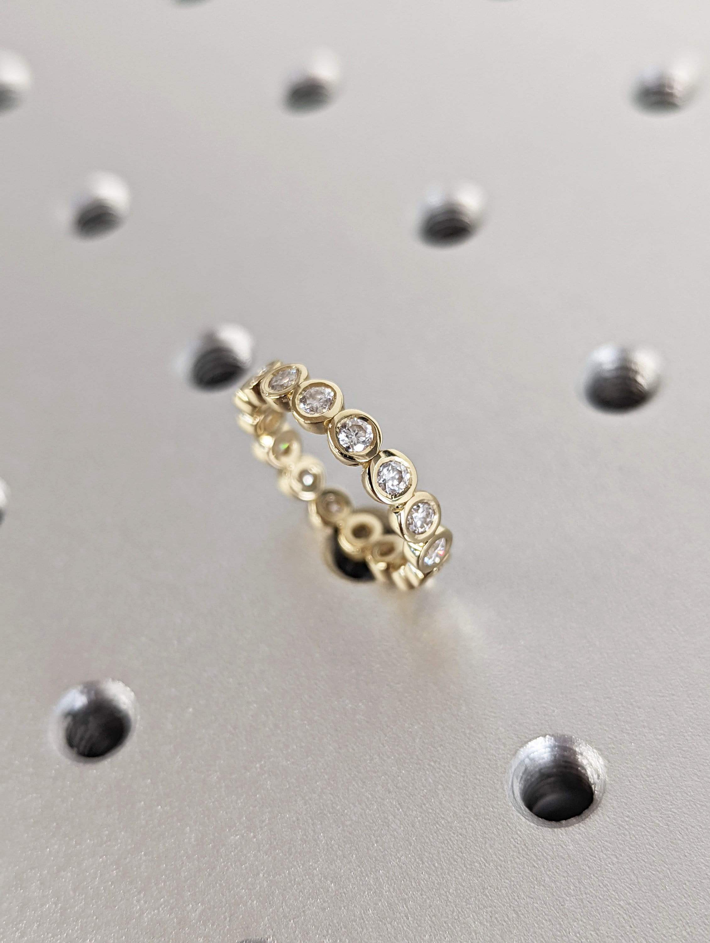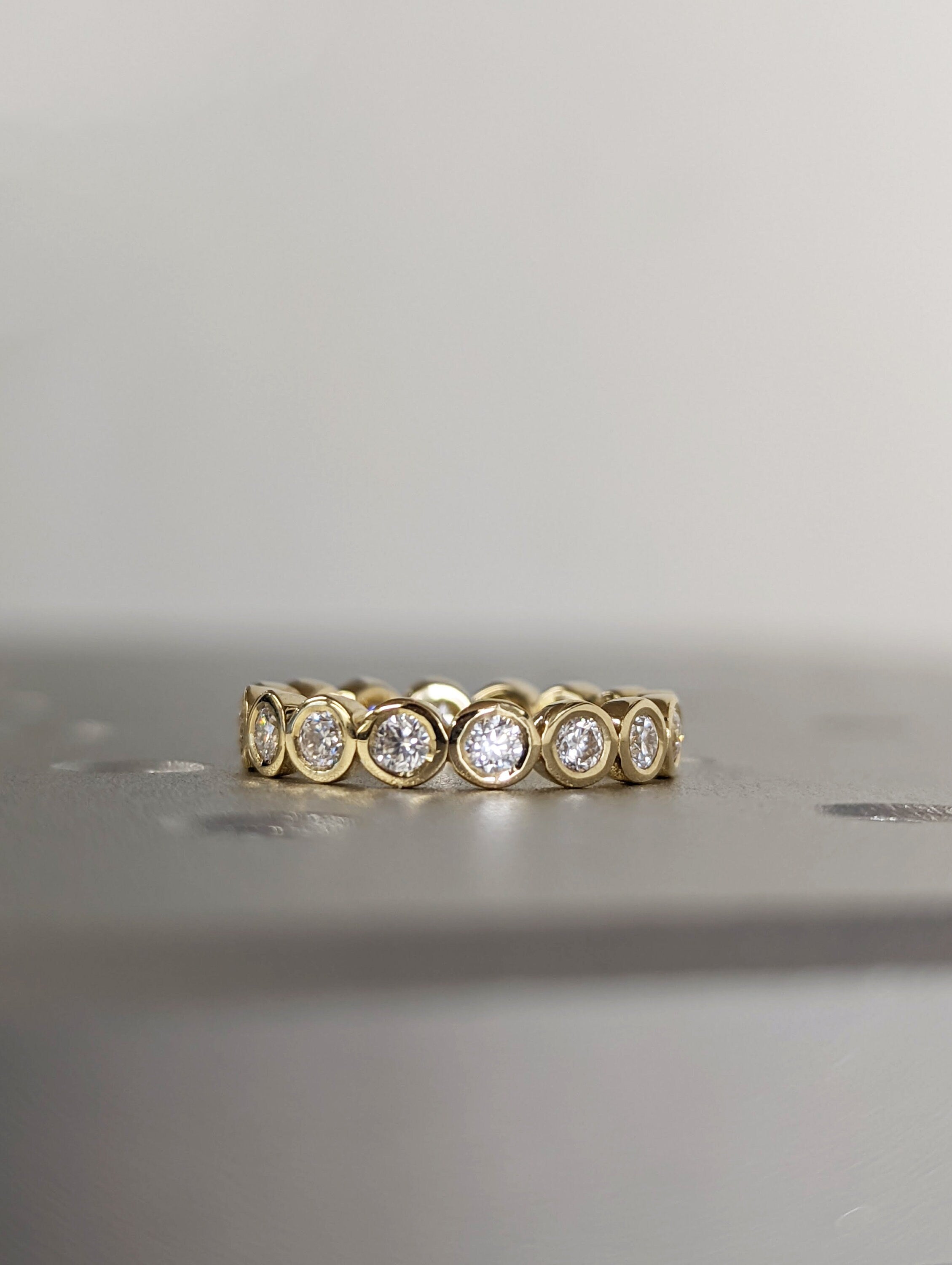 A bezel set round brilliant cut diamonds or moissanites ring, set with a dainty bezel for increased protection, this eternity ring is a must-have band, that can fill in every occasion; wedding , anniversary, or a gifted piece to cherish!