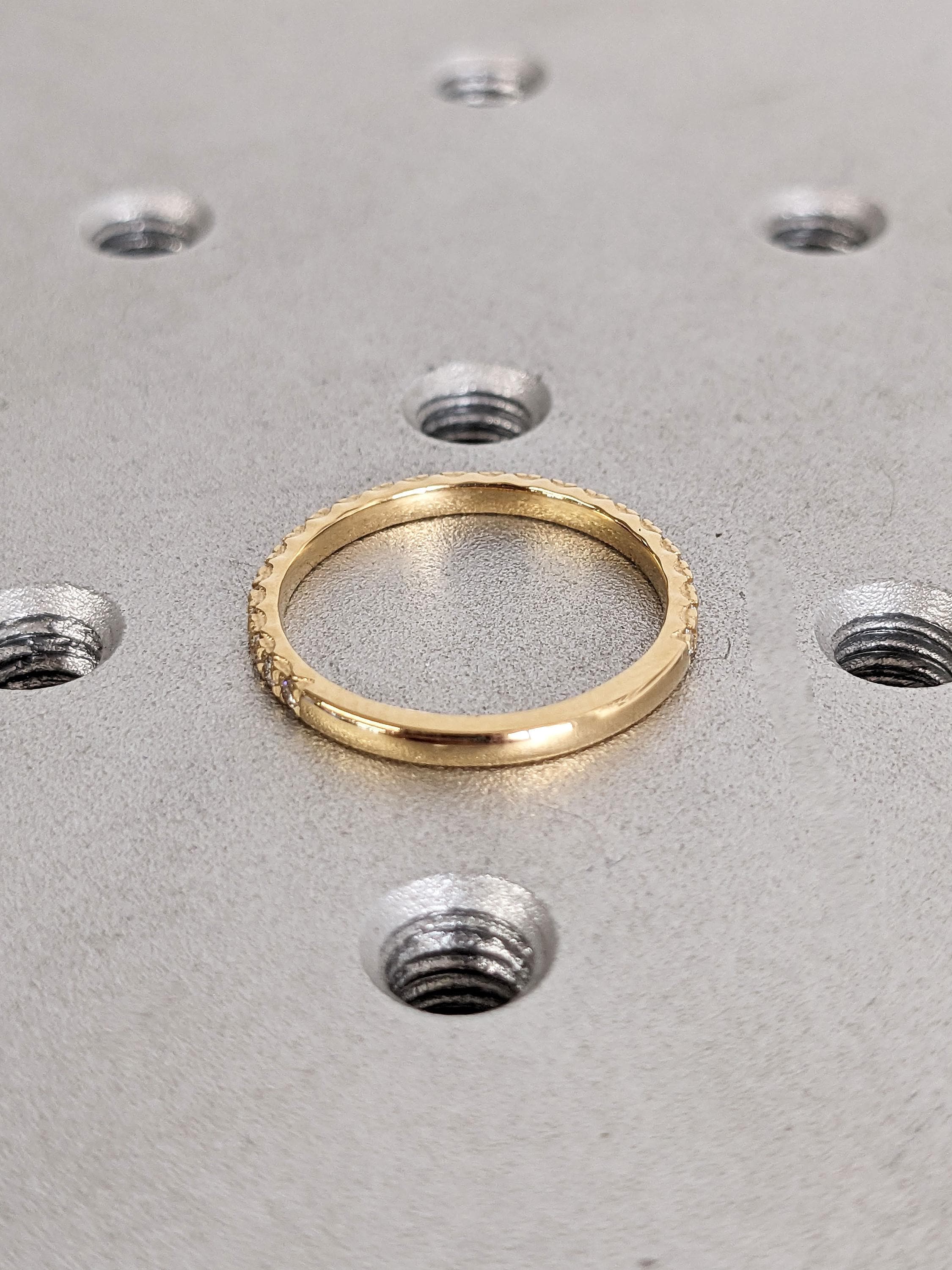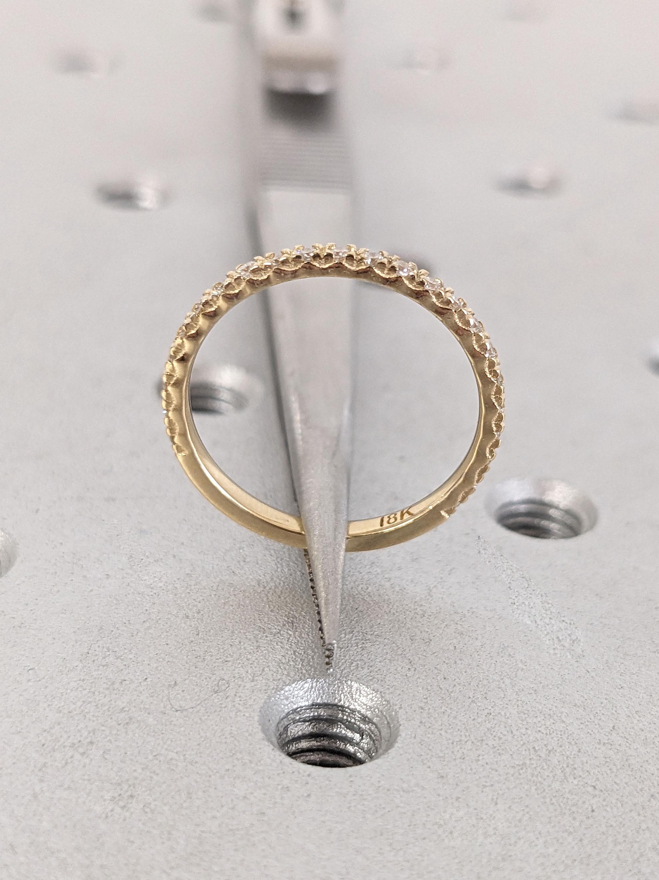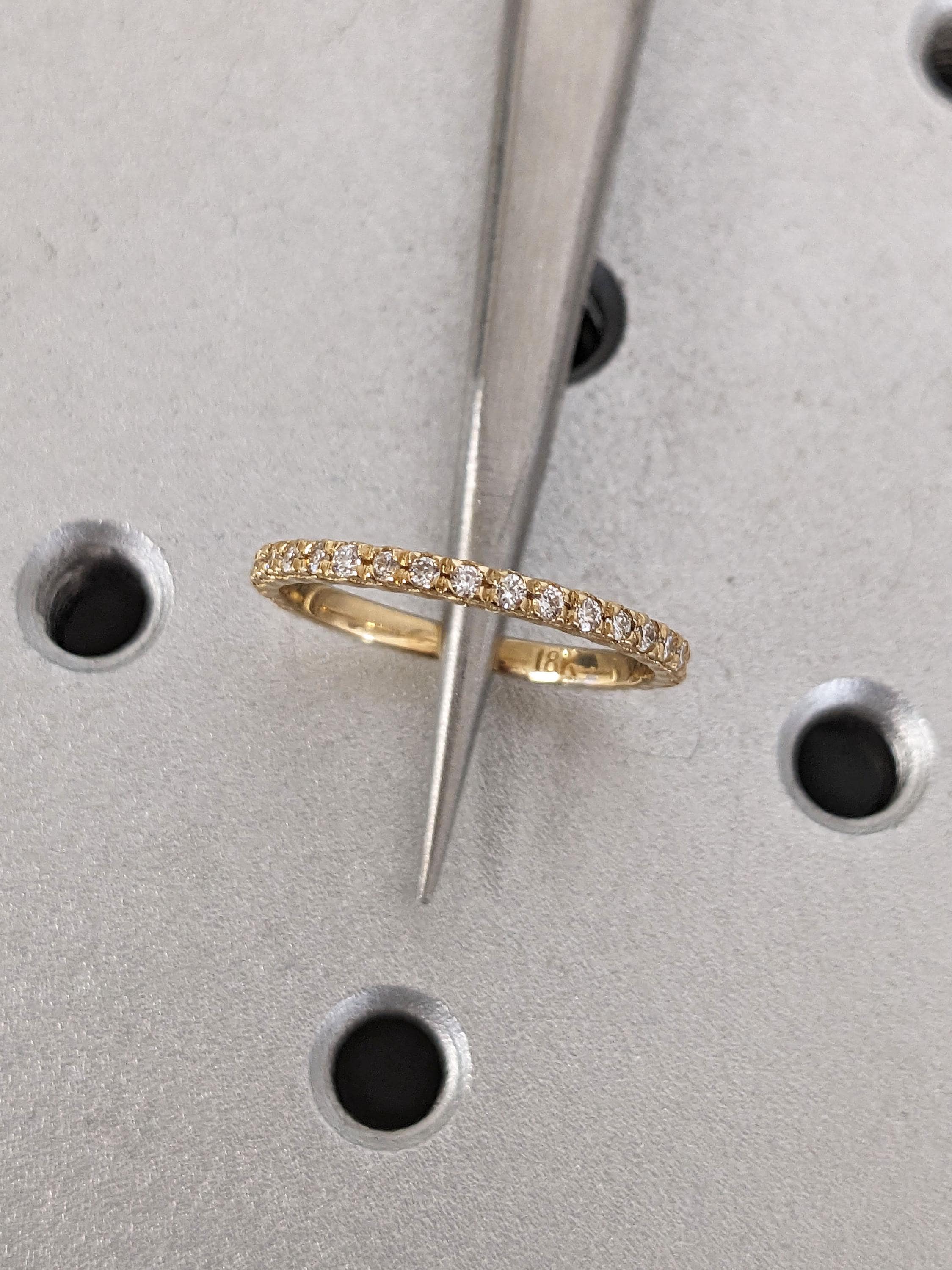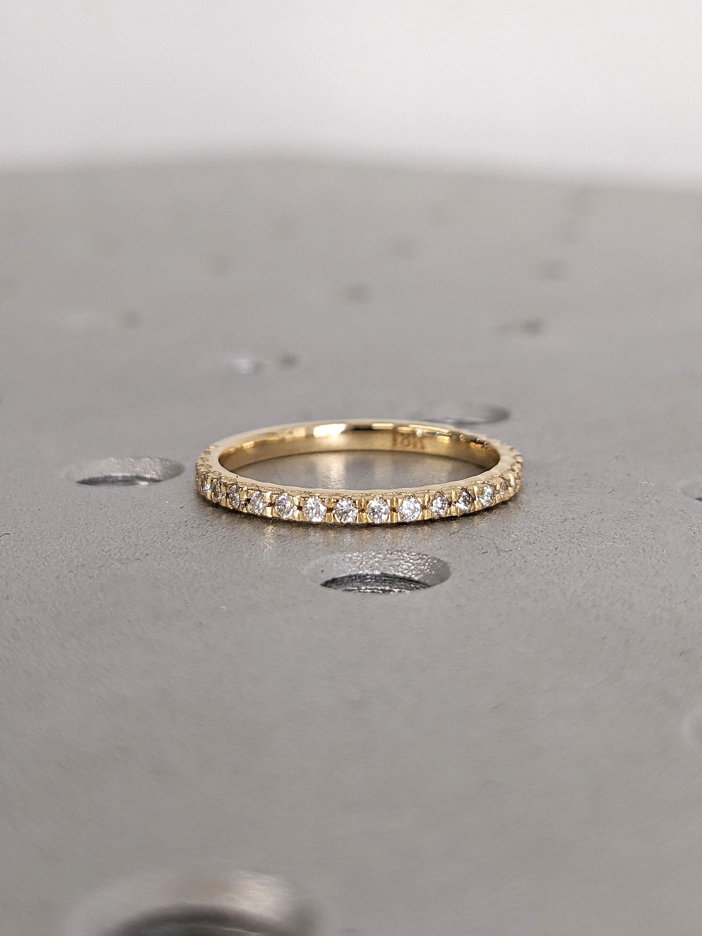 Sleek and versatile, this slim 1.8mm ring features pavé-set diamonds held by delicate shared prongs for a clean, continuous sparkle. Minimal on its own, effortlessly elegant in a stack, it’s designed to pair perfectly with an engagement ring or shine solo with understated brilliance.