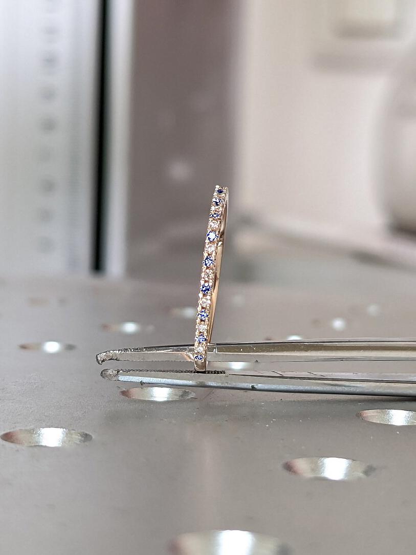 Timeless and dazzling, this dainty eternity ring of 1.4mm width, features alternating round cut natural Sapphire and Diamonds. Handmade with precision, it wears beautifully on its own, as well as a complementing stacking ring to our range of engagement rings.