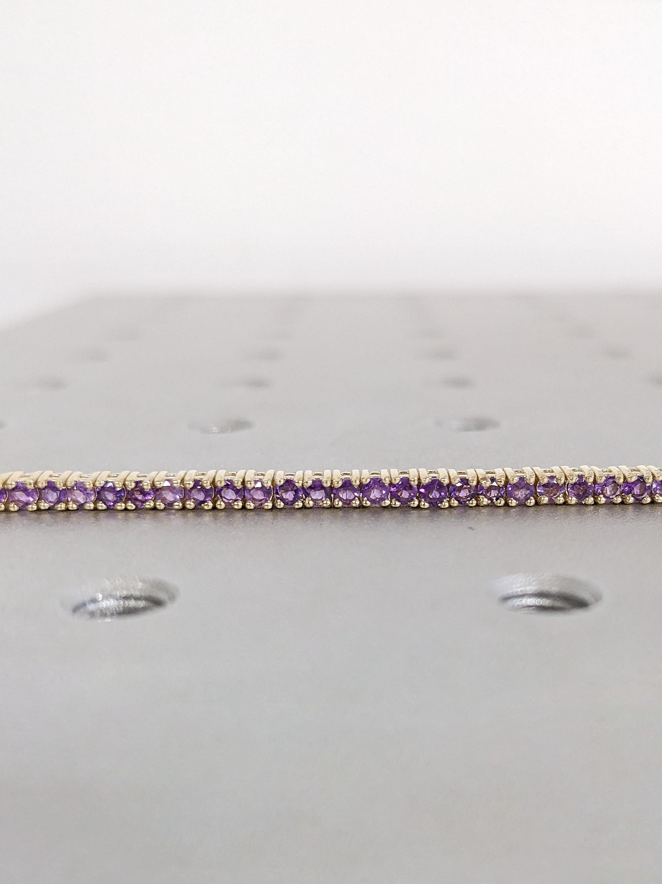Elevate your everyday elegance with this 2mm round natural amethyst tennis bracelet, meticulously crafted for those who appreciate subtle sparkle and spiritual meaning. Each amethyst gemstone is expertly prong-set, allowing maximum light to enter every facet, enhancing its natural violet glow while keeping the profile slim, refined, and comfortable for daily wear. Whether worn alone or layered with other bracelets, this understated yet luxurious piece adapts effortlessly to both casual and formal styles.