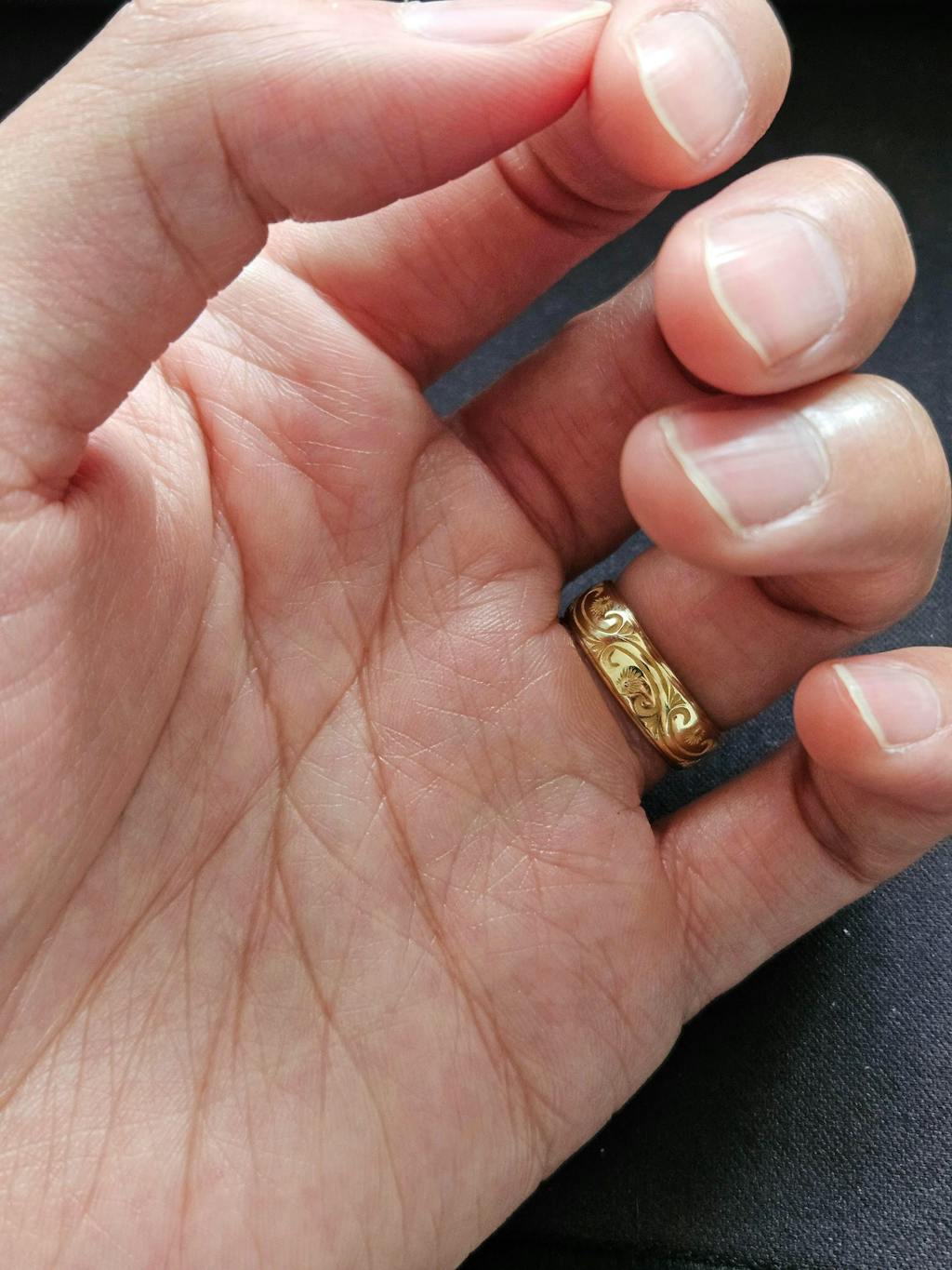 This hand made ring is crafted of the finest quality gold, This intricate ring is hand-engraved with florals that wrap around the sublime wedding band. Antique-style details echo patterns found in nature, producing in a refined, romantic piece.