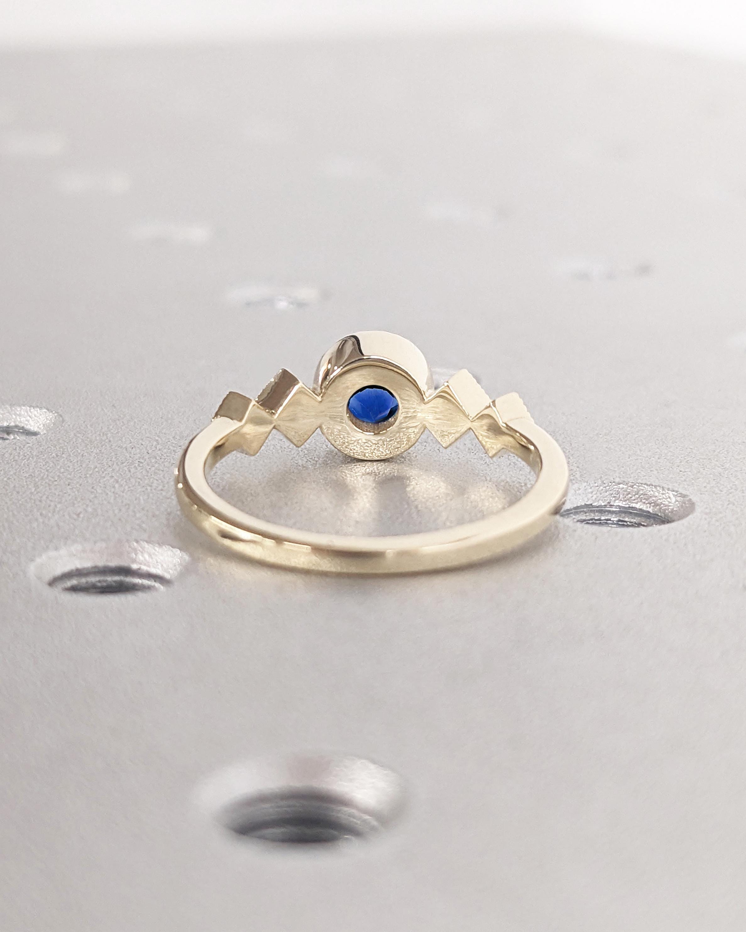 Designed for the alternative bride, this engagement ring combines vintage charm with contemporary style. The centerpiece of this five-stone ring is a dazzling round-cut lab sapphire, securely held in a round bezel setting with exquisite milgrain detail. The band is adorned with four round-cut side stones, also bezel-set with matching milgrain detailing. Choose from natural diamonds, lab diamonds, or moissanites for the side stones. This design is a beautiful harmony of shapes, making it an exceptional choice for a modern yet timeless engagement ring.